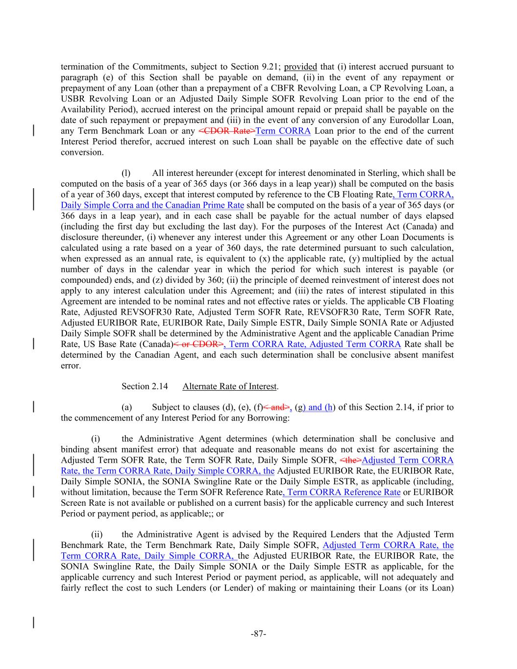 termination of the Commitments, subject to Section 9.21; provided that (i) interest accrued pursuant to paragraph (e) of this Section shall be payable on demand, (ii) in the event of any repayment or prepayment of any Loan (other than a prepayment of a CBFR Revolving Loan, a CP Revolving Loan, a USBR Revolving Loan or an Adjusted Daily Simple SOFR Revolving Loan prior to the end of the Availability Period), accrued interest on the principal amount repaid or prepaid shall be payable on the date of such repayment or prepayment and (iii) in the event of any conversion of any Eurodollar Loan, any Term Benchmark Loan or any <CDOR Rate>Term CORRA Loan prior to the end of the current Interest Period therefor, accrued interest on such Loan shall be payable on the effective date of such conversion. (l) All interest hereunder (except for interest denominated in Sterling, which shall be computed on the basis of a year of 365 days (or 366 days in a leap year)) shall be computed on the basis of a year of 360 days, except that interest computed by reference to the CB Floating Rate, Term CORRA, Daily Simple Corra and the Canadian Prime Rate shall be computed on the basis of a year of 365 days (or 366 days in a leap year), and in each case shall be payable for the actual number of days elapsed (including the first day but excluding the last day). For the purposes of the Interest Act (Canada) and disclosure thereunder, (i) whenever any interest under this Agreement or any other Loan Documents is calculated using a rate based on a year of 360 days, the rate determined pursuant to such calculation, when expressed as an annual rate, is equivalent to (x) the applicable rate, (y) multiplied by the actual number of days in the calendar year in which the period for which such interest is payable (or compounded) ends, and (z) divided by 360; (ii) the principle of deemed reinvestment of interest does not apply to any interest calculation under this Agreement; and (iii) the rates of interest stipulated in this Agreement are intended to be nominal rates and not effective rates or yields. The applicable CB Floating Rate, Adjusted REVSOFR30 Rate, Adjusted Term SOFR Rate, REVSOFR30 Rate, Term SOFR Rate, Adjusted EURIBOR Rate, EURIBOR Rate, Daily Simple ESTR, Daily Simple SONIA Rate or Adjusted Daily Simple SOFR shall be determined by the Administrative Agent and the applicable Canadian Prime Rate, US Base Rate (Canada)< or CDOR>, Term CORRA Rate, Adjusted Term CORRA Rate shall be determined by the Canadian Agent, and each such determination shall be conclusive absent manifest error. Section 2.14 Alternate Rate of Interest. (a) Subject to clauses (d), (e), (f)< and>, (g) and (h) of this Section 2.14, if prior to the commencement of any Interest Period for any Borrowing: (i) the Administrative Agent determines (which determination shall be conclusive and binding absent manifest error) that adequate and reasonable means do not exist for ascertaining the Adjusted Term SOFR Rate, the Term SOFR Rate, Daily Simple SOFR, <the>Adjusted Term CORRA Rate, the Term CORRA Rate, Daily Simple CORRA, the Adjusted EURIBOR Rate, the EURIBOR Rate, Daily Simple SONIA, the SONIA Swingline Rate or the Daily Simple ESTR, as applicable (including, without limitation, because the Term SOFR Reference Rate, Term CORRA Reference Rate or EURIBOR Screen Rate is not available or published on a current basis) for the applicable currency and such Interest Period or payment period, as applicable;; or (ii) the Administrative Agent is advised by the Required Lenders that the Adjusted Term Benchmark Rate, the Term Benchmark Rate, Daily Simple SOFR, Adjusted Term CORRA Rate, the Term CORRA Rate, Daily Simple CORRA, the Adjusted EURIBOR Rate, the EURIBOR Rate, the SONIA Swingline Rate, the Daily Simple SONIA or the Daily Simple ESTR as applicable, for the applicable currency and such Interest Period or payment period, as applicable, will not adequately and fairly reflect the cost to such Lenders (or Lender) of making or maintaining their Loans (or its Loan) -87-