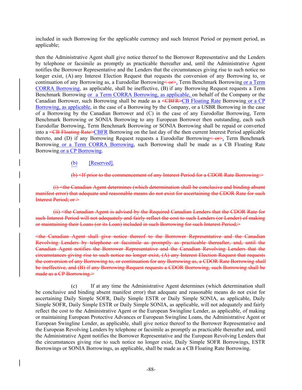 included in such Borrowing for the applicable currency and such Interest Period or payment period, as applicable; then the Administrative Agent shall give notice thereof to the Borrower Representative and the Lenders by telephone or facsimile as promptly as practicable thereafter and, until the Administrative Agent notifies the Borrower Representative and the Lenders that the circumstances giving rise to such notice no longer exist, (A) any Interest Election Request that requests the conversion of any Borrowing to, or continuation of any Borrowing as, a Eurodollar Borrowing< or>, Term Benchmark Borrowing or a Term CORRA Borrowing, as applicable, shall be ineffective, (B) if any Borrowing Request requests a Term Benchmark Borrowing or a Term CORRA Borrowing, as applicable, on behalf of the Company or the Canadian Borrower, such Borrowing shall be made as a <CBFR>CB Floating Rate Borrowing or a CP Borrowing, as applicable, in the case of a Borrowing by the Company, or a USBR Borrowing in the case of a Borrowing by the Canadian Borrower and (C) in the case of any Eurodollar Borrowing, Term Benchmark Borrowing or SONIA Borrowing to any European Borrower then outstanding, each such Eurodollar Borrowing, Term Benchmark Borrowing or SONIA Borrowing shall be repaid or converted into a <CB Floating Rate>CBFR Borrowing on the last day of the then current Interest Period applicable thereto, and (D) if any Borrowing Request requests a Eurodollar Borrowing< or>, Term Benchmark Borrowing or a Term CORRA Borrowing, such Borrowing shall be made as a CB Floating Rate Borrowing or a CP Borrowing. (b) [Reserved]. (b) <If prior to the commencement of any Interest Period for a CDOR Rate Borrowing:> (i) <the Canadian Agent determines (which determination shall be conclusive and binding absent manifest error) that adequate and reasonable means do not exist for ascertaining the CDOR Rate for such Interest Period; or > (ii) <the Canadian Agent is advised by the Required Canadian Lenders that the CDOR Rate for such Interest Period will not adequately and fairly reflect the cost to such Lenders (or Lender) of making or maintaining their Loans (or its Loan) included in such Borrowing for such Interest Period;> <the Canadian Agent shall give notice thereof to the Borrower Representative and the Canadian Revolving Lenders by telephone or facsimile as promptly as practicable thereafter, and, until the Canadian Agent notifies the Borrower Representative and the Canadian Revolving Lenders that the circumstances giving rise to such notice no longer exist, (A) any Interest Election Request that requests the conversion of any Borrowing to, or continuation for any Borrowing as, a CDOR Rate Borrowing shall be ineffective, and (B) if any Borrowing Request requests a CDOR Borrowing, such Borrowing shall be made as a CP Borrowing.> (c) If at any time the Administrative Agent determines (which determination shall be conclusive and binding absent manifest error) that adequate and reasonable means do not exist for ascertaining Daily Simple SOFR, Daily Simple ESTR or Daily Simple SONIA, as applicable, Daily Simple SOFR, Daily Simple ESTR or Daily Simple SONIA, as applicable, will not adequately and fairly reflect the cost to the Administrative Agent or the European Swingline Lender, as applicable, of making or maintaining European Protective Advances or European Swingline Loans, the Administrative Agent or European Swingline Lender, as applicable, shall give notice thereof to the Borrower Representative and the European Revolving Lenders by telephone or facsimile as promptly as practicable thereafter and, until the Administrative Agent notifies the Borrower Representative and the European Revolving Lenders that the circumstances giving rise to such notice no longer exist, Daily Simple SOFR Borrowings, ESTR Borrowings or SONIA Borrowings, as applicable, shall be made as a CB Floating Rate Borrowing. -88-