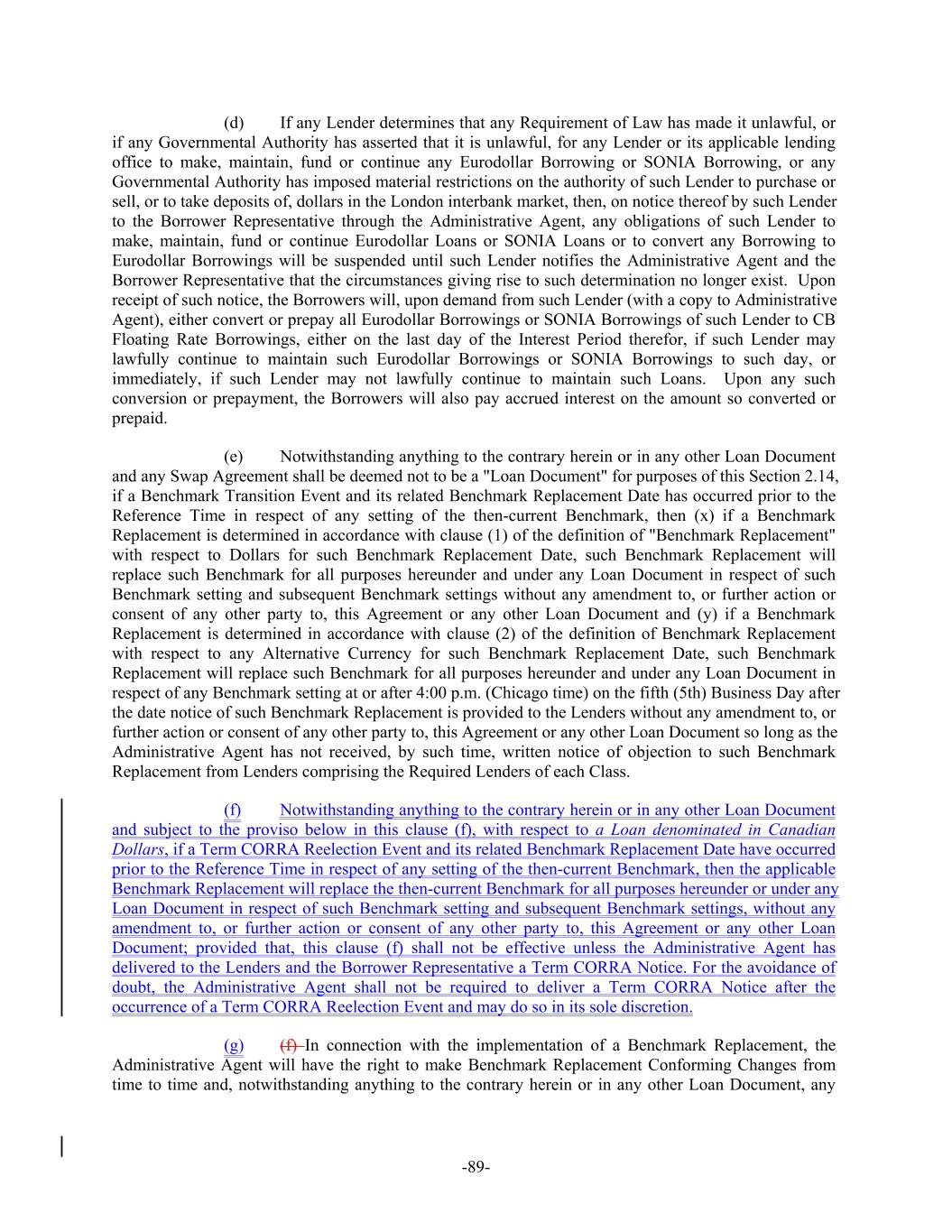 (d) If any Lender determines that any Requirement of Law has made it unlawful, or if any Governmental Authority has asserted that it is unlawful, for any Lender or its applicable lending office to make, maintain, fund or continue any Eurodollar Borrowing or SONIA Borrowing, or any Governmental Authority has imposed material restrictions on the authority of such Lender to purchase or sell, or to take deposits of, dollars in the London interbank market, then, on notice thereof by such Lender to the Borrower Representative through the Administrative Agent, any obligations of such Lender to make, maintain, fund or continue Eurodollar Loans or SONIA Loans or to convert any Borrowing to Eurodollar Borrowings will be suspended until such Lender notifies the Administrative Agent and the Borrower Representative that the circumstances giving rise to such determination no longer exist. Upon receipt of such notice, the Borrowers will, upon demand from such Lender (with a copy to Administrative Agent), either convert or prepay all Eurodollar Borrowings or SONIA Borrowings of such Lender to CB Floating Rate Borrowings, either on the last day of the Interest Period therefor, if such Lender may lawfully continue to maintain such Eurodollar Borrowings or SONIA Borrowings to such day, or immediately, if such Lender may not lawfully continue to maintain such Loans. Upon any such conversion or prepayment, the Borrowers will also pay accrued interest on the amount so converted or prepaid. (e) Notwithstanding anything to the contrary herein or in any other Loan Document and any Swap Agreement shall be deemed not to be a "Loan Document" for purposes of this Section 2.14, if a Benchmark Transition Event and its related Benchmark Replacement Date has occurred prior to the Reference Time in respect of any setting of the then-current Benchmark, then (x) if a Benchmark Replacement is determined in accordance with clause (1) of the definition of "Benchmark Replacement" with respect to Dollars for such Benchmark Replacement Date, such Benchmark Replacement will replace such Benchmark for all purposes hereunder and under any Loan Document in respect of such Benchmark setting and subsequent Benchmark settings without any amendment to, or further action or consent of any other party to, this Agreement or any other Loan Document and (y) if a Benchmark Replacement is determined in accordance with clause (2) of the definition of Benchmark Replacement with respect to any Alternative Currency for such Benchmark Replacement Date, such Benchmark Replacement will replace such Benchmark for all purposes hereunder and under any Loan Document in respect of any Benchmark setting at or after 4:00 p.m. (Chicago time) on the fifth (5th) Business Day after the date notice of such Benchmark Replacement is provided to the Lenders without any amendment to, or further action or consent of any other party to, this Agreement or any other Loan Document so long as the Administrative Agent has not received, by such time, written notice of objection to such Benchmark Replacement from Lenders comprising the Required Lenders of each Class. (f) Notwithstanding anything to the contrary herein or in any other Loan Document and subject to the proviso below in this clause (f), with respect to a Loan denominated in Canadian Dollars, if a Term CORRA Reelection Event and its related Benchmark Replacement Date have occurred prior to the Reference Time in respect of any setting of the then-current Benchmark, then the applicable Benchmark Replacement will replace the then-current Benchmark for all purposes hereunder or under any Loan Document in respect of such Benchmark setting and subsequent Benchmark settings, without any amendment to, or further action or consent of any other party to, this Agreement or any other Loan Document; provided that, this clause (f) shall not be effective unless the Administrative Agent has delivered to the Lenders and the Borrower Representative a Term CORRA Notice. For the avoidance of doubt, the Administrative Agent shall not be required to deliver a Term CORRA Notice after the occurrence of a Term CORRA Reelection Event and may do so in its sole discretion. (g) (f) In connection with the implementation of a Benchmark Replacement, the Administrative Agent will have the right to make Benchmark Replacement Conforming Changes from time to time and, notwithstanding anything to the contrary herein or in any other Loan Document, any -89-