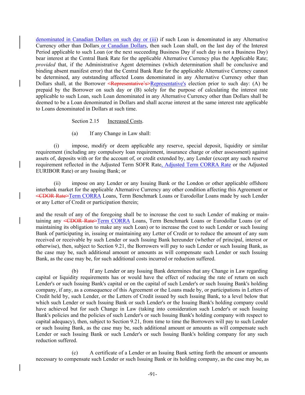 denominated in Canadian Dollars on such day or (iii) if such Loan is denominated in any Alternative Currency other than Dollars or Canadian Dollars, then such Loan shall, on the last day of the Interest Period applicable to such Loan (or the next succeeding Business Day if such day is not a Business Day) bear interest at the Central Bank Rate for the applicable Alternative Currency plus the Applicable Rate; provided that, if the Administrative Agent determines (which determination shall be conclusive and binding absent manifest error) that the Central Bank Rate for the applicable Alternative Currency cannot be determined, any outstanding affected Loans denominated in any Alternative Currency other than Dollars shall, at the Borrower <Representative’s>Representative's election prior to such day: (A) be prepaid by the Borrower on such day or (B) solely for the purpose of calculating the interest rate applicable to such Loan, such Loan denominated in any Alternative Currency other than Dollars shall be deemed to be a Loan denominated in Dollars and shall accrue interest at the same interest rate applicable to Loans denominated in Dollars at such time. Section 2.15 Increased Costs. (a) If any Change in Law shall: (i) impose, modify or deem applicable any reserve, special deposit, liquidity or similar requirement (including any compulsory loan requirement, insurance charge or other assessment) against assets of, deposits with or for the account of, or credit extended by, any Lender (except any such reserve requirement reflected in the Adjusted Term SOFR Rate, Adjusted Term CORRA Rate or the Adjusted EURIBOR Rate) or any Issuing Bank; or (ii) impose on any Lender or any Issuing Bank or the London or other applicable offshore interbank market for the applicable Alternative Currency any other condition affecting this Agreement or <CDOR Rate>Term CORRA Loans, Term Benchmark Loans or Eurodollar Loans made by such Lender or any Letter of Credit or participation therein; and the result of any of the foregoing shall be to increase the cost to such Lender of making or main- taining any <CDOR Rate>Term CORRA Loans, Term Benchmark Loans or Eurodollar Loans (or of maintaining its obligation to make any such Loan) or to increase the cost to such Lender or such Issuing Bank of participating in, issuing or maintaining any Letter of Credit or to reduce the amount of any sum received or receivable by such Lender or such Issuing Bank hereunder (whether of principal, interest or otherwise), then, subject to Section 9.21, the Borrowers will pay to such Lender or such Issuing Bank, as the case may be, such additional amount or amounts as will compensate such Lender or such Issuing Bank, as the case may be, for such additional costs incurred or reduction suffered. (b) If any Lender or any Issuing Bank determines that any Change in Law regarding capital or liquidity requirements has or would have the effect of reducing the rate of return on such Lender's or such Issuing Bank's capital or on the capital of such Lender's or such Issuing Bank's holding company, if any, as a consequence of this Agreement or the Loans made by, or participations in Letters of Credit held by, such Lender, or the Letters of Credit issued by such Issuing Bank, to a level below that which such Lender or such Issuing Bank or such Lender's or the Issuing Bank's holding company could have achieved but for such Change in Law (taking into consideration such Lender's or such Issuing Bank's policies and the policies of such Lender's or such Issuing Bank's holding company with respect to capital adequacy), then, subject to Section 9.21, from time to time the Borrowers will pay to such Lender or such Issuing Bank, as the case may be, such additional amount or amounts as will compensate such Lender or such Issuing Bank or such Lender's or such Issuing Bank's holding company for any such reduction suffered. (c) A certificate of a Lender or an Issuing Bank setting forth the amount or amounts necessary to compensate such Lender or such Issuing Bank or its holding company, as the case may be, as -91-