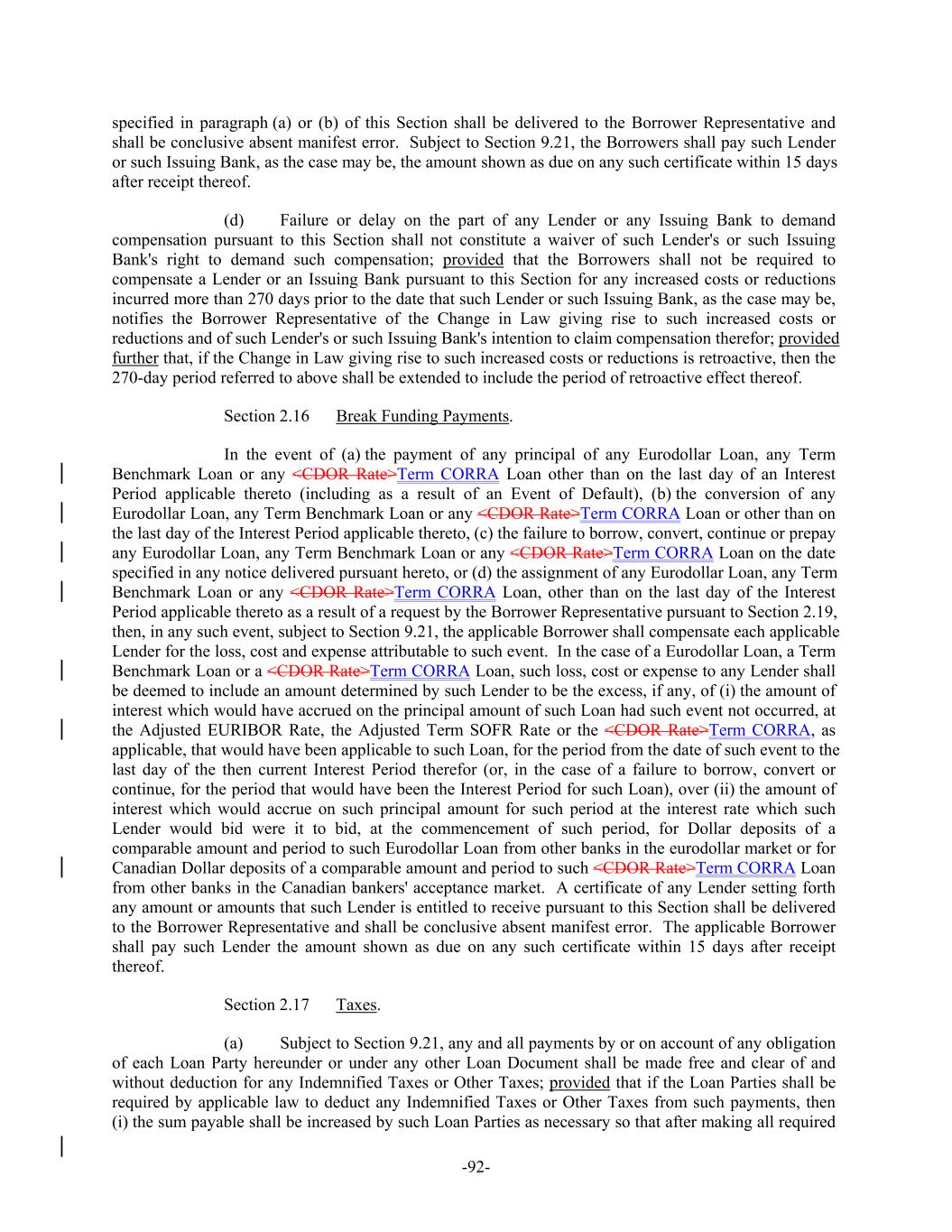 specified in paragraph (a) or (b) of this Section shall be delivered to the Borrower Representative and shall be conclusive absent manifest error. Subject to Section 9.21, the Borrowers shall pay such Lender or such Issuing Bank, as the case may be, the amount shown as due on any such certificate within 15 days after receipt thereof. (d) Failure or delay on the part of any Lender or any Issuing Bank to demand compensation pursuant to this Section shall not constitute a waiver of such Lender's or such Issuing Bank's right to demand such compensation; provided that the Borrowers shall not be required to compensate a Lender or an Issuing Bank pursuant to this Section for any increased costs or reductions incurred more than 270 days prior to the date that such Lender or such Issuing Bank, as the case may be, notifies the Borrower Representative of the Change in Law giving rise to such increased costs or reductions and of such Lender's or such Issuing Bank's intention to claim compensation therefor; provided further that, if the Change in Law giving rise to such increased costs or reductions is retroactive, then the 270-day period referred to above shall be extended to include the period of retroactive effect thereof. Section 2.16 Break Funding Payments. In the event of (a) the payment of any principal of any Eurodollar Loan, any Term Benchmark Loan or any <CDOR Rate>Term CORRA Loan other than on the last day of an Interest Period applicable thereto (including as a result of an Event of Default), (b) the conversion of any Eurodollar Loan, any Term Benchmark Loan or any <CDOR Rate>Term CORRA Loan or other than on the last day of the Interest Period applicable thereto, (c) the failure to borrow, convert, continue or prepay any Eurodollar Loan, any Term Benchmark Loan or any <CDOR Rate>Term CORRA Loan on the date specified in any notice delivered pursuant hereto, or (d) the assignment of any Eurodollar Loan, any Term Benchmark Loan or any <CDOR Rate>Term CORRA Loan, other than on the last day of the Interest Period applicable thereto as a result of a request by the Borrower Representative pursuant to Section 2.19, then, in any such event, subject to Section 9.21, the applicable Borrower shall compensate each applicable Lender for the loss, cost and expense attributable to such event. In the case of a Eurodollar Loan, a Term Benchmark Loan or a <CDOR Rate>Term CORRA Loan, such loss, cost or expense to any Lender shall be deemed to include an amount determined by such Lender to be the excess, if any, of (i) the amount of interest which would have accrued on the principal amount of such Loan had such event not occurred, at the Adjusted EURIBOR Rate, the Adjusted Term SOFR Rate or the <CDOR Rate>Term CORRA, as applicable, that would have been applicable to such Loan, for the period from the date of such event to the last day of the then current Interest Period therefor (or, in the case of a failure to borrow, convert or continue, for the period that would have been the Interest Period for such Loan), over (ii) the amount of interest which would accrue on such principal amount for such period at the interest rate which such Lender would bid were it to bid, at the commencement of such period, for Dollar deposits of a comparable amount and period to such Eurodollar Loan from other banks in the eurodollar market or for Canadian Dollar deposits of a comparable amount and period to such <CDOR Rate>Term CORRA Loan from other banks in the Canadian bankers' acceptance market. A certificate of any Lender setting forth any amount or amounts that such Lender is entitled to receive pursuant to this Section shall be delivered to the Borrower Representative and shall be conclusive absent manifest error. The applicable Borrower shall pay such Lender the amount shown as due on any such certificate within 15 days after receipt thereof. Section 2.17 Taxes. (a) Subject to Section 9.21, any and all payments by or on account of any obligation of each Loan Party hereunder or under any other Loan Document shall be made free and clear of and without deduction for any Indemnified Taxes or Other Taxes; provided that if the Loan Parties shall be required by applicable law to deduct any Indemnified Taxes or Other Taxes from such payments, then (i) the sum payable shall be increased by such Loan Parties as necessary so that after making all required -92-