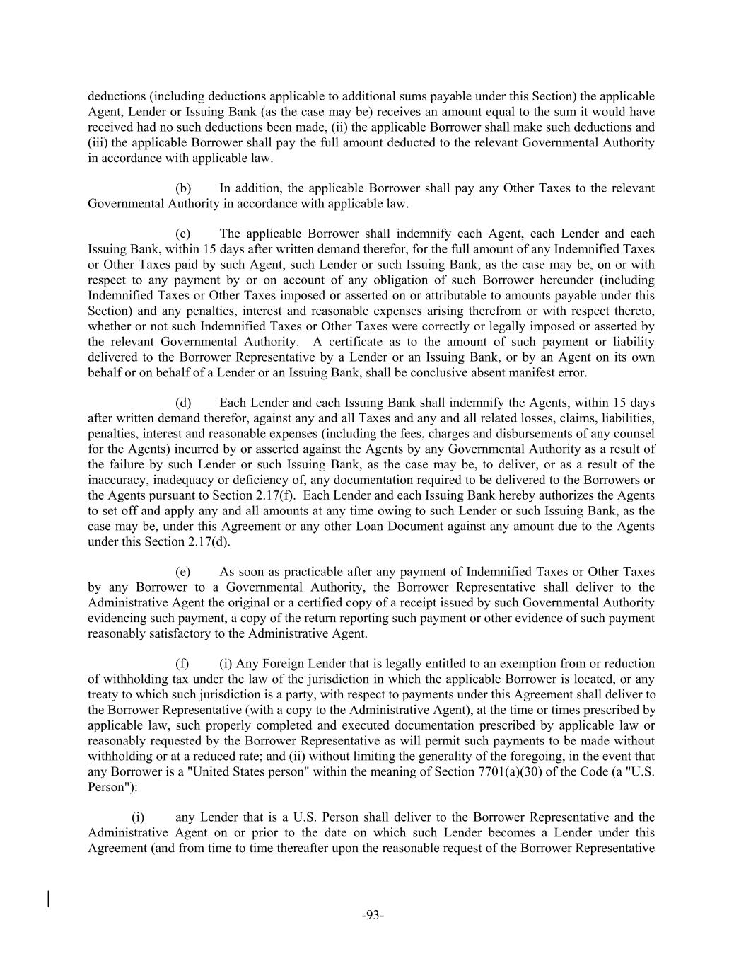 deductions (including deductions applicable to additional sums payable under this Section) the applicable Agent, Lender or Issuing Bank (as the case may be) receives an amount equal to the sum it would have received had no such deductions been made, (ii) the applicable Borrower shall make such deductions and (iii) the applicable Borrower shall pay the full amount deducted to the relevant Governmental Authority in accordance with applicable law. (b) In addition, the applicable Borrower shall pay any Other Taxes to the relevant Governmental Authority in accordance with applicable law. (c) The applicable Borrower shall indemnify each Agent, each Lender and each Issuing Bank, within 15 days after written demand therefor, for the full amount of any Indemnified Taxes or Other Taxes paid by such Agent, such Lender or such Issuing Bank, as the case may be, on or with respect to any payment by or on account of any obligation of such Borrower hereunder (including Indemnified Taxes or Other Taxes imposed or asserted on or attributable to amounts payable under this Section) and any penalties, interest and reasonable expenses arising therefrom or with respect thereto, whether or not such Indemnified Taxes or Other Taxes were correctly or legally imposed or asserted by the relevant Governmental Authority. A certificate as to the amount of such payment or liability delivered to the Borrower Representative by a Lender or an Issuing Bank, or by an Agent on its own behalf or on behalf of a Lender or an Issuing Bank, shall be conclusive absent manifest error. (d) Each Lender and each Issuing Bank shall indemnify the Agents, within 15 days after written demand therefor, against any and all Taxes and any and all related losses, claims, liabilities, penalties, interest and reasonable expenses (including the fees, charges and disbursements of any counsel for the Agents) incurred by or asserted against the Agents by any Governmental Authority as a result of the failure by such Lender or such Issuing Bank, as the case may be, to deliver, or as a result of the inaccuracy, inadequacy or deficiency of, any documentation required to be delivered to the Borrowers or the Agents pursuant to Section 2.17(f). Each Lender and each Issuing Bank hereby authorizes the Agents to set off and apply any and all amounts at any time owing to such Lender or such Issuing Bank, as the case may be, under this Agreement or any other Loan Document against any amount due to the Agents under this Section 2.17(d). (e) As soon as practicable after any payment of Indemnified Taxes or Other Taxes by any Borrower to a Governmental Authority, the Borrower Representative shall deliver to the Administrative Agent the original or a certified copy of a receipt issued by such Governmental Authority evidencing such payment, a copy of the return reporting such payment or other evidence of such payment reasonably satisfactory to the Administrative Agent. (f) (i) Any Foreign Lender that is legally entitled to an exemption from or reduction of withholding tax under the law of the jurisdiction in which the applicable Borrower is located, or any treaty to which such jurisdiction is a party, with respect to payments under this Agreement shall deliver to the Borrower Representative (with a copy to the Administrative Agent), at the time or times prescribed by applicable law, such properly completed and executed documentation prescribed by applicable law or reasonably requested by the Borrower Representative as will permit such payments to be made without withholding or at a reduced rate; and (ii) without limiting the generality of the foregoing, in the event that any Borrower is a "United States person" within the meaning of Section 7701(a)(30) of the Code (a "U.S. Person"): (i) any Lender that is a U.S. Person shall deliver to the Borrower Representative and the Administrative Agent on or prior to the date on which such Lender becomes a Lender under this Agreement (and from time to time thereafter upon the reasonable request of the Borrower Representative -93-