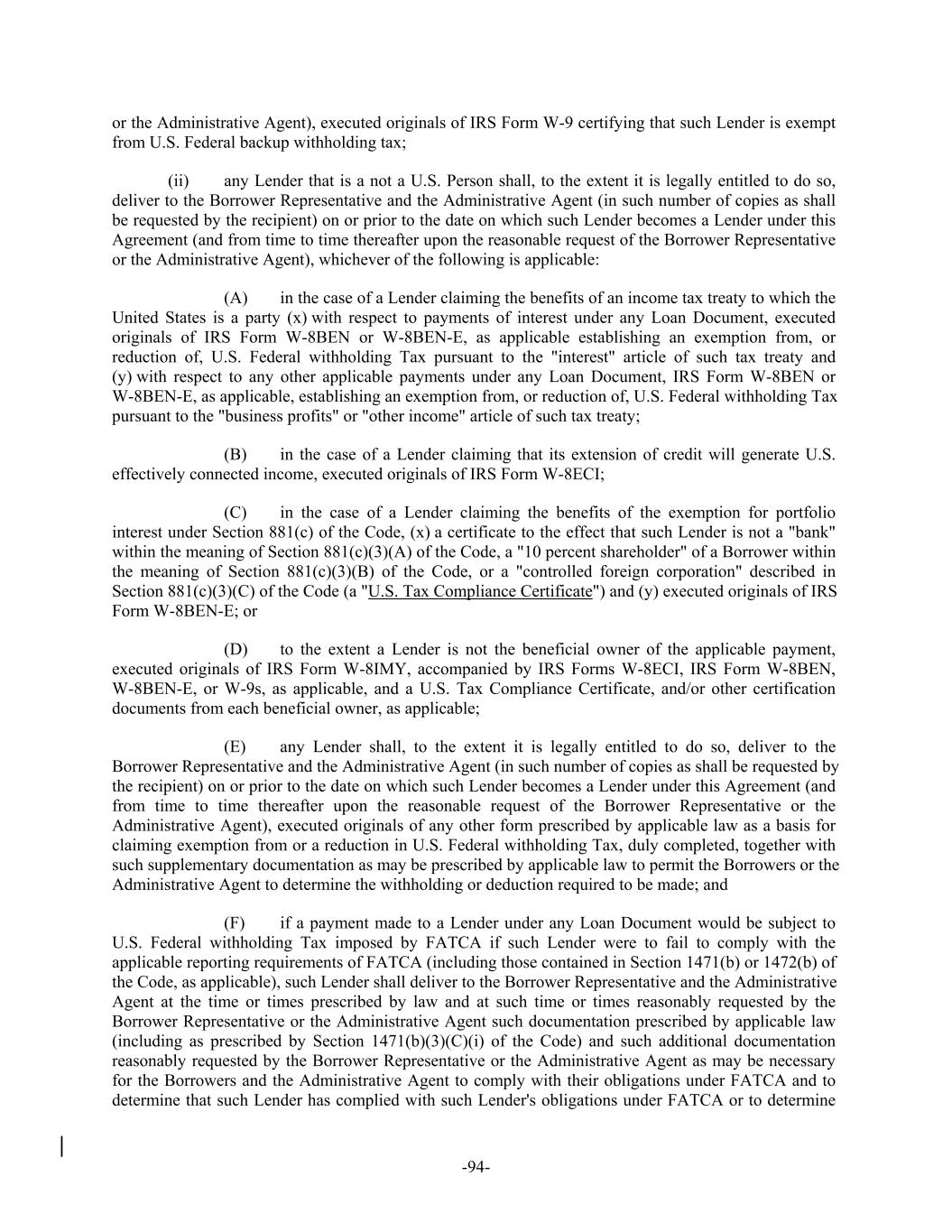 or the Administrative Agent), executed originals of IRS Form W-9 certifying that such Lender is exempt from U.S. Federal backup withholding tax; (ii) any Lender that is a not a U.S. Person shall, to the extent it is legally entitled to do so, deliver to the Borrower Representative and the Administrative Agent (in such number of copies as shall be requested by the recipient) on or prior to the date on which such Lender becomes a Lender under this Agreement (and from time to time thereafter upon the reasonable request of the Borrower Representative or the Administrative Agent), whichever of the following is applicable: (A) in the case of a Lender claiming the benefits of an income tax treaty to which the United States is a party (x) with respect to payments of interest under any Loan Document, executed originals of IRS Form W-8BEN or W-8BEN-E, as applicable establishing an exemption from, or reduction of, U.S. Federal withholding Tax pursuant to the "interest" article of such tax treaty and (y) with respect to any other applicable payments under any Loan Document, IRS Form W-8BEN or W-8BEN-E, as applicable, establishing an exemption from, or reduction of, U.S. Federal withholding Tax pursuant to the "business profits" or "other income" article of such tax treaty; (B) in the case of a Lender claiming that its extension of credit will generate U.S. effectively connected income, executed originals of IRS Form W-8ECI; (C) in the case of a Lender claiming the benefits of the exemption for portfolio interest under Section 881(c) of the Code, (x) a certificate to the effect that such Lender is not a "bank" within the meaning of Section 881(c)(3)(A) of the Code, a "10 percent shareholder" of a Borrower within the meaning of Section 881(c)(3)(B) of the Code, or a "controlled foreign corporation" described in Section 881(c)(3)(C) of the Code (a "U.S. Tax Compliance Certificate") and (y) executed originals of IRS Form W-8BEN-E; or (D) to the extent a Lender is not the beneficial owner of the applicable payment, executed originals of IRS Form W-8IMY, accompanied by IRS Forms W-8ECI, IRS Form W-8BEN, W-8BEN-E, or W-9s, as applicable, and a U.S. Tax Compliance Certificate, and/or other certification documents from each beneficial owner, as applicable; (E) any Lender shall, to the extent it is legally entitled to do so, deliver to the Borrower Representative and the Administrative Agent (in such number of copies as shall be requested by the recipient) on or prior to the date on which such Lender becomes a Lender under this Agreement (and from time to time thereafter upon the reasonable request of the Borrower Representative or the Administrative Agent), executed originals of any other form prescribed by applicable law as a basis for claiming exemption from or a reduction in U.S. Federal withholding Tax, duly completed, together with such supplementary documentation as may be prescribed by applicable law to permit the Borrowers or the Administrative Agent to determine the withholding or deduction required to be made; and (F) if a payment made to a Lender under any Loan Document would be subject to U.S. Federal withholding Tax imposed by FATCA if such Lender were to fail to comply with the applicable reporting requirements of FATCA (including those contained in Section 1471(b) or 1472(b) of the Code, as applicable), such Lender shall deliver to the Borrower Representative and the Administrative Agent at the time or times prescribed by law and at such time or times reasonably requested by the Borrower Representative or the Administrative Agent such documentation prescribed by applicable law (including as prescribed by Section 1471(b)(3)(C)(i) of the Code) and such additional documentation reasonably requested by the Borrower Representative or the Administrative Agent as may be necessary for the Borrowers and the Administrative Agent to comply with their obligations under FATCA and to determine that such Lender has complied with such Lender's obligations under FATCA or to determine -94-