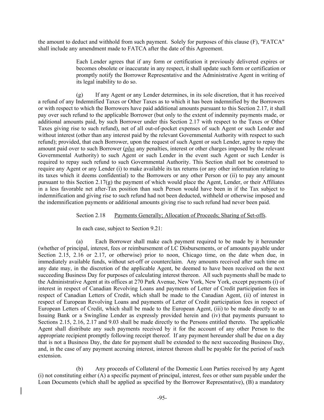 the amount to deduct and withhold from such payment. Solely for purposes of this clause (F), "FATCA" shall include any amendment made to FATCA after the date of this Agreement. Each Lender agrees that if any form or certification it previously delivered expires or becomes obsolete or inaccurate in any respect, it shall update such form or certification or promptly notify the Borrower Representative and the Administrative Agent in writing of its legal inability to do so. (g) If any Agent or any Lender determines, in its sole discretion, that it has received a refund of any Indemnified Taxes or Other Taxes as to which it has been indemnified by the Borrowers or with respect to which the Borrowers have paid additional amounts pursuant to this Section 2.17, it shall pay over such refund to the applicable Borrower (but only to the extent of indemnity payments made, or additional amounts paid, by such Borrower under this Section 2.17 with respect to the Taxes or Other Taxes giving rise to such refund), net of all out-of-pocket expenses of such Agent or such Lender and without interest (other than any interest paid by the relevant Governmental Authority with respect to such refund); provided, that each Borrower, upon the request of such Agent or such Lender, agree to repay the amount paid over to such Borrower (plus any penalties, interest or other charges imposed by the relevant Governmental Authority) to such Agent or such Lender in the event such Agent or such Lender is required to repay such refund to such Governmental Authority. This Section shall not be construed to require any Agent or any Lender (i) to make available its tax returns (or any other information relating to its taxes which it deems confidential) to the Borrowers or any other Person or (ii) to pay any amount pursuant to this Section 2.17(g) the payment of which would place the Agent, Lender, or their Affiliates in a less favorable net after-Tax position than such Person would have been in if the Tax subject to indemnification and giving rise to such refund had not been deducted, withheld or otherwise imposed and the indemnification payments or additional amounts giving rise to such refund had never been paid. Section 2.18 Payments Generally; Allocation of Proceeds; Sharing of Set-offs. In each case, subject to Section 9.21: (a) Each Borrower shall make each payment required to be made by it hereunder (whether of principal, interest, fees or reimbursement of LC Disbursements, or of amounts payable under Section 2.15, 2.16 or 2.17, or otherwise) prior to noon, Chicago time, on the date when due, in immediately available funds, without set-off or counterclaim. Any amounts received after such time on any date may, in the discretion of the applicable Agent, be deemed to have been received on the next succeeding Business Day for purposes of calculating interest thereon. All such payments shall be made to the Administrative Agent at its offices at 270 Park Avenue, New York, New York, except payments (i) of interest in respect of Canadian Revolving Loans and payments of Letter of Credit participation fees in respect of Canadian Letters of Credit, which shall be made to the Canadian Agent, (ii) of interest in respect of European Revolving Loans and payments of Letter of Credit participation fees in respect of European Letters of Credit, which shall be made to the European Agent, (iii) to be made directly to an Issuing Bank or a Swingline Lender as expressly provided herein and (iv) that payments pursuant to Sections 2.15, 2.16, 2.17 and 9.03 shall be made directly to the Persons entitled thereto. The applicable Agent shall distribute any such payments received by it for the account of any other Person to the appropriate recipient promptly following receipt thereof. If any payment hereunder shall be due on a day that is not a Business Day, the date for payment shall be extended to the next succeeding Business Day, and, in the case of any payment accruing interest, interest thereon shall be payable for the period of such extension. (b) Any proceeds of Collateral of the Domestic Loan Parties received by any Agent (i) not constituting either (A) a specific payment of principal, interest, fees or other sum payable under the Loan Documents (which shall be applied as specified by the Borrower Representative), (B) a mandatory -95-