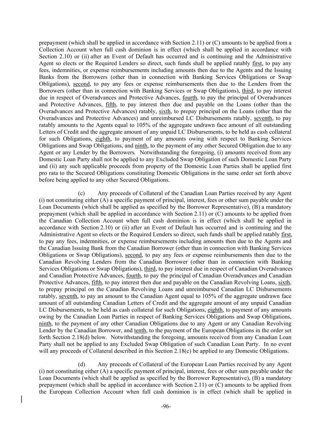prepayment (which shall be applied in accordance with Section 2.11) or (C) amounts to be applied from a Collection Account when full cash dominion is in effect (which shall be applied in accordance with Section 2.10) or (ii) after an Event of Default has occurred and is continuing and the Administrative Agent so elects or the Required Lenders so direct, such funds shall be applied ratably first, to pay any fees, indemnities, or expense reimbursements including amounts then due to the Agents and the Issuing Banks from the Borrowers (other than in connection with Banking Services Obligations or Swap Obligations), second, to pay any fees or expense reimbursements then due to the Lenders from the Borrowers (other than in connection with Banking Services or Swap Obligations), third, to pay interest due in respect of Overadvances and Protective Advances, fourth, to pay the principal of Overadvances and Protective Advances, fifth, to pay interest then due and payable on the Loans (other than the Overadvances and Protective Advances) ratably, sixth, to prepay principal on the Loans (other than the Overadvances and Protective Advances) and unreimbursed LC Disbursements ratably, seventh, to pay ratably amounts to the Agents equal to 105% of the aggregate undrawn face amount of all outstanding Letters of Credit and the aggregate amount of any unpaid LC Disbursements, to be held as cash collateral for such Obligations, eighth, to payment of any amounts owing with respect to Banking Services Obligations and Swap Obligations, and ninth, to the payment of any other Secured Obligation due to any Agent or any Lender by the Borrowers. Notwithstanding the foregoing, (i) amounts received from any Domestic Loan Party shall not be applied to any Excluded Swap Obligation of such Domestic Loan Party and (ii) any such applicable proceeds from property of the Domestic Loan Parties shall be applied first pro rata to the Secured Obligations constituting Domestic Obligations in the same order set forth above before being applied to any other Secured Obligations. (c) Any proceeds of Collateral of the Canadian Loan Parties received by any Agent (i) not constituting either (A) a specific payment of principal, interest, fees or other sum payable under the Loan Documents (which shall be applied as specified by the Borrower Representative), (B) a mandatory prepayment (which shall be applied in accordance with Section 2.11) or (C) amounts to be applied from the Canadian Collection Account when full cash dominion is in effect (which shall be applied in accordance with Section 2.10) or (ii) after an Event of Default has occurred and is continuing and the Administrative Agent so elects or the Required Lenders so direct, such funds shall be applied ratably first, to pay any fees, indemnities, or expense reimbursements including amounts then due to the Agents and the Canadian Issuing Bank from the Canadian Borrower (other than in connection with Banking Services Obligations or Swap Obligations), second, to pay any fees or expense reimbursements then due to the Canadian Revolving Lenders from the Canadian Borrower (other than in connection with Banking Services Obligations or Swap Obligations), third, to pay interest due in respect of Canadian Overadvances and Canadian Protective Advances, fourth, to pay the principal of Canadian Overadvances and Canadian Protective Advances, fifth, to pay interest then due and payable on the Canadian Revolving Loans, sixth, to prepay principal on the Canadian Revolving Loans and unreimbursed Canadian LC Disbursements ratably, seventh, to pay an amount to the Canadian Agent equal to 105% of the aggregate undrawn face amount of all outstanding Canadian Letters of Credit and the aggregate amount of any unpaid Canadian LC Disbursements, to be held as cash collateral for such Obligations, eighth, to payment of any amounts owing by the Canadian Loan Parties in respect of Banking Services Obligations and Swap Obligations, ninth, to the payment of any other Canadian Obligations due to any Agent or any Canadian Revolving Lender by the Canadian Borrower, and tenth, to the payment of the European Obligations in the order set forth Section 2.18(d) below. Notwithstanding the foregoing, amounts received from any Canadian Loan Party shall not be applied to any Excluded Swap Obligation of such Canadian Loan Party. In no event will any proceeds of Collateral described in this Section 2.18(c) be applied to any Domestic Obligations. (d) Any proceeds of Collateral of the European Loan Parties received by any Agent (i) not constituting either (A) a specific payment of principal, interest, fees or other sum payable under the Loan Documents (which shall be applied as specified by the Borrower Representative), (B) a mandatory prepayment (which shall be applied in accordance with Section 2.11) or (C) amounts to be applied from the European Collection Account when full cash dominion is in effect (which shall be applied in -96-