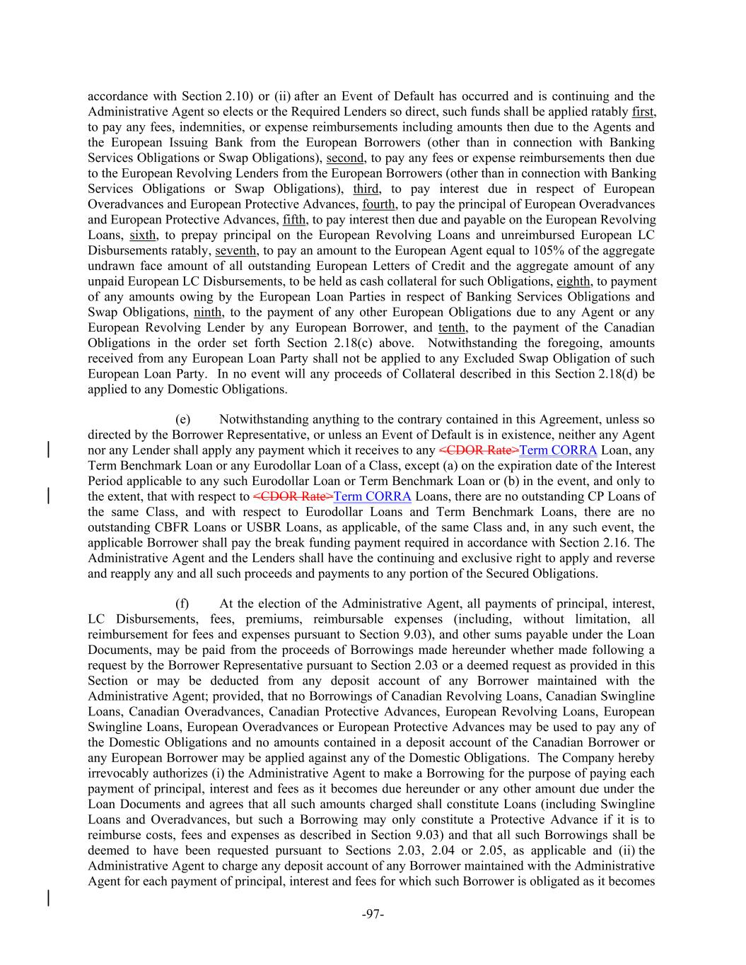 accordance with Section 2.10) or (ii) after an Event of Default has occurred and is continuing and the Administrative Agent so elects or the Required Lenders so direct, such funds shall be applied ratably first, to pay any fees, indemnities, or expense reimbursements including amounts then due to the Agents and the European Issuing Bank from the European Borrowers (other than in connection with Banking Services Obligations or Swap Obligations), second, to pay any fees or expense reimbursements then due to the European Revolving Lenders from the European Borrowers (other than in connection with Banking Services Obligations or Swap Obligations), third, to pay interest due in respect of European Overadvances and European Protective Advances, fourth, to pay the principal of European Overadvances and European Protective Advances, fifth, to pay interest then due and payable on the European Revolving Loans, sixth, to prepay principal on the European Revolving Loans and unreimbursed European LC Disbursements ratably, seventh, to pay an amount to the European Agent equal to 105% of the aggregate undrawn face amount of all outstanding European Letters of Credit and the aggregate amount of any unpaid European LC Disbursements, to be held as cash collateral for such Obligations, eighth, to payment of any amounts owing by the European Loan Parties in respect of Banking Services Obligations and Swap Obligations, ninth, to the payment of any other European Obligations due to any Agent or any European Revolving Lender by any European Borrower, and tenth, to the payment of the Canadian Obligations in the order set forth Section 2.18(c) above. Notwithstanding the foregoing, amounts received from any European Loan Party shall not be applied to any Excluded Swap Obligation of such European Loan Party. In no event will any proceeds of Collateral described in this Section 2.18(d) be applied to any Domestic Obligations. (e) Notwithstanding anything to the contrary contained in this Agreement, unless so directed by the Borrower Representative, or unless an Event of Default is in existence, neither any Agent nor any Lender shall apply any payment which it receives to any <CDOR Rate>Term CORRA Loan, any Term Benchmark Loan or any Eurodollar Loan of a Class, except (a) on the expiration date of the Interest Period applicable to any such Eurodollar Loan or Term Benchmark Loan or (b) in the event, and only to the extent, that with respect to <CDOR Rate>Term CORRA Loans, there are no outstanding CP Loans of the same Class, and with respect to Eurodollar Loans and Term Benchmark Loans, there are no outstanding CBFR Loans or USBR Loans, as applicable, of the same Class and, in any such event, the applicable Borrower shall pay the break funding payment required in accordance with Section 2.16. The Administrative Agent and the Lenders shall have the continuing and exclusive right to apply and reverse and reapply any and all such proceeds and payments to any portion of the Secured Obligations. (f) At the election of the Administrative Agent, all payments of principal, interest, LC Disbursements, fees, premiums, reimbursable expenses (including, without limitation, all reimbursement for fees and expenses pursuant to Section 9.03), and other sums payable under the Loan Documents, may be paid from the proceeds of Borrowings made hereunder whether made following a request by the Borrower Representative pursuant to Section 2.03 or a deemed request as provided in this Section or may be deducted from any deposit account of any Borrower maintained with the Administrative Agent; provided, that no Borrowings of Canadian Revolving Loans, Canadian Swingline Loans, Canadian Overadvances, Canadian Protective Advances, European Revolving Loans, European Swingline Loans, European Overadvances or European Protective Advances may be used to pay any of the Domestic Obligations and no amounts contained in a deposit account of the Canadian Borrower or any European Borrower may be applied against any of the Domestic Obligations. The Company hereby irrevocably authorizes (i) the Administrative Agent to make a Borrowing for the purpose of paying each payment of principal, interest and fees as it becomes due hereunder or any other amount due under the Loan Documents and agrees that all such amounts charged shall constitute Loans (including Swingline Loans and Overadvances, but such a Borrowing may only constitute a Protective Advance if it is to reimburse costs, fees and expenses as described in Section 9.03) and that all such Borrowings shall be deemed to have been requested pursuant to Sections 2.03, 2.04 or 2.05, as applicable and (ii) the Administrative Agent to charge any deposit account of any Borrower maintained with the Administrative Agent for each payment of principal, interest and fees for which such Borrower is obligated as it becomes -97-