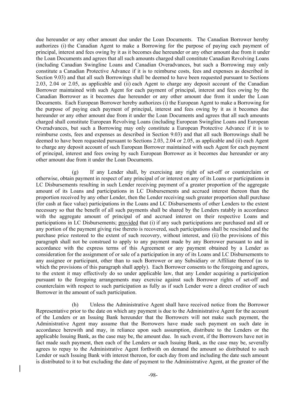 due hereunder or any other amount due under the Loan Documents. The Canadian Borrower hereby authorizes (i) the Canadian Agent to make a Borrowing for the purpose of paying each payment of principal, interest and fees owing by it as it becomes due hereunder or any other amount due from it under the Loan Documents and agrees that all such amounts charged shall constitute Canadian Revolving Loans (including Canadian Swingline Loans and Canadian Overadvances, but such a Borrowing may only constitute a Canadian Protective Advance if it is to reimburse costs, fees and expenses as described in Section 9.03) and that all such Borrowings shall be deemed to have been requested pursuant to Sections 2.03, 2.04 or 2.05, as applicable and (ii) each Agent to charge any deposit account of the Canadian Borrower maintained with such Agent for each payment of principal, interest and fees owing by the Canadian Borrower as it becomes due hereunder or any other amount due from it under the Loan Documents. Each European Borrower hereby authorizes (i) the European Agent to make a Borrowing for the purpose of paying each payment of principal, interest and fees owing by it as it becomes due hereunder or any other amount due from it under the Loan Documents and agrees that all such amounts charged shall constitute European Revolving Loans (including European Swingline Loans and European Overadvances, but such a Borrowing may only constitute a European Protective Advance if it is to reimburse costs, fees and expenses as described in Section 9.03) and that all such Borrowings shall be deemed to have been requested pursuant to Sections 2.03, 2.04 or 2.05, as applicable and (ii) each Agent to charge any deposit account of such European Borrower maintained with such Agent for each payment of principal, interest and fees owing by such European Borrower as it becomes due hereunder or any other amount due from it under the Loan Documents. (g) If any Lender shall, by exercising any right of set-off or counterclaim or otherwise, obtain payment in respect of any principal of or interest on any of its Loans or participations in LC Disbursements resulting in such Lender receiving payment of a greater proportion of the aggregate amount of its Loans and participations in LC Disbursements and accrued interest thereon than the proportion received by any other Lender, then the Lender receiving such greater proportion shall purchase (for cash at face value) participations in the Loans and LC Disbursements of other Lenders to the extent necessary so that the benefit of all such payments shall be shared by the Lenders ratably in accordance with the aggregate amount of principal of and accrued interest on their respective Loans and participations in LC Disbursements; provided that (i) if any such participations are purchased and all or any portion of the payment giving rise thereto is recovered, such participations shall be rescinded and the purchase price restored to the extent of such recovery, without interest, and (ii) the provisions of this paragraph shall not be construed to apply to any payment made by any Borrower pursuant to and in accordance with the express terms of this Agreement or any payment obtained by a Lender as consideration for the assignment of or sale of a participation in any of its Loans and LC Disbursements to any assignee or participant, other than to such Borrower or any Subsidiary or Affiliate thereof (as to which the provisions of this paragraph shall apply). Each Borrower consents to the foregoing and agrees, to the extent it may effectively do so under applicable law, that any Lender acquiring a participation pursuant to the foregoing arrangements may exercise against such Borrower rights of set-off and counterclaim with respect to such participation as fully as if such Lender were a direct creditor of such Borrower in the amount of such participation. (h) Unless the Administrative Agent shall have received notice from the Borrower Representative prior to the date on which any payment is due to the Administrative Agent for the account of the Lenders or an Issuing Bank hereunder that the Borrowers will not make such payment, the Administrative Agent may assume that the Borrowers have made such payment on such date in accordance herewith and may, in reliance upon such assumption, distribute to the Lenders or the applicable Issuing Bank, as the case may be, the amount due. In such event, if the Borrowers have not in fact made such payment, then each of the Lenders or such Issuing Bank, as the case may be, severally agrees to repay to the Administrative Agent forthwith on demand the amount so distributed to such Lender or such Issuing Bank with interest thereon, for each day from and including the date such amount is distributed to it to but excluding the date of payment to the Administrative Agent, at the greater of the -98-