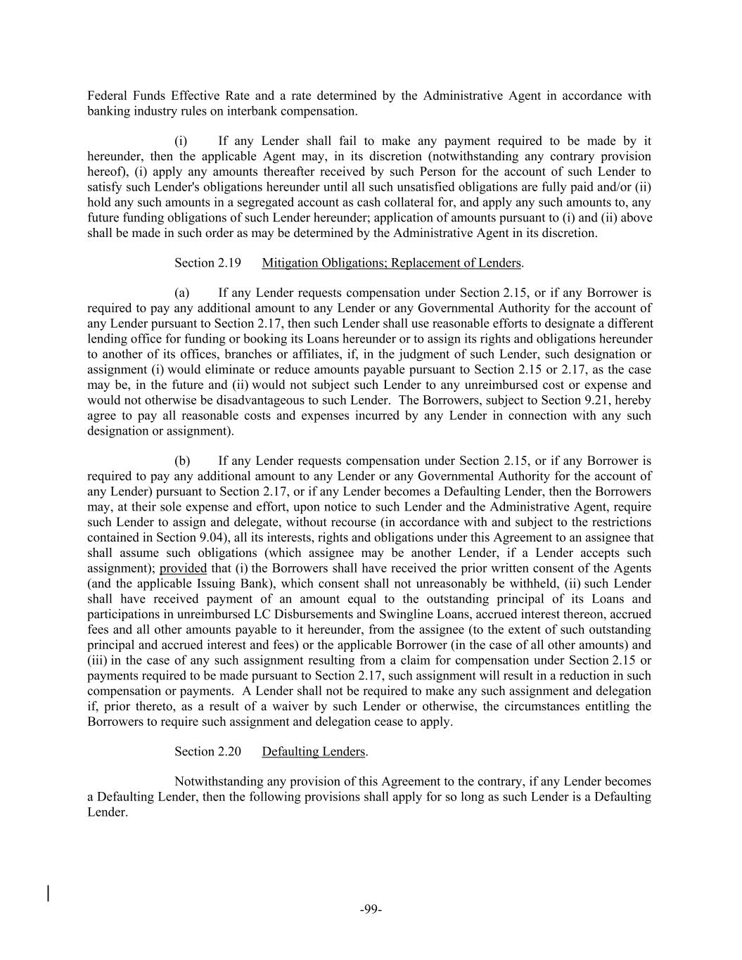 Federal Funds Effective Rate and a rate determined by the Administrative Agent in accordance with banking industry rules on interbank compensation. (i) If any Lender shall fail to make any payment required to be made by it hereunder, then the applicable Agent may, in its discretion (notwithstanding any contrary provision hereof), (i) apply any amounts thereafter received by such Person for the account of such Lender to satisfy such Lender's obligations hereunder until all such unsatisfied obligations are fully paid and/or (ii) hold any such amounts in a segregated account as cash collateral for, and apply any such amounts to, any future funding obligations of such Lender hereunder; application of amounts pursuant to (i) and (ii) above shall be made in such order as may be determined by the Administrative Agent in its discretion. Section 2.19 Mitigation Obligations; Replacement of Lenders. (a) If any Lender requests compensation under Section 2.15, or if any Borrower is required to pay any additional amount to any Lender or any Governmental Authority for the account of any Lender pursuant to Section 2.17, then such Lender shall use reasonable efforts to designate a different lending office for funding or booking its Loans hereunder or to assign its rights and obligations hereunder to another of its offices, branches or affiliates, if, in the judgment of such Lender, such designation or assignment (i) would eliminate or reduce amounts payable pursuant to Section 2.15 or 2.17, as the case may be, in the future and (ii) would not subject such Lender to any unreimbursed cost or expense and would not otherwise be disadvantageous to such Lender. The Borrowers, subject to Section 9.21, hereby agree to pay all reasonable costs and expenses incurred by any Lender in connection with any such designation or assignment). (b) If any Lender requests compensation under Section 2.15, or if any Borrower is required to pay any additional amount to any Lender or any Governmental Authority for the account of any Lender) pursuant to Section 2.17, or if any Lender becomes a Defaulting Lender, then the Borrowers may, at their sole expense and effort, upon notice to such Lender and the Administrative Agent, require such Lender to assign and delegate, without recourse (in accordance with and subject to the restrictions contained in Section 9.04), all its interests, rights and obligations under this Agreement to an assignee that shall assume such obligations (which assignee may be another Lender, if a Lender accepts such assignment); provided that (i) the Borrowers shall have received the prior written consent of the Agents (and the applicable Issuing Bank), which consent shall not unreasonably be withheld, (ii) such Lender shall have received payment of an amount equal to the outstanding principal of its Loans and participations in unreimbursed LC Disbursements and Swingline Loans, accrued interest thereon, accrued fees and all other amounts payable to it hereunder, from the assignee (to the extent of such outstanding principal and accrued interest and fees) or the applicable Borrower (in the case of all other amounts) and (iii) in the case of any such assignment resulting from a claim for compensation under Section 2.15 or payments required to be made pursuant to Section 2.17, such assignment will result in a reduction in such compensation or payments. A Lender shall not be required to make any such assignment and delegation if, prior thereto, as a result of a waiver by such Lender or otherwise, the circumstances entitling the Borrowers to require such assignment and delegation cease to apply. Section 2.20 Defaulting Lenders. Notwithstanding any provision of this Agreement to the contrary, if any Lender becomes a Defaulting Lender, then the following provisions shall apply for so long as such Lender is a Defaulting Lender. -99-