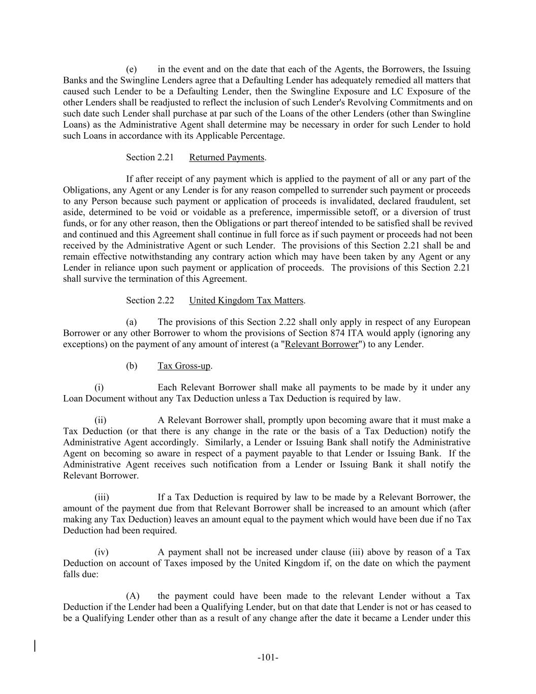(e) in the event and on the date that each of the Agents, the Borrowers, the Issuing Banks and the Swingline Lenders agree that a Defaulting Lender has adequately remedied all matters that caused such Lender to be a Defaulting Lender, then the Swingline Exposure and LC Exposure of the other Lenders shall be readjusted to reflect the inclusion of such Lender's Revolving Commitments and on such date such Lender shall purchase at par such of the Loans of the other Lenders (other than Swingline Loans) as the Administrative Agent shall determine may be necessary in order for such Lender to hold such Loans in accordance with its Applicable Percentage. Section 2.21 Returned Payments. If after receipt of any payment which is applied to the payment of all or any part of the Obligations, any Agent or any Lender is for any reason compelled to surrender such payment or proceeds to any Person because such payment or application of proceeds is invalidated, declared fraudulent, set aside, determined to be void or voidable as a preference, impermissible setoff, or a diversion of trust funds, or for any other reason, then the Obligations or part thereof intended to be satisfied shall be revived and continued and this Agreement shall continue in full force as if such payment or proceeds had not been received by the Administrative Agent or such Lender. The provisions of this Section 2.21 shall be and remain effective notwithstanding any contrary action which may have been taken by any Agent or any Lender in reliance upon such payment or application of proceeds. The provisions of this Section 2.21 shall survive the termination of this Agreement. Section 2.22 United Kingdom Tax Matters. (a) The provisions of this Section 2.22 shall only apply in respect of any European Borrower or any other Borrower to whom the provisions of Section 874 ITA would apply (ignoring any exceptions) on the payment of any amount of interest (a "Relevant Borrower") to any Lender. (b) Tax Gross-up. (i) Each Relevant Borrower shall make all payments to be made by it under any Loan Document without any Tax Deduction unless a Tax Deduction is required by law. (ii) A Relevant Borrower shall, promptly upon becoming aware that it must make a Tax Deduction (or that there is any change in the rate or the basis of a Tax Deduction) notify the Administrative Agent accordingly. Similarly, a Lender or Issuing Bank shall notify the Administrative Agent on becoming so aware in respect of a payment payable to that Lender or Issuing Bank. If the Administrative Agent receives such notification from a Lender or Issuing Bank it shall notify the Relevant Borrower. (iii) If a Tax Deduction is required by law to be made by a Relevant Borrower, the amount of the payment due from that Relevant Borrower shall be increased to an amount which (after making any Tax Deduction) leaves an amount equal to the payment which would have been due if no Tax Deduction had been required. (iv) A payment shall not be increased under clause (iii) above by reason of a Tax Deduction on account of Taxes imposed by the United Kingdom if, on the date on which the payment falls due: (A) the payment could have been made to the relevant Lender without a Tax Deduction if the Lender had been a Qualifying Lender, but on that date that Lender is not or has ceased to be a Qualifying Lender other than as a result of any change after the date it became a Lender under this -101-