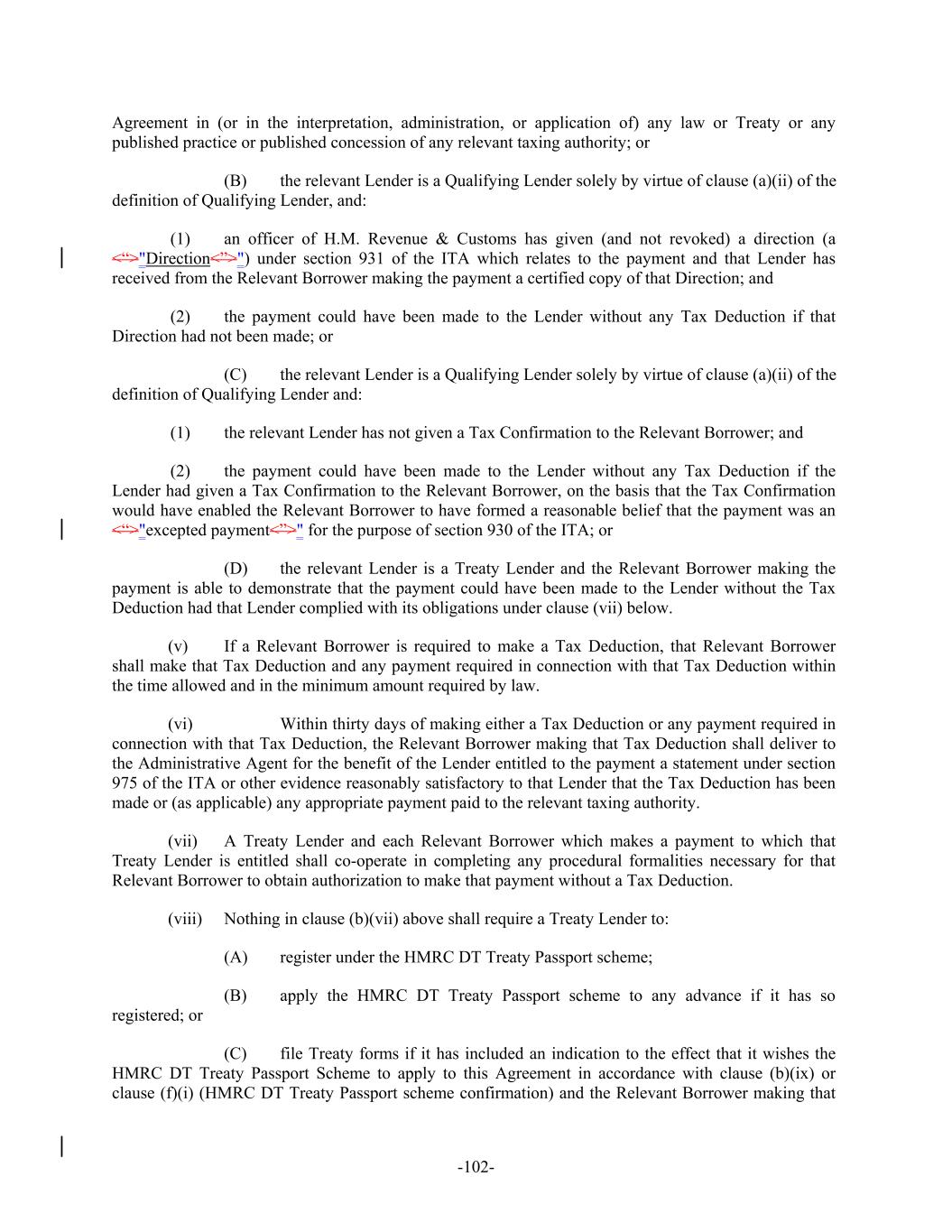 Agreement in (or in the interpretation, administration, or application of) any law or Treaty or any published practice or published concession of any relevant taxing authority; or (B) the relevant Lender is a Qualifying Lender solely by virtue of clause (a)(ii) of the definition of Qualifying Lender, and: (1) an officer of H.M. Revenue & Customs has given (and not revoked) a direction (a <“>"Direction<”>") under section 931 of the ITA which relates to the payment and that Lender has received from the Relevant Borrower making the payment a certified copy of that Direction; and (2) the payment could have been made to the Lender without any Tax Deduction if that Direction had not been made; or (C) the relevant Lender is a Qualifying Lender solely by virtue of clause (a)(ii) of the definition of Qualifying Lender and: (1) the relevant Lender has not given a Tax Confirmation to the Relevant Borrower; and (2) the payment could have been made to the Lender without any Tax Deduction if the Lender had given a Tax Confirmation to the Relevant Borrower, on the basis that the Tax Confirmation would have enabled the Relevant Borrower to have formed a reasonable belief that the payment was an <“>"excepted payment<”>" for the purpose of section 930 of the ITA; or (D) the relevant Lender is a Treaty Lender and the Relevant Borrower making the payment is able to demonstrate that the payment could have been made to the Lender without the Tax Deduction had that Lender complied with its obligations under clause (vii) below. (v) If a Relevant Borrower is required to make a Tax Deduction, that Relevant Borrower shall make that Tax Deduction and any payment required in connection with that Tax Deduction within the time allowed and in the minimum amount required by law. (vi) Within thirty days of making either a Tax Deduction or any payment required in connection with that Tax Deduction, the Relevant Borrower making that Tax Deduction shall deliver to the Administrative Agent for the benefit of the Lender entitled to the payment a statement under section 975 of the ITA or other evidence reasonably satisfactory to that Lender that the Tax Deduction has been made or (as applicable) any appropriate payment paid to the relevant taxing authority. (vii) A Treaty Lender and each Relevant Borrower which makes a payment to which that Treaty Lender is entitled shall co-operate in completing any procedural formalities necessary for that Relevant Borrower to obtain authorization to make that payment without a Tax Deduction. (viii) Nothing in clause (b)(vii) above shall require a Treaty Lender to: (A) register under the HMRC DT Treaty Passport scheme; (B) apply the HMRC DT Treaty Passport scheme to any advance if it has so registered; or (C) file Treaty forms if it has included an indication to the effect that it wishes the HMRC DT Treaty Passport Scheme to apply to this Agreement in accordance with clause (b)(ix) or clause (f)(i) (HMRC DT Treaty Passport scheme confirmation) and the Relevant Borrower making that -102-