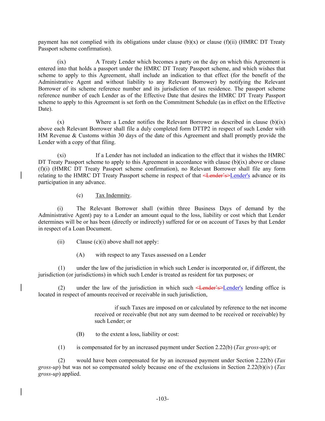 payment has not complied with its obligations under clause (b)(x) or clause (f)(ii) (HMRC DT Treaty Passport scheme confirmation). (ix) A Treaty Lender which becomes a party on the day on which this Agreement is entered into that holds a passport under the HMRC DT Treaty Passport scheme, and which wishes that scheme to apply to this Agreement, shall include an indication to that effect (for the benefit of the Administrative Agent and without liability to any Relevant Borrower) by notifying the Relevant Borrower of its scheme reference number and its jurisdiction of tax residence. The passport scheme reference number of each Lender as of the Effective Date that desires the HMRC DT Treaty Passport scheme to apply to this Agreement is set forth on the Commitment Schedule (as in effect on the Effective Date). (x) Where a Lender notifies the Relevant Borrower as described in clause (b)(ix) above each Relevant Borrower shall file a duly completed form DTTP2 in respect of such Lender with HM Revenue & Customs within 30 days of the date of this Agreement and shall promptly provide the Lender with a copy of that filing. (xi) If a Lender has not included an indication to the effect that it wishes the HMRC DT Treaty Passport scheme to apply to this Agreement in accordance with clause (b)(ix) above or clause (f)(i) (HMRC DT Treaty Passport scheme confirmation), no Relevant Borrower shall file any form relating to the HMRC DT Treaty Passport scheme in respect of that <Lender’s>Lender's advance or its participation in any advance. (c) Tax Indemnity. (i) The Relevant Borrower shall (within three Business Days of demand by the Administrative Agent) pay to a Lender an amount equal to the loss, liability or cost which that Lender determines will be or has been (directly or indirectly) suffered for or on account of Taxes by that Lender in respect of a Loan Document. (ii) Clause (c)(i) above shall not apply: (A) with respect to any Taxes assessed on a Lender (1) under the law of the jurisdiction in which such Lender is incorporated or, if different, the jurisdiction (or jurisdictions) in which such Lender is treated as resident for tax purposes; or (2) under the law of the jurisdiction in which such <Lender’s>Lender's lending office is located in respect of amounts received or receivable in such jurisdiction, if such Taxes are imposed on or calculated by reference to the net income received or receivable (but not any sum deemed to be received or receivable) by such Lender; or (B) to the extent a loss, liability or cost: (1) is compensated for by an increased payment under Section 2.22(b) (Tax gross-up); or (2) would have been compensated for by an increased payment under Section 2.22(b) (Tax gross-up) but was not so compensated solely because one of the exclusions in Section 2.22(b)(iv) (Tax gross-up) applied. -103-