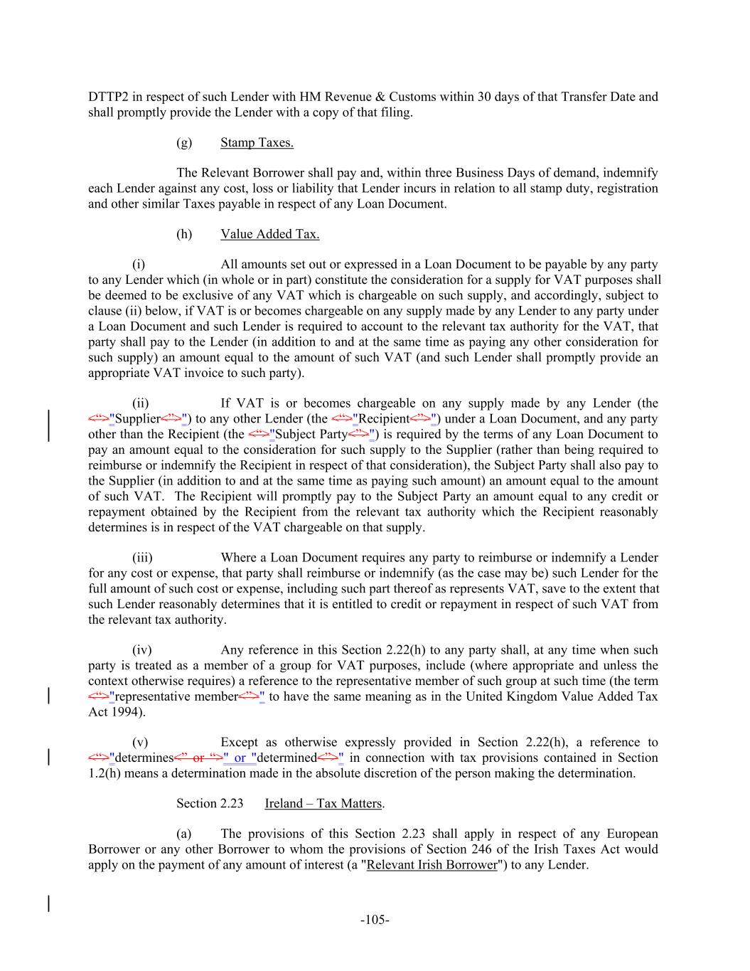 DTTP2 in respect of such Lender with HM Revenue & Customs within 30 days of that Transfer Date and shall promptly provide the Lender with a copy of that filing. (g) Stamp Taxes. The Relevant Borrower shall pay and, within three Business Days of demand, indemnify each Lender against any cost, loss or liability that Lender incurs in relation to all stamp duty, registration and other similar Taxes payable in respect of any Loan Document. (h) Value Added Tax. (i) All amounts set out or expressed in a Loan Document to be payable by any party to any Lender which (in whole or in part) constitute the consideration for a supply for VAT purposes shall be deemed to be exclusive of any VAT which is chargeable on such supply, and accordingly, subject to clause (ii) below, if VAT is or becomes chargeable on any supply made by any Lender to any party under a Loan Document and such Lender is required to account to the relevant tax authority for the VAT, that party shall pay to the Lender (in addition to and at the same time as paying any other consideration for such supply) an amount equal to the amount of such VAT (and such Lender shall promptly provide an appropriate VAT invoice to such party). (ii) If VAT is or becomes chargeable on any supply made by any Lender (the <“>"Supplier<”>") to any other Lender (the <“>"Recipient<”>") under a Loan Document, and any party other than the Recipient (the <“>"Subject Party<”>") is required by the terms of any Loan Document to pay an amount equal to the consideration for such supply to the Supplier (rather than being required to reimburse or indemnify the Recipient in respect of that consideration), the Subject Party shall also pay to the Supplier (in addition to and at the same time as paying such amount) an amount equal to the amount of such VAT. The Recipient will promptly pay to the Subject Party an amount equal to any credit or repayment obtained by the Recipient from the relevant tax authority which the Recipient reasonably determines is in respect of the VAT chargeable on that supply. (iii) Where a Loan Document requires any party to reimburse or indemnify a Lender for any cost or expense, that party shall reimburse or indemnify (as the case may be) such Lender for the full amount of such cost or expense, including such part thereof as represents VAT, save to the extent that such Lender reasonably determines that it is entitled to credit or repayment in respect of such VAT from the relevant tax authority. (iv) Any reference in this Section 2.22(h) to any party shall, at any time when such party is treated as a member of a group for VAT purposes, include (where appropriate and unless the context otherwise requires) a reference to the representative member of such group at such time (the term <“>"representative member<”>" to have the same meaning as in the United Kingdom Value Added Tax Act 1994). (v) Except as otherwise expressly provided in Section 2.22(h), a reference to <“>"determines<” or “>" or "determined<”>" in connection with tax provisions contained in Section 1.2(h) means a determination made in the absolute discretion of the person making the determination. Section 2.23 Ireland – Tax Matters. (a) The provisions of this Section 2.23 shall apply in respect of any European Borrower or any other Borrower to whom the provisions of Section 246 of the Irish Taxes Act would apply on the payment of any amount of interest (a "Relevant Irish Borrower") to any Lender. -105-