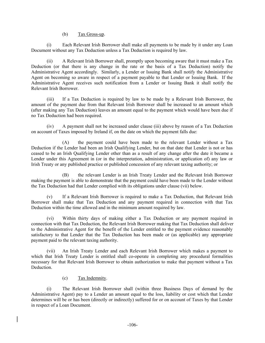 (b) Tax Gross-up. (i) Each Relevant Irish Borrower shall make all payments to be made by it under any Loan Document without any Tax Deduction unless a Tax Deduction is required by law. (ii) A Relevant Irish Borrower shall, promptly upon becoming aware that it must make a Tax Deduction (or that there is any change in the rate or the basis of a Tax Deduction) notify the Administrative Agent accordingly. Similarly, a Lender or Issuing Bank shall notify the Administrative Agent on becoming so aware in respect of a payment payable to that Lender or Issuing Bank. If the Administrative Agent receives such notification from a Lender or Issuing Bank it shall notify the Relevant Irish Borrower. (iii) If a Tax Deduction is required by law to be made by a Relevant Irish Borrower, the amount of the payment due from that Relevant Irish Borrower shall be increased to an amount which (after making any Tax Deduction) leaves an amount equal to the payment which would have been due if no Tax Deduction had been required. (iv) A payment shall not be increased under clause (iii) above by reason of a Tax Deduction on account of Taxes imposed by Ireland if, on the date on which the payment falls due: (A) the payment could have been made to the relevant Lender without a Tax Deduction if the Lender had been an Irish Qualifying Lender, but on that date that Lender is not or has ceased to be an Irish Qualifying Lender other than as a result of any change after the date it became a Lender under this Agreement in (or in the interpretation, administration, or application of) any law or Irish Treaty or any published practice or published concession of any relevant taxing authority; or (B) the relevant Lender is an Irish Treaty Lender and the Relevant Irish Borrower making the payment is able to demonstrate that the payment could have been made to the Lender without the Tax Deduction had that Lender complied with its obligations under clause (vii) below. (v) If a Relevant Irish Borrower is required to make a Tax Deduction, that Relevant Irish Borrower shall make that Tax Deduction and any payment required in connection with that Tax Deduction within the time allowed and in the minimum amount required by law. (vi) Within thirty days of making either a Tax Deduction or any payment required in connection with that Tax Deduction, the Relevant Irish Borrower making that Tax Deduction shall deliver to the Administrative Agent for the benefit of the Lender entitled to the payment evidence reasonably satisfactory to that Lender that the Tax Deduction has been made or (as applicable) any appropriate payment paid to the relevant taxing authority. (vii) An Irish Treaty Lender and each Relevant Irish Borrower which makes a payment to which that Irish Treaty Lender is entitled shall co-operate in completing any procedural formalities necessary for that Relevant Irish Borrower to obtain authorization to make that payment without a Tax Deduction. (c) Tax Indemnity. (i) The Relevant Irish Borrower shall (within three Business Days of demand by the Administrative Agent) pay to a Lender an amount equal to the loss, liability or cost which that Lender determines will be or has been (directly or indirectly) suffered for or on account of Taxes by that Lender in respect of a Loan Document. -106-