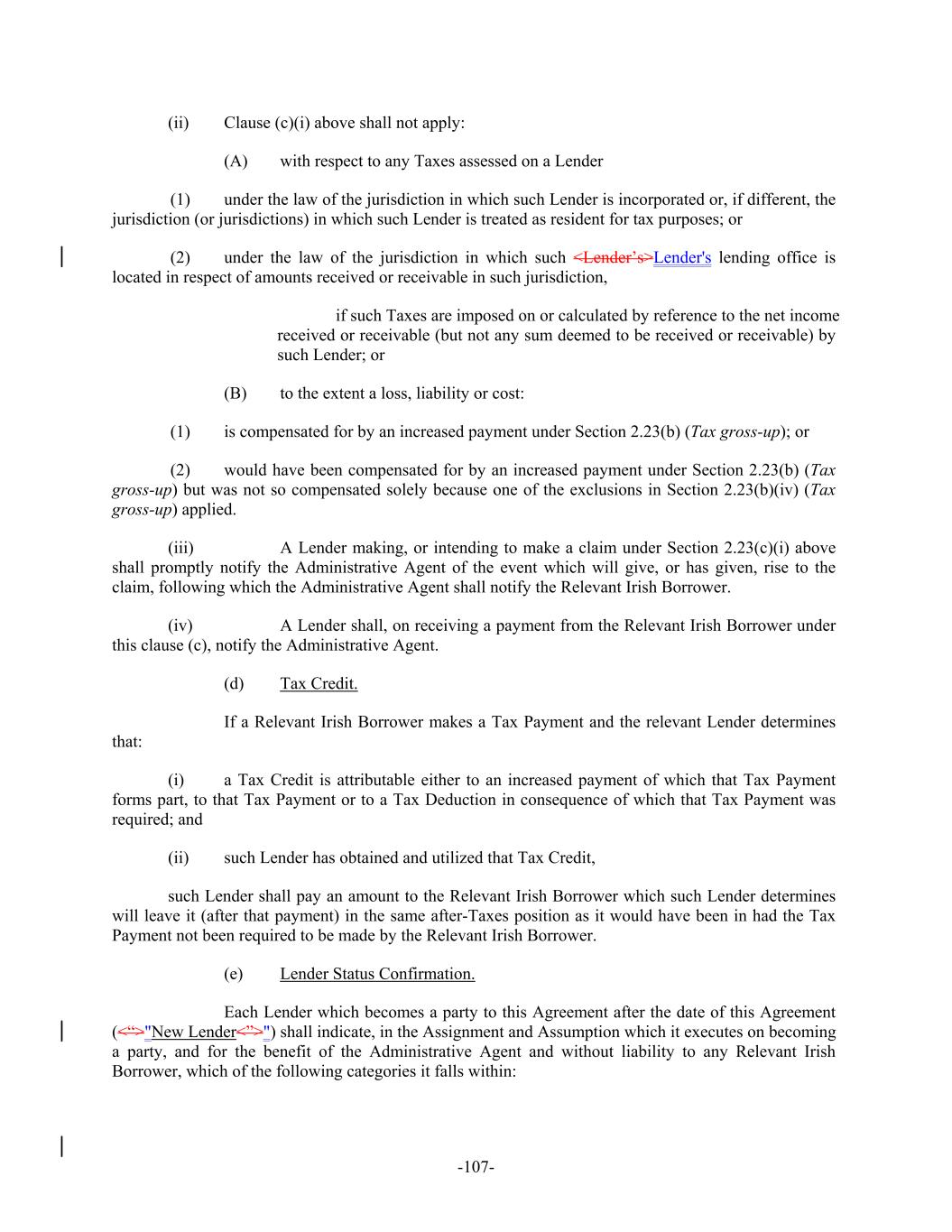 (ii) Clause (c)(i) above shall not apply: (A) with respect to any Taxes assessed on a Lender (1) under the law of the jurisdiction in which such Lender is incorporated or, if different, the jurisdiction (or jurisdictions) in which such Lender is treated as resident for tax purposes; or (2) under the law of the jurisdiction in which such <Lender’s>Lender's lending office is located in respect of amounts received or receivable in such jurisdiction, if such Taxes are imposed on or calculated by reference to the net income received or receivable (but not any sum deemed to be received or receivable) by such Lender; or (B) to the extent a loss, liability or cost: (1) is compensated for by an increased payment under Section 2.23(b) (Tax gross-up); or (2) would have been compensated for by an increased payment under Section 2.23(b) (Tax gross-up) but was not so compensated solely because one of the exclusions in Section 2.23(b)(iv) (Tax gross-up) applied. (iii) A Lender making, or intending to make a claim under Section 2.23(c)(i) above shall promptly notify the Administrative Agent of the event which will give, or has given, rise to the claim, following which the Administrative Agent shall notify the Relevant Irish Borrower. (iv) A Lender shall, on receiving a payment from the Relevant Irish Borrower under this clause (c), notify the Administrative Agent. (d) Tax Credit. If a Relevant Irish Borrower makes a Tax Payment and the relevant Lender determines that: (i) a Tax Credit is attributable either to an increased payment of which that Tax Payment forms part, to that Tax Payment or to a Tax Deduction in consequence of which that Tax Payment was required; and (ii) such Lender has obtained and utilized that Tax Credit, such Lender shall pay an amount to the Relevant Irish Borrower which such Lender determines will leave it (after that payment) in the same after-Taxes position as it would have been in had the Tax Payment not been required to be made by the Relevant Irish Borrower. (e) Lender Status Confirmation. Each Lender which becomes a party to this Agreement after the date of this Agreement (<“>"New Lender<”>") shall indicate, in the Assignment and Assumption which it executes on becoming a party, and for the benefit of the Administrative Agent and without liability to any Relevant Irish Borrower, which of the following categories it falls within: -107-