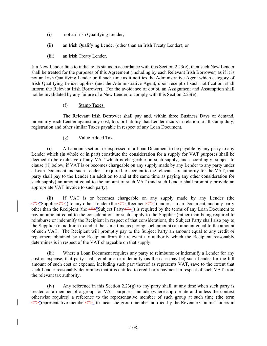 (i) not an Irish Qualifying Lender; (ii) an Irish Qualifying Lender (other than an Irish Treaty Lender); or (iii) an Irish Treaty Lender. If a New Lender fails to indicate its status in accordance with this Section 2.23(e), then such New Lender shall be treated for the purposes of this Agreement (including by each Relevant Irish Borrower) as if it is not an Irish Qualifying Lender until such time as it notifies the Administrative Agent which category of Irish Qualifying Lender applies (and the Administrative Agent, upon receipt of such notification, shall inform the Relevant Irish Borrower). For the avoidance of doubt, an Assignment and Assumption shall not be invalidated by any failure of a New Lender to comply with this Section 2.23(e). (f) Stamp Taxes. The Relevant Irish Borrower shall pay and, within three Business Days of demand, indemnify each Lender against any cost, loss or liability that Lender incurs in relation to all stamp duty, registration and other similar Taxes payable in respect of any Loan Document. (g) Value Added Tax. (i) All amounts set out or expressed in a Loan Document to be payable by any party to any Lender which (in whole or in part) constitute the consideration for a supply for VAT purposes shall be deemed to be exclusive of any VAT which is chargeable on such supply, and accordingly, subject to clause (ii) below, if VAT is or becomes chargeable on any supply made by any Lender to any party under a Loan Document and such Lender is required to account to the relevant tax authority for the VAT, that party shall pay to the Lender (in addition to and at the same time as paying any other consideration for such supply) an amount equal to the amount of such VAT (and such Lender shall promptly provide an appropriate VAT invoice to such party). (ii) If VAT is or becomes chargeable on any supply made by any Lender (the <“>"Supplier<”>") to any other Lender (the <“>"Recipient<”>") under a Loan Document, and any party other than the Recipient (the <“>"Subject Party<”>") is required by the terms of any Loan Document to pay an amount equal to the consideration for such supply to the Supplier (rather than being required to reimburse or indemnify the Recipient in respect of that consideration), the Subject Party shall also pay to the Supplier (in addition to and at the same time as paying such amount) an amount equal to the amount of such VAT. The Recipient will promptly pay to the Subject Party an amount equal to any credit or repayment obtained by the Recipient from the relevant tax authority which the Recipient reasonably determines is in respect of the VAT chargeable on that supply. (iii) Where a Loan Document requires any party to reimburse or indemnify a Lender for any cost or expense, that party shall reimburse or indemnify (as the case may be) such Lender for the full amount of such cost or expense, including such part thereof as represents VAT, save to the extent that such Lender reasonably determines that it is entitled to credit or repayment in respect of such VAT from the relevant tax authority. (iv) Any reference in this Section 2.23(g) to any party shall, at any time when such party is treated as a member of a group for VAT purposes, include (where appropriate and unless the context otherwise requires) a reference to the representative member of such group at such time (the term <“>"representative member<”>" to mean the group member notified by the Revenue Commissioners in -108-