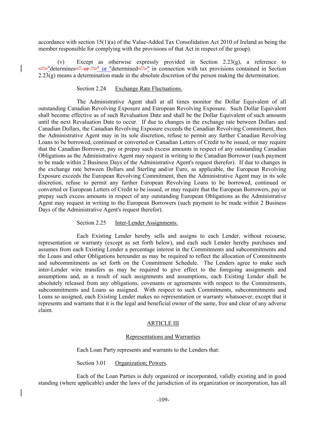 accordance with section 15(1)(a) of the Value-Added Tax Consolidation Act 2010 of Ireland as being the member responsible for complying with the provisions of that Act in respect of the group). (v) Except as otherwise expressly provided in Section 2.23(g), a reference to <“>"determines<” or “>" or "determined<”>" in connection with tax provisions contained in Section 2.23(g) means a determination made in the absolute discretion of the person making the determination. Section 2.24 Exchange Rate Fluctuations. The Administrative Agent shall at all times monitor the Dollar Equivalent of all outstanding Canadian Revolving Exposure and European Revolving Exposure. Such Dollar Equivalent shall become effective as of such Revaluation Date and shall be the Dollar Equivalent of such amounts until the next Revaluation Date to occur. If due to changes in the exchange rate between Dollars and Canadian Dollars, the Canadian Revolving Exposure exceeds the Canadian Revolving Commitment, then the Administrative Agent may in its sole discretion, refuse to permit any further Canadian Revolving Loans to be borrowed, continued or converted or Canadian Letters of Credit to be issued, or may require that the Canadian Borrower, pay or prepay such excess amounts in respect of any outstanding Canadian Obligations as the Administrative Agent may request in writing to the Canadian Borrower (such payment to be made within 2 Business Days of the Administrative Agent's request therefor). If due to changes in the exchange rate between Dollars and Sterling and/or Euro, as applicable, the European Revolving Exposure exceeds the European Revolving Commitment, then the Administrative Agent may in its sole discretion, refuse to permit any further European Revolving Loans to be borrowed, continued or converted or European Letters of Credit to be issued, or may require that the European Borrowers, pay or prepay such excess amounts in respect of any outstanding European Obligations as the Administrative Agent may request in writing to the European Borrowers (such payment to be made within 2 Business Days of the Administrative Agent's request therefor). Section 2.25 Inter-Lender Assignments. Each Existing Lender hereby sells and assigns to each Lender, without recourse, representation or warranty (except as set forth below), and each such Lender hereby purchases and assumes from each Existing Lender a percentage interest in the Commitments and subcommitments and the Loans and other Obligations hereunder as may be required to reflect the allocation of Commitments and subcommitments as set forth on the Commitment Schedule. The Lenders agree to make such inter-Lender wire transfers as may be required to give effect to the foregoing assignments and assumptions and, as a result of such assignments and assumptions, each Existing Lender shall be absolutely released from any obligations, covenants or agreements with respect to the Commitments, subcommitments and Loans so assigned. With respect to such Commitments, subcommitments and Loans so assigned, each Existing Lender makes no representation or warranty whatsoever, except that it represents and warrants that it is the legal and beneficial owner of the same, free and clear of any adverse claim. ARTICLE III Representations and Warranties Each Loan Party represents and warrants to the Lenders that: Section 3.01 Organization; Powers. Each of the Loan Parties is duly organized or incorporated, validly existing and in good standing (where applicable) under the laws of the jurisdiction of its organization or incorporation, has all -109-