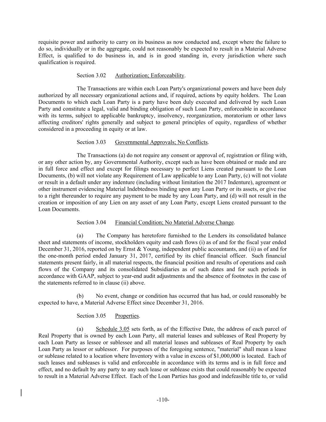 requisite power and authority to carry on its business as now conducted and, except where the failure to do so, individually or in the aggregate, could not reasonably be expected to result in a Material Adverse Effect, is qualified to do business in, and is in good standing in, every jurisdiction where such qualification is required. Section 3.02 Authorization; Enforceability. The Transactions are within each Loan Party's organizational powers and have been duly authorized by all necessary organizational actions and, if required, actions by equity holders. The Loan Documents to which each Loan Party is a party have been duly executed and delivered by such Loan Party and constitute a legal, valid and binding obligation of such Loan Party, enforceable in accordance with its terms, subject to applicable bankruptcy, insolvency, reorganization, moratorium or other laws affecting creditors' rights generally and subject to general principles of equity, regardless of whether considered in a proceeding in equity or at law. Section 3.03 Governmental Approvals; No Conflicts. The Transactions (a) do not require any consent or approval of, registration or filing with, or any other action by, any Governmental Authority, except such as have been obtained or made and are in full force and effect and except for filings necessary to perfect Liens created pursuant to the Loan Documents, (b) will not violate any Requirement of Law applicable to any Loan Party, (c) will not violate or result in a default under any indenture (including without limitation the 2017 Indenture), agreement or other instrument evidencing Material Indebtedness binding upon any Loan Party or its assets, or give rise to a right thereunder to require any payment to be made by any Loan Party, and (d) will not result in the creation or imposition of any Lien on any asset of any Loan Party, except Liens created pursuant to the Loan Documents. Section 3.04 Financial Condition; No Material Adverse Change. (a) The Company has heretofore furnished to the Lenders its consolidated balance sheet and statements of income, stockholders equity and cash flows (i) as of and for the fiscal year ended December 31, 2016, reported on by Ernst & Young, independent public accountants, and (ii) as of and for the one-month period ended January 31, 2017, certified by its chief financial officer. Such financial statements present fairly, in all material respects, the financial position and results of operations and cash flows of the Company and its consolidated Subsidiaries as of such dates and for such periods in accordance with GAAP, subject to year-end audit adjustments and the absence of footnotes in the case of the statements referred to in clause (ii) above. (b) No event, change or condition has occurred that has had, or could reasonably be expected to have, a Material Adverse Effect since December 31, 2016. Section 3.05 Properties. (a) Schedule 3.05 sets forth, as of the Effective Date, the address of each parcel of Real Property that is owned by each Loan Party, all material leases and subleases of Real Property by each Loan Party as lessee or sublessee and all material leases and subleases of Real Property by each Loan Party as lessor or sublessor. For purposes of the foregoing sentence, "material" shall mean a lease or sublease related to a location where Inventory with a value in excess of $1,000,000 is located. Each of such leases and subleases is valid and enforceable in accordance with its terms and is in full force and effect, and no default by any party to any such lease or sublease exists that could reasonably be expected to result in a Material Adverse Effect. Each of the Loan Parties has good and indefeasible title to, or valid -110-