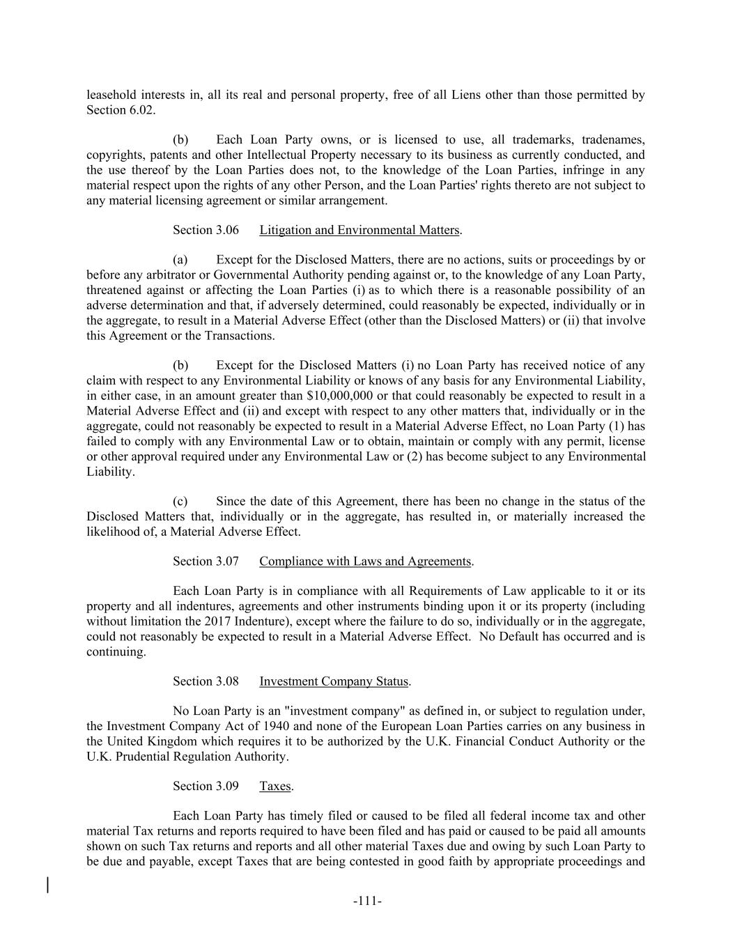 leasehold interests in, all its real and personal property, free of all Liens other than those permitted by Section 6.02. (b) Each Loan Party owns, or is licensed to use, all trademarks, tradenames, copyrights, patents and other Intellectual Property necessary to its business as currently conducted, and the use thereof by the Loan Parties does not, to the knowledge of the Loan Parties, infringe in any material respect upon the rights of any other Person, and the Loan Parties' rights thereto are not subject to any material licensing agreement or similar arrangement. Section 3.06 Litigation and Environmental Matters. (a) Except for the Disclosed Matters, there are no actions, suits or proceedings by or before any arbitrator or Governmental Authority pending against or, to the knowledge of any Loan Party, threatened against or affecting the Loan Parties (i) as to which there is a reasonable possibility of an adverse determination and that, if adversely determined, could reasonably be expected, individually or in the aggregate, to result in a Material Adverse Effect (other than the Disclosed Matters) or (ii) that involve this Agreement or the Transactions. (b) Except for the Disclosed Matters (i) no Loan Party has received notice of any claim with respect to any Environmental Liability or knows of any basis for any Environmental Liability, in either case, in an amount greater than $10,000,000 or that could reasonably be expected to result in a Material Adverse Effect and (ii) and except with respect to any other matters that, individually or in the aggregate, could not reasonably be expected to result in a Material Adverse Effect, no Loan Party (1) has failed to comply with any Environmental Law or to obtain, maintain or comply with any permit, license or other approval required under any Environmental Law or (2) has become subject to any Environmental Liability. (c) Since the date of this Agreement, there has been no change in the status of the Disclosed Matters that, individually or in the aggregate, has resulted in, or materially increased the likelihood of, a Material Adverse Effect. Section 3.07 Compliance with Laws and Agreements. Each Loan Party is in compliance with all Requirements of Law applicable to it or its property and all indentures, agreements and other instruments binding upon it or its property (including without limitation the 2017 Indenture), except where the failure to do so, individually or in the aggregate, could not reasonably be expected to result in a Material Adverse Effect. No Default has occurred and is continuing. Section 3.08 Investment Company Status. No Loan Party is an "investment company" as defined in, or subject to regulation under, the Investment Company Act of 1940 and none of the European Loan Parties carries on any business in the United Kingdom which requires it to be authorized by the U.K. Financial Conduct Authority or the U.K. Prudential Regulation Authority. Section 3.09 Taxes. Each Loan Party has timely filed or caused to be filed all federal income tax and other material Tax returns and reports required to have been filed and has paid or caused to be paid all amounts shown on such Tax returns and reports and all other material Taxes due and owing by such Loan Party to be due and payable, except Taxes that are being contested in good faith by appropriate proceedings and -111-