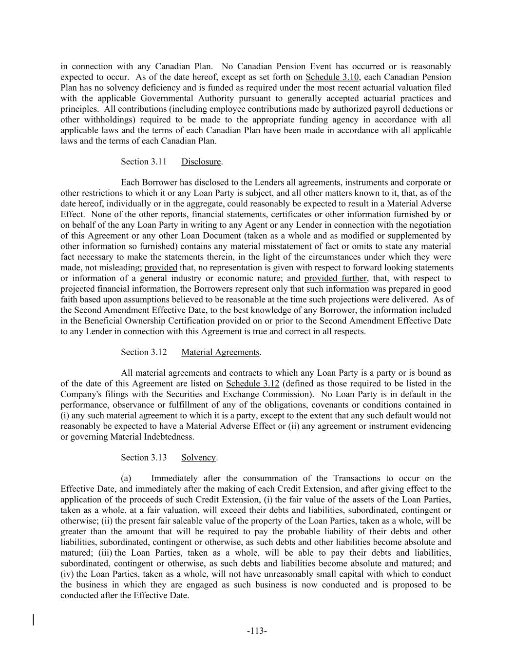 in connection with any Canadian Plan. No Canadian Pension Event has occurred or is reasonably expected to occur. As of the date hereof, except as set forth on Schedule 3.10, each Canadian Pension Plan has no solvency deficiency and is funded as required under the most recent actuarial valuation filed with the applicable Governmental Authority pursuant to generally accepted actuarial practices and principles. All contributions (including employee contributions made by authorized payroll deductions or other withholdings) required to be made to the appropriate funding agency in accordance with all applicable laws and the terms of each Canadian Plan have been made in accordance with all applicable laws and the terms of each Canadian Plan. Section 3.11 Disclosure. Each Borrower has disclosed to the Lenders all agreements, instruments and corporate or other restrictions to which it or any Loan Party is subject, and all other matters known to it, that, as of the date hereof, individually or in the aggregate, could reasonably be expected to result in a Material Adverse Effect. None of the other reports, financial statements, certificates or other information furnished by or on behalf of the any Loan Party in writing to any Agent or any Lender in connection with the negotiation of this Agreement or any other Loan Document (taken as a whole and as modified or supplemented by other information so furnished) contains any material misstatement of fact or omits to state any material fact necessary to make the statements therein, in the light of the circumstances under which they were made, not misleading; provided that, no representation is given with respect to forward looking statements or information of a general industry or economic nature; and provided further, that, with respect to projected financial information, the Borrowers represent only that such information was prepared in good faith based upon assumptions believed to be reasonable at the time such projections were delivered. As of the Second Amendment Effective Date, to the best knowledge of any Borrower, the information included in the Beneficial Ownership Certification provided on or prior to the Second Amendment Effective Date to any Lender in connection with this Agreement is true and correct in all respects. Section 3.12 Material Agreements. All material agreements and contracts to which any Loan Party is a party or is bound as of the date of this Agreement are listed on Schedule 3.12 (defined as those required to be listed in the Company's filings with the Securities and Exchange Commission). No Loan Party is in default in the performance, observance or fulfillment of any of the obligations, covenants or conditions contained in (i) any such material agreement to which it is a party, except to the extent that any such default would not reasonably be expected to have a Material Adverse Effect or (ii) any agreement or instrument evidencing or governing Material Indebtedness. Section 3.13 Solvency. (a) Immediately after the consummation of the Transactions to occur on the Effective Date, and immediately after the making of each Credit Extension, and after giving effect to the application of the proceeds of such Credit Extension, (i) the fair value of the assets of the Loan Parties, taken as a whole, at a fair valuation, will exceed their debts and liabilities, subordinated, contingent or otherwise; (ii) the present fair saleable value of the property of the Loan Parties, taken as a whole, will be greater than the amount that will be required to pay the probable liability of their debts and other liabilities, subordinated, contingent or otherwise, as such debts and other liabilities become absolute and matured; (iii) the Loan Parties, taken as a whole, will be able to pay their debts and liabilities, subordinated, contingent or otherwise, as such debts and liabilities become absolute and matured; and (iv) the Loan Parties, taken as a whole, will not have unreasonably small capital with which to conduct the business in which they are engaged as such business is now conducted and is proposed to be conducted after the Effective Date. -113-