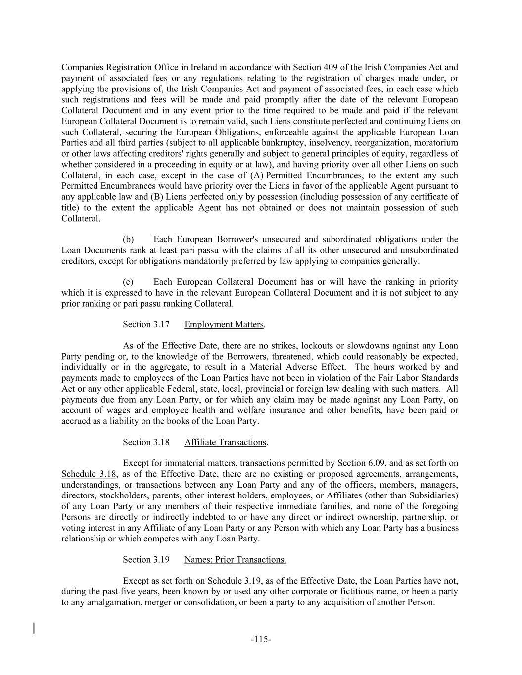 Companies Registration Office in Ireland in accordance with Section 409 of the Irish Companies Act and payment of associated fees or any regulations relating to the registration of charges made under, or applying the provisions of, the Irish Companies Act and payment of associated fees, in each case which such registrations and fees will be made and paid promptly after the date of the relevant European Collateral Document and in any event prior to the time required to be made and paid if the relevant European Collateral Document is to remain valid, such Liens constitute perfected and continuing Liens on such Collateral, securing the European Obligations, enforceable against the applicable European Loan Parties and all third parties (subject to all applicable bankruptcy, insolvency, reorganization, moratorium or other laws affecting creditors' rights generally and subject to general principles of equity, regardless of whether considered in a proceeding in equity or at law), and having priority over all other Liens on such Collateral, in each case, except in the case of (A) Permitted Encumbrances, to the extent any such Permitted Encumbrances would have priority over the Liens in favor of the applicable Agent pursuant to any applicable law and (B) Liens perfected only by possession (including possession of any certificate of title) to the extent the applicable Agent has not obtained or does not maintain possession of such Collateral. (b) Each European Borrower's unsecured and subordinated obligations under the Loan Documents rank at least pari passu with the claims of all its other unsecured and unsubordinated creditors, except for obligations mandatorily preferred by law applying to companies generally. (c) Each European Collateral Document has or will have the ranking in priority which it is expressed to have in the relevant European Collateral Document and it is not subject to any prior ranking or pari passu ranking Collateral. Section 3.17 Employment Matters. As of the Effective Date, there are no strikes, lockouts or slowdowns against any Loan Party pending or, to the knowledge of the Borrowers, threatened, which could reasonably be expected, individually or in the aggregate, to result in a Material Adverse Effect. The hours worked by and payments made to employees of the Loan Parties have not been in violation of the Fair Labor Standards Act or any other applicable Federal, state, local, provincial or foreign law dealing with such matters. All payments due from any Loan Party, or for which any claim may be made against any Loan Party, on account of wages and employee health and welfare insurance and other benefits, have been paid or accrued as a liability on the books of the Loan Party. Section 3.18 Affiliate Transactions. Except for immaterial matters, transactions permitted by Section 6.09, and as set forth on Schedule 3.18, as of the Effective Date, there are no existing or proposed agreements, arrangements, understandings, or transactions between any Loan Party and any of the officers, members, managers, directors, stockholders, parents, other interest holders, employees, or Affiliates (other than Subsidiaries) of any Loan Party or any members of their respective immediate families, and none of the foregoing Persons are directly or indirectly indebted to or have any direct or indirect ownership, partnership, or voting interest in any Affiliate of any Loan Party or any Person with which any Loan Party has a business relationship or which competes with any Loan Party. Section 3.19 Names; Prior Transactions. Except as set forth on Schedule 3.19, as of the Effective Date, the Loan Parties have not, during the past five years, been known by or used any other corporate or fictitious name, or been a party to any amalgamation, merger or consolidation, or been a party to any acquisition of another Person. -115-