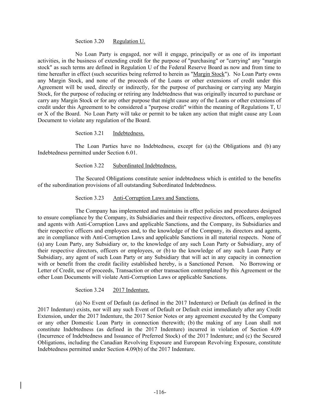 Section 3.20 Regulation U. No Loan Party is engaged, nor will it engage, principally or as one of its important activities, in the business of extending credit for the purpose of "purchasing" or "carrying" any "margin stock" as such terms are defined in Regulation U of the Federal Reserve Board as now and from time to time hereafter in effect (such securities being referred to herein as "Margin Stock"). No Loan Party owns any Margin Stock, and none of the proceeds of the Loans or other extensions of credit under this Agreement will be used, directly or indirectly, for the purpose of purchasing or carrying any Margin Stock, for the purpose of reducing or retiring any Indebtedness that was originally incurred to purchase or carry any Margin Stock or for any other purpose that might cause any of the Loans or other extensions of credit under this Agreement to be considered a "purpose credit" within the meaning of Regulations T, U or X of the Board. No Loan Party will take or permit to be taken any action that might cause any Loan Document to violate any regulation of the Board. Section 3.21 Indebtedness. The Loan Parties have no Indebtedness, except for (a) the Obligations and (b) any Indebtedness permitted under Section 6.01. Section 3.22 Subordinated Indebtedness. The Secured Obligations constitute senior indebtedness which is entitled to the benefits of the subordination provisions of all outstanding Subordinated Indebtedness. Section 3.23 Anti-Corruption Laws and Sanctions. The Company has implemented and maintains in effect policies and procedures designed to ensure compliance by the Company, its Subsidiaries and their respective directors, officers, employees and agents with Anti-Corruption Laws and applicable Sanctions, and the Company, its Subsidiaries and their respective officers and employees and, to the knowledge of the Company, its directors and agents, are in compliance with Anti-Corruption Laws and applicable Sanctions in all material respects. None of (a) any Loan Party, any Subsidiary or, to the knowledge of any such Loan Party or Subsidiary, any of their respective directors, officers or employees, or (b) to the knowledge of any such Loan Party or Subsidiary, any agent of such Loan Party or any Subsidiary that will act in any capacity in connection with or benefit from the credit facility established hereby, is a Sanctioned Person. No Borrowing or Letter of Credit, use of proceeds, Transaction or other transaction contemplated by this Agreement or the other Loan Documents will violate Anti-Corruption Laws or applicable Sanctions. Section 3.24 2017 Indenture. (a) No Event of Default (as defined in the 2017 Indenture) or Default (as defined in the 2017 Indenture) exists, nor will any such Event of Default or Default exist immediately after any Credit Extension, under the 2017 Indenture, the 2017 Senior Notes or any agreement executed by the Company or any other Domestic Loan Party in connection therewith; (b) the making of any Loan shall not constitute Indebtedness (as defined in the 2017 Indenture) incurred in violation of Section 4.09 (Incurrence of Indebtedness and Issuance of Preferred Stock) of the 2017 Indenture; and (c) the Secured Obligations, including the Canadian Revolving Exposure and European Revolving Exposure, constitute Indebtedness permitted under Section 4.09(b) of the 2017 Indenture. -116-