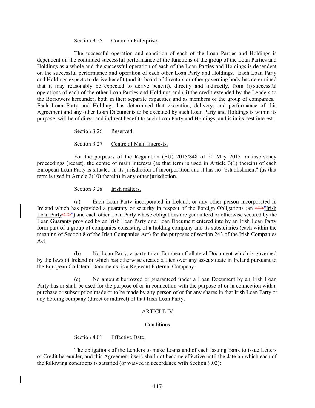 Section 3.25 Common Enterprise. The successful operation and condition of each of the Loan Parties and Holdings is dependent on the continued successful performance of the functions of the group of the Loan Parties and Holdings as a whole and the successful operation of each of the Loan Parties and Holdings is dependent on the successful performance and operation of each other Loan Party and Holdings. Each Loan Party and Holdings expects to derive benefit (and its board of directors or other governing body has determined that it may reasonably be expected to derive benefit), directly and indirectly, from (i) successful operations of each of the other Loan Parties and Holdings and (ii) the credit extended by the Lenders to the Borrowers hereunder, both in their separate capacities and as members of the group of companies. Each Loan Party and Holdings has determined that execution, delivery, and performance of this Agreement and any other Loan Documents to be executed by such Loan Party and Holdings is within its purpose, will be of direct and indirect benefit to such Loan Party and Holdings, and is in its best interest. Section 3.26 Reserved. Section 3.27 Centre of Main Interests. For the purposes of the Regulation (EU) 2015/848 of 20 May 2015 on insolvency proceedings (recast), the centre of main interests (as that term is used in Article 3(1) therein) of each European Loan Party is situated in its jurisdiction of incorporation and it has no "establishment" (as that term is used in Article 2(10) therein) in any other jurisdiction. Section 3.28 Irish matters. (a) Each Loan Party incorporated in Ireland, or any other person incorporated in Ireland which has provided a guaranty or security in respect of the Foreign Obligations (an <“>"Irish Loan Party<”>") and each other Loan Party whose obligations are guaranteed or otherwise secured by the Loan Guaranty provided by an Irish Loan Party or a Loan Document entered into by an Irish Loan Party form part of a group of companies consisting of a holding company and its subsidiaries (each within the meaning of Section 8 of the Irish Companies Act) for the purposes of section 243 of the Irish Companies Act. (b) No Loan Party, a party to an European Collateral Document which is governed by the laws of Ireland or which has otherwise created a Lien over any asset situate in Ireland pursuant to the European Collateral Documents, is a Relevant External Company. (c) No amount borrowed or guaranteed under a Loan Document by an Irish Loan Party has or shall be used for the purpose of or in connection with the purpose of or in connection with a purchase or subscription made or to be made by any person of or for any shares in that Irish Loan Party or any holding company (direct or indirect) of that Irish Loan Party. ARTICLE IV Conditions Section 4.01 Effective Date. The obligations of the Lenders to make Loans and of each Issuing Bank to issue Letters of Credit hereunder, and this Agreement itself, shall not become effective until the date on which each of the following conditions is satisfied (or waived in accordance with Section 9.02): -117-