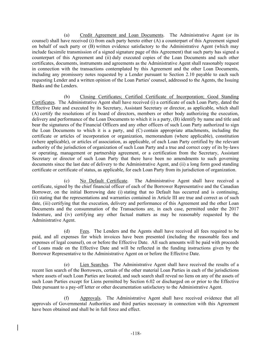 (a) Credit Agreement and Loan Documents. The Administrative Agent (or its counsel) shall have received (i) from each party hereto either (A) a counterpart of this Agreement signed on behalf of such party or (B) written evidence satisfactory to the Administrative Agent (which may include facsimile transmission of a signed signature page of this Agreement) that such party has signed a counterpart of this Agreement and (ii) duly executed copies of the Loan Documents and such other certificates, documents, instruments and agreements as the Administrative Agent shall reasonably request in connection with the transactions contemplated by this Agreement and the other Loan Documents, including any promissory notes requested by a Lender pursuant to Section 2.10 payable to each such requesting Lender and a written opinion of the Loan Parties' counsel, addressed to the Agents, the Issuing Banks and the Lenders. (b) Closing Certificates; Certified Certificate of Incorporation; Good Standing Certificates. The Administrative Agent shall have received (i) a certificate of each Loan Party, dated the Effective Date and executed by its Secretary, Assistant Secretary or director, as applicable, which shall (A) certify the resolutions of its board of directors, members or other body authorizing the execution, delivery and performance of the Loan Documents to which it is a party, (B) identify by name and title and bear the signatures of the Financial Officers and any other officers of such Loan Party authorized to sign the Loan Documents to which it is a party, and (C) contain appropriate attachments, including the certificate or articles of incorporation or organization, memorandum (where applicable), constitution (where applicable), or articles of association, as applicable, of each Loan Party certified by the relevant authority of the jurisdiction of organization of such Loan Party and a true and correct copy of its by-laws or operating, management or partnership agreement, or a certification from the Secretary, Assistant Secretary or director of such Loan Party that there have been no amendments to such governing documents since the last date of delivery to the Administrative Agent, and (ii) a long form good standing certificate or certificate of status, as applicable, for each Loan Party from its jurisdiction of organization. (c) No Default Certificate. The Administrative Agent shall have received a certificate, signed by the chief financial officer of each of the Borrower Representative and the Canadian Borrower, on the initial Borrowing date (i) stating that no Default has occurred and is continuing, (ii) stating that the representations and warranties contained in Article III are true and correct as of such date, (iii) certifying that the execution, delivery and performance of this Agreement and the other Loan Documents and the consummation of the Transactions are, in each case, permitted under the 2017 Indenture, and (iv) certifying any other factual matters as may be reasonably requested by the Administrative Agent. (d) Fees. The Lenders and the Agents shall have received all fees required to be paid, and all expenses for which invoices have been presented (including the reasonable fees and expenses of legal counsel), on or before the Effective Date. All such amounts will be paid with proceeds of Loans made on the Effective Date and will be reflected in the funding instructions given by the Borrower Representative to the Administrative Agent on or before the Effective Date. (e) Lien Searches. The Administrative Agent shall have received the results of a recent lien search of the Borrowers, certain of the other material Loan Parties in each of the jurisdictions where assets of such Loan Parties are located, and such search shall reveal no liens on any of the assets of such Loan Parties except for Liens permitted by Section 6.02 or discharged on or prior to the Effective Date pursuant to a pay-off letter or other documentation satisfactory to the Administrative Agent. (f) Approvals. The Administrative Agent shall have received evidence that all approvals of Governmental Authorities and third parties necessary in connection with this Agreement have been obtained and shall be in full force and effect. -118-