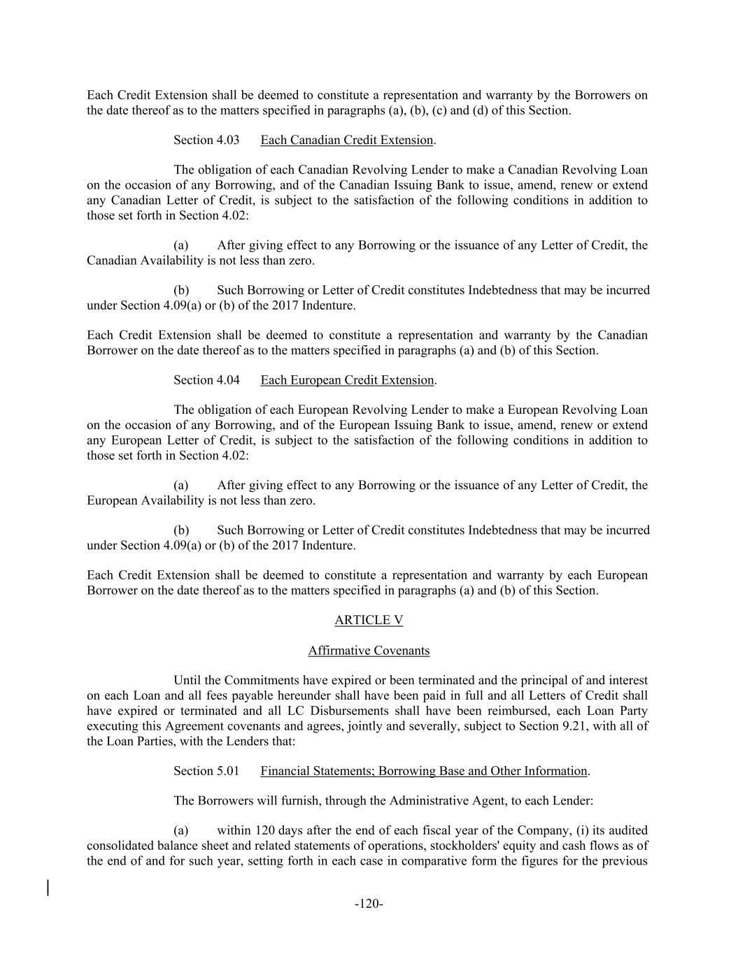 Each Credit Extension shall be deemed to constitute a representation and warranty by the Borrowers on the date thereof as to the matters specified in paragraphs (a), (b), (c) and (d) of this Section. Section 4.03 Each Canadian Credit Extension. The obligation of each Canadian Revolving Lender to make a Canadian Revolving Loan on the occasion of any Borrowing, and of the Canadian Issuing Bank to issue, amend, renew or extend any Canadian Letter of Credit, is subject to the satisfaction of the following conditions in addition to those set forth in Section 4.02: (a) After giving effect to any Borrowing or the issuance of any Letter of Credit, the Canadian Availability is not less than zero. (b) Such Borrowing or Letter of Credit constitutes Indebtedness that may be incurred under Section 4.09(a) or (b) of the 2017 Indenture. Each Credit Extension shall be deemed to constitute a representation and warranty by the Canadian Borrower on the date thereof as to the matters specified in paragraphs (a) and (b) of this Section. Section 4.04 Each European Credit Extension. The obligation of each European Revolving Lender to make a European Revolving Loan on the occasion of any Borrowing, and of the European Issuing Bank to issue, amend, renew or extend any European Letter of Credit, is subject to the satisfaction of the following conditions in addition to those set forth in Section 4.02: (a) After giving effect to any Borrowing or the issuance of any Letter of Credit, the European Availability is not less than zero. (b) Such Borrowing or Letter of Credit constitutes Indebtedness that may be incurred under Section 4.09(a) or (b) of the 2017 Indenture. Each Credit Extension shall be deemed to constitute a representation and warranty by each European Borrower on the date thereof as to the matters specified in paragraphs (a) and (b) of this Section. ARTICLE V Affirmative Covenants Until the Commitments have expired or been terminated and the principal of and interest on each Loan and all fees payable hereunder shall have been paid in full and all Letters of Credit shall have expired or terminated and all LC Disbursements shall have been reimbursed, each Loan Party executing this Agreement covenants and agrees, jointly and severally, subject to Section 9.21, with all of the Loan Parties, with the Lenders that: Section 5.01 Financial Statements; Borrowing Base and Other Information. The Borrowers will furnish, through the Administrative Agent, to each Lender: (a) within 120 days after the end of each fiscal year of the Company, (i) its audited consolidated balance sheet and related statements of operations, stockholders' equity and cash flows as of the end of and for such year, setting forth in each case in comparative form the figures for the previous -120-