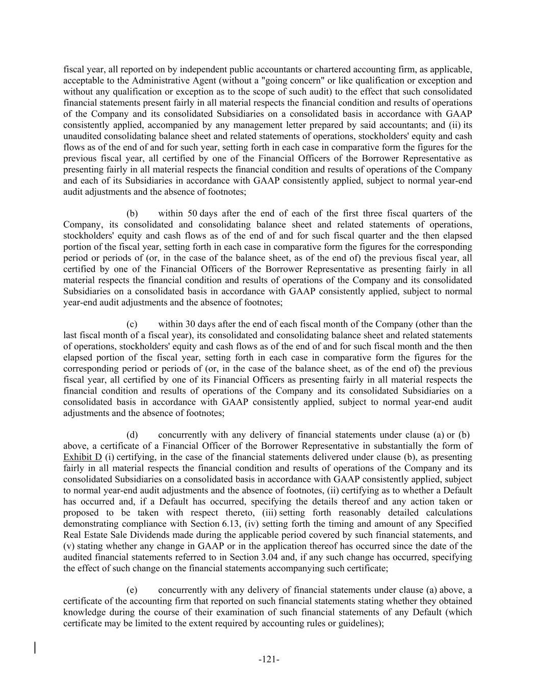 fiscal year, all reported on by independent public accountants or chartered accounting firm, as applicable, acceptable to the Administrative Agent (without a "going concern" or like qualification or exception and without any qualification or exception as to the scope of such audit) to the effect that such consolidated financial statements present fairly in all material respects the financial condition and results of operations of the Company and its consolidated Subsidiaries on a consolidated basis in accordance with GAAP consistently applied, accompanied by any management letter prepared by said accountants; and (ii) its unaudited consolidating balance sheet and related statements of operations, stockholders' equity and cash flows as of the end of and for such year, setting forth in each case in comparative form the figures for the previous fiscal year, all certified by one of the Financial Officers of the Borrower Representative as presenting fairly in all material respects the financial condition and results of operations of the Company and each of its Subsidiaries in accordance with GAAP consistently applied, subject to normal year-end audit adjustments and the absence of footnotes; (b) within 50 days after the end of each of the first three fiscal quarters of the Company, its consolidated and consolidating balance sheet and related statements of operations, stockholders' equity and cash flows as of the end of and for such fiscal quarter and the then elapsed portion of the fiscal year, setting forth in each case in comparative form the figures for the corresponding period or periods of (or, in the case of the balance sheet, as of the end of) the previous fiscal year, all certified by one of the Financial Officers of the Borrower Representative as presenting fairly in all material respects the financial condition and results of operations of the Company and its consolidated Subsidiaries on a consolidated basis in accordance with GAAP consistently applied, subject to normal year-end audit adjustments and the absence of footnotes; (c) within 30 days after the end of each fiscal month of the Company (other than the last fiscal month of a fiscal year), its consolidated and consolidating balance sheet and related statements of operations, stockholders' equity and cash flows as of the end of and for such fiscal month and the then elapsed portion of the fiscal year, setting forth in each case in comparative form the figures for the corresponding period or periods of (or, in the case of the balance sheet, as of the end of) the previous fiscal year, all certified by one of its Financial Officers as presenting fairly in all material respects the financial condition and results of operations of the Company and its consolidated Subsidiaries on a consolidated basis in accordance with GAAP consistently applied, subject to normal year-end audit adjustments and the absence of footnotes; (d) concurrently with any delivery of financial statements under clause (a) or (b) above, a certificate of a Financial Officer of the Borrower Representative in substantially the form of Exhibit D (i) certifying, in the case of the financial statements delivered under clause (b), as presenting fairly in all material respects the financial condition and results of operations of the Company and its consolidated Subsidiaries on a consolidated basis in accordance with GAAP consistently applied, subject to normal year-end audit adjustments and the absence of footnotes, (ii) certifying as to whether a Default has occurred and, if a Default has occurred, specifying the details thereof and any action taken or proposed to be taken with respect thereto, (iii) setting forth reasonably detailed calculations demonstrating compliance with Section 6.13, (iv) setting forth the timing and amount of any Specified Real Estate Sale Dividends made during the applicable period covered by such financial statements, and (v) stating whether any change in GAAP or in the application thereof has occurred since the date of the audited financial statements referred to in Section 3.04 and, if any such change has occurred, specifying the effect of such change on the financial statements accompanying such certificate; (e) concurrently with any delivery of financial statements under clause (a) above, a certificate of the accounting firm that reported on such financial statements stating whether they obtained knowledge during the course of their examination of such financial statements of any Default (which certificate may be limited to the extent required by accounting rules or guidelines); -121-