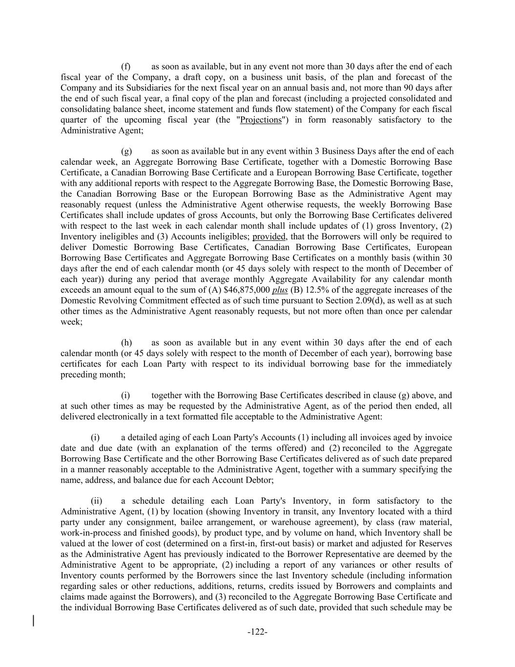 (f) as soon as available, but in any event not more than 30 days after the end of each fiscal year of the Company, a draft copy, on a business unit basis, of the plan and forecast of the Company and its Subsidiaries for the next fiscal year on an annual basis and, not more than 90 days after the end of such fiscal year, a final copy of the plan and forecast (including a projected consolidated and consolidating balance sheet, income statement and funds flow statement) of the Company for each fiscal quarter of the upcoming fiscal year (the "Projections") in form reasonably satisfactory to the Administrative Agent; (g) as soon as available but in any event within 3 Business Days after the end of each calendar week, an Aggregate Borrowing Base Certificate, together with a Domestic Borrowing Base Certificate, a Canadian Borrowing Base Certificate and a European Borrowing Base Certificate, together with any additional reports with respect to the Aggregate Borrowing Base, the Domestic Borrowing Base, the Canadian Borrowing Base or the European Borrowing Base as the Administrative Agent may reasonably request (unless the Administrative Agent otherwise requests, the weekly Borrowing Base Certificates shall include updates of gross Accounts, but only the Borrowing Base Certificates delivered with respect to the last week in each calendar month shall include updates of (1) gross Inventory, (2) Inventory ineligibles and (3) Accounts ineligibles; provided, that the Borrowers will only be required to deliver Domestic Borrowing Base Certificates, Canadian Borrowing Base Certificates, European Borrowing Base Certificates and Aggregate Borrowing Base Certificates on a monthly basis (within 30 days after the end of each calendar month (or 45 days solely with respect to the month of December of each year)) during any period that average monthly Aggregate Availability for any calendar month exceeds an amount equal to the sum of (A) $46,875,000 plus (B) 12.5% of the aggregate increases of the Domestic Revolving Commitment effected as of such time pursuant to Section 2.09(d), as well as at such other times as the Administrative Agent reasonably requests, but not more often than once per calendar week; (h) as soon as available but in any event within 30 days after the end of each calendar month (or 45 days solely with respect to the month of December of each year), borrowing base certificates for each Loan Party with respect to its individual borrowing base for the immediately preceding month; (i) together with the Borrowing Base Certificates described in clause (g) above, and at such other times as may be requested by the Administrative Agent, as of the period then ended, all delivered electronically in a text formatted file acceptable to the Administrative Agent: (i) a detailed aging of each Loan Party's Accounts (1) including all invoices aged by invoice date and due date (with an explanation of the terms offered) and (2) reconciled to the Aggregate Borrowing Base Certificate and the other Borrowing Base Certificates delivered as of such date prepared in a manner reasonably acceptable to the Administrative Agent, together with a summary specifying the name, address, and balance due for each Account Debtor; (ii) a schedule detailing each Loan Party's Inventory, in form satisfactory to the Administrative Agent, (1) by location (showing Inventory in transit, any Inventory located with a third party under any consignment, bailee arrangement, or warehouse agreement), by class (raw material, work-in-process and finished goods), by product type, and by volume on hand, which Inventory shall be valued at the lower of cost (determined on a first-in, first-out basis) or market and adjusted for Reserves as the Administrative Agent has previously indicated to the Borrower Representative are deemed by the Administrative Agent to be appropriate, (2) including a report of any variances or other results of Inventory counts performed by the Borrowers since the last Inventory schedule (including information regarding sales or other reductions, additions, returns, credits issued by Borrowers and complaints and claims made against the Borrowers), and (3) reconciled to the Aggregate Borrowing Base Certificate and the individual Borrowing Base Certificates delivered as of such date, provided that such schedule may be -122-
