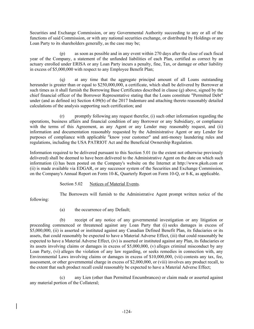 Securities and Exchange Commission, or any Governmental Authority succeeding to any or all of the functions of said Commission, or with any national securities exchange, or distributed by Holdings or any Loan Party to its shareholders generally, as the case may be; (p) as soon as possible and in any event within 270 days after the close of each fiscal year of the Company, a statement of the unfunded liabilities of each Plan, certified as correct by an actuary enrolled under ERISA or any Loan Party incurs a penalty, fine, Tax, or damage or other liability in excess of $5,000,000 with respect to any Employee Benefit Plan; (q) at any time that the aggregate principal amount of all Loans outstanding hereunder is greater than or equal to $250,000,000, a certificate, which shall be delivered by Borrower at such times as it shall furnish the Borrowing Base Certificates described in clause (g) above, signed by the chief financial officer of the Borrower Representative stating that the Loans constitute "Permitted Debt" under (and as defined in) Section 4.09(b) of the 2017 Indenture and attaching thereto reasonably detailed calculations of the analysis supporting such certification; and (r) promptly following any request therefor, (i) such other information regarding the operations, business affairs and financial condition of any Borrower or any Subsidiary, or compliance with the terms of this Agreement, as any Agent or any Lender may reasonably request, and (ii) information and documentation reasonably requested by the Administrative Agent or any Lender for purposes of compliance with applicable "know your customer" and anti-money laundering rules and regulations, including the USA PATRIOT Act and the Beneficial Ownership Regulation. Information required to be delivered pursuant to this Section 5.01 (to the extent not otherwise previously delivered) shall be deemed to have been delivered to the Administrative Agent on the date on which such information (i) has been posted on the Company's website on the Internet at http://www.pkoh.com or (ii) is made available via EDGAR, or any successor system of the Securities and Exchange Commission, on the Company's Annual Report on Form 10-K, Quarterly Report on Form 10-Q, or 8-K, as applicable. Section 5.02 Notices of Material Events. The Borrowers will furnish to the Administrative Agent prompt written notice of the following: (a) the occurrence of any Default; (b) receipt of any notice of any governmental investigation or any litigation or proceeding commenced or threatened against any Loan Party that (i) seeks damages in excess of $5,000,000, (ii) is asserted or instituted against any Canadian Defined Benefit Plan, its fiduciaries or its assets, that could reasonably be expected to have a Material Adverse Effect, (iii) that could reasonably be expected to have a Material Adverse Effect, (iv) is asserted or instituted against any Plan, its fiduciaries or its assets involving claims or damages in excess of $5,000,000, (v) alleges criminal misconduct by any Loan Party, (vi) alleges the violation of any law regarding, or seeks remedies in connection with, any Environmental Laws involving claims or damages in excess of $10,000,000, (vii) contests any tax, fee, assessment, or other governmental charge in excess of $2,000,000, or (viii) involves any product recall, to the extent that such product recall could reasonably be expected to have a Material Adverse Effect; (c) any Lien (other than Permitted Encumbrances) or claim made or asserted against any material portion of the Collateral; -124-