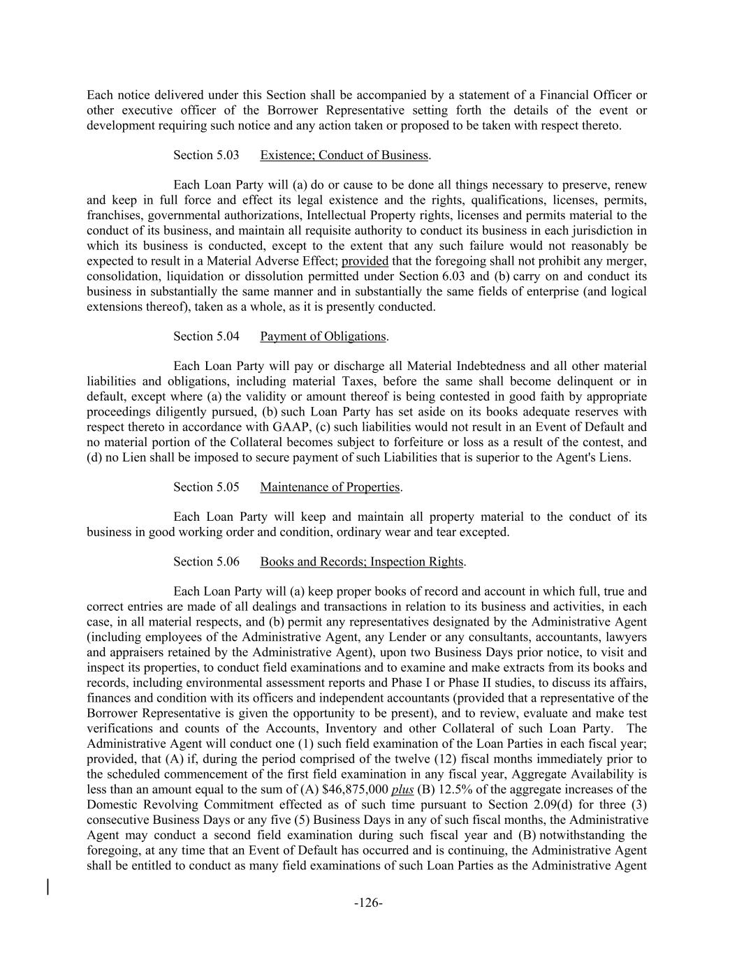 Each notice delivered under this Section shall be accompanied by a statement of a Financial Officer or other executive officer of the Borrower Representative setting forth the details of the event or development requiring such notice and any action taken or proposed to be taken with respect thereto. Section 5.03 Existence; Conduct of Business. Each Loan Party will (a) do or cause to be done all things necessary to preserve, renew and keep in full force and effect its legal existence and the rights, qualifications, licenses, permits, franchises, governmental authorizations, Intellectual Property rights, licenses and permits material to the conduct of its business, and maintain all requisite authority to conduct its business in each jurisdiction in which its business is conducted, except to the extent that any such failure would not reasonably be expected to result in a Material Adverse Effect; provided that the foregoing shall not prohibit any merger, consolidation, liquidation or dissolution permitted under Section 6.03 and (b) carry on and conduct its business in substantially the same manner and in substantially the same fields of enterprise (and logical extensions thereof), taken as a whole, as it is presently conducted. Section 5.04 Payment of Obligations. Each Loan Party will pay or discharge all Material Indebtedness and all other material liabilities and obligations, including material Taxes, before the same shall become delinquent or in default, except where (a) the validity or amount thereof is being contested in good faith by appropriate proceedings diligently pursued, (b) such Loan Party has set aside on its books adequate reserves with respect thereto in accordance with GAAP, (c) such liabilities would not result in an Event of Default and no material portion of the Collateral becomes subject to forfeiture or loss as a result of the contest, and (d) no Lien shall be imposed to secure payment of such Liabilities that is superior to the Agent's Liens. Section 5.05 Maintenance of Properties. Each Loan Party will keep and maintain all property material to the conduct of its business in good working order and condition, ordinary wear and tear excepted. Section 5.06 Books and Records; Inspection Rights. Each Loan Party will (a) keep proper books of record and account in which full, true and correct entries are made of all dealings and transactions in relation to its business and activities, in each case, in all material respects, and (b) permit any representatives designated by the Administrative Agent (including employees of the Administrative Agent, any Lender or any consultants, accountants, lawyers and appraisers retained by the Administrative Agent), upon two Business Days prior notice, to visit and inspect its properties, to conduct field examinations and to examine and make extracts from its books and records, including environmental assessment reports and Phase I or Phase II studies, to discuss its affairs, finances and condition with its officers and independent accountants (provided that a representative of the Borrower Representative is given the opportunity to be present), and to review, evaluate and make test verifications and counts of the Accounts, Inventory and other Collateral of such Loan Party. The Administrative Agent will conduct one (1) such field examination of the Loan Parties in each fiscal year; provided, that (A) if, during the period comprised of the twelve (12) fiscal months immediately prior to the scheduled commencement of the first field examination in any fiscal year, Aggregate Availability is less than an amount equal to the sum of (A) $46,875,000 plus (B) 12.5% of the aggregate increases of the Domestic Revolving Commitment effected as of such time pursuant to Section 2.09(d) for three (3) consecutive Business Days or any five (5) Business Days in any of such fiscal months, the Administrative Agent may conduct a second field examination during such fiscal year and (B) notwithstanding the foregoing, at any time that an Event of Default has occurred and is continuing, the Administrative Agent shall be entitled to conduct as many field examinations of such Loan Parties as the Administrative Agent -126-