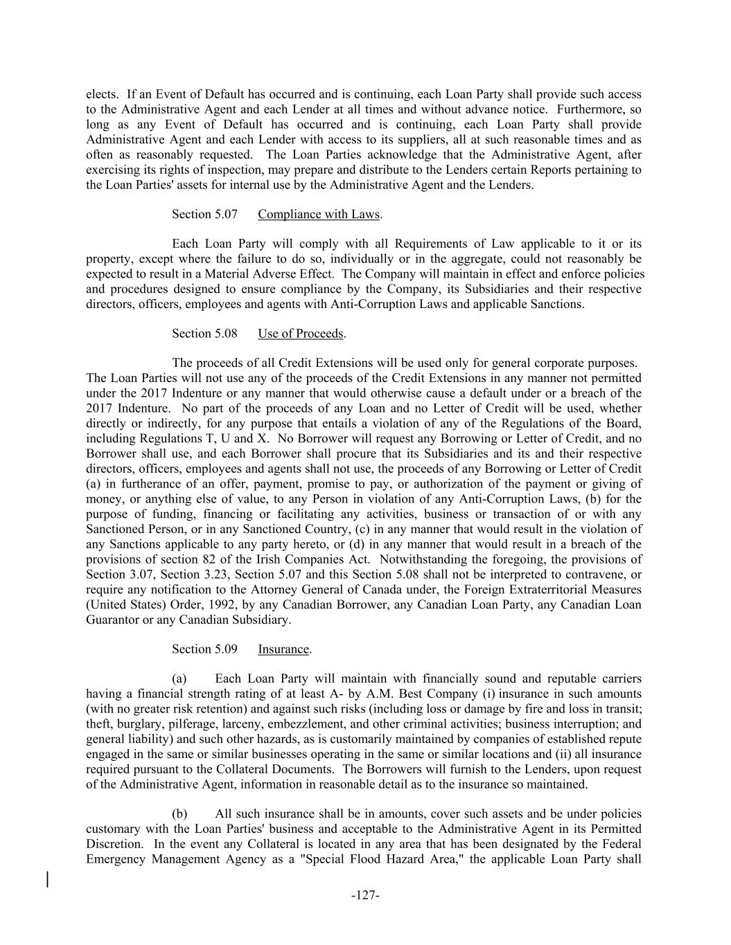 elects. If an Event of Default has occurred and is continuing, each Loan Party shall provide such access to the Administrative Agent and each Lender at all times and without advance notice. Furthermore, so long as any Event of Default has occurred and is continuing, each Loan Party shall provide Administrative Agent and each Lender with access to its suppliers, all at such reasonable times and as often as reasonably requested. The Loan Parties acknowledge that the Administrative Agent, after exercising its rights of inspection, may prepare and distribute to the Lenders certain Reports pertaining to the Loan Parties' assets for internal use by the Administrative Agent and the Lenders. Section 5.07 Compliance with Laws. Each Loan Party will comply with all Requirements of Law applicable to it or its property, except where the failure to do so, individually or in the aggregate, could not reasonably be expected to result in a Material Adverse Effect. The Company will maintain in effect and enforce policies and procedures designed to ensure compliance by the Company, its Subsidiaries and their respective directors, officers, employees and agents with Anti-Corruption Laws and applicable Sanctions. Section 5.08 Use of Proceeds. The proceeds of all Credit Extensions will be used only for general corporate purposes. The Loan Parties will not use any of the proceeds of the Credit Extensions in any manner not permitted under the 2017 Indenture or any manner that would otherwise cause a default under or a breach of the 2017 Indenture. No part of the proceeds of any Loan and no Letter of Credit will be used, whether directly or indirectly, for any purpose that entails a violation of any of the Regulations of the Board, including Regulations T, U and X. No Borrower will request any Borrowing or Letter of Credit, and no Borrower shall use, and each Borrower shall procure that its Subsidiaries and its and their respective directors, officers, employees and agents shall not use, the proceeds of any Borrowing or Letter of Credit (a) in furtherance of an offer, payment, promise to pay, or authorization of the payment or giving of money, or anything else of value, to any Person in violation of any Anti-Corruption Laws, (b) for the purpose of funding, financing or facilitating any activities, business or transaction of or with any Sanctioned Person, or in any Sanctioned Country, (c) in any manner that would result in the violation of any Sanctions applicable to any party hereto, or (d) in any manner that would result in a breach of the provisions of section 82 of the Irish Companies Act. Notwithstanding the foregoing, the provisions of Section 3.07, Section 3.23, Section 5.07 and this Section 5.08 shall not be interpreted to contravene, or require any notification to the Attorney General of Canada under, the Foreign Extraterritorial Measures (United States) Order, 1992, by any Canadian Borrower, any Canadian Loan Party, any Canadian Loan Guarantor or any Canadian Subsidiary. Section 5.09 Insurance. (a) Each Loan Party will maintain with financially sound and reputable carriers having a financial strength rating of at least A- by A.M. Best Company (i) insurance in such amounts (with no greater risk retention) and against such risks (including loss or damage by fire and loss in transit; theft, burglary, pilferage, larceny, embezzlement, and other criminal activities; business interruption; and general liability) and such other hazards, as is customarily maintained by companies of established repute engaged in the same or similar businesses operating in the same or similar locations and (ii) all insurance required pursuant to the Collateral Documents. The Borrowers will furnish to the Lenders, upon request of the Administrative Agent, information in reasonable detail as to the insurance so maintained. (b) All such insurance shall be in amounts, cover such assets and be under policies customary with the Loan Parties' business and acceptable to the Administrative Agent in its Permitted Discretion. In the event any Collateral is located in any area that has been designated by the Federal Emergency Management Agency as a "Special Flood Hazard Area," the applicable Loan Party shall -127-