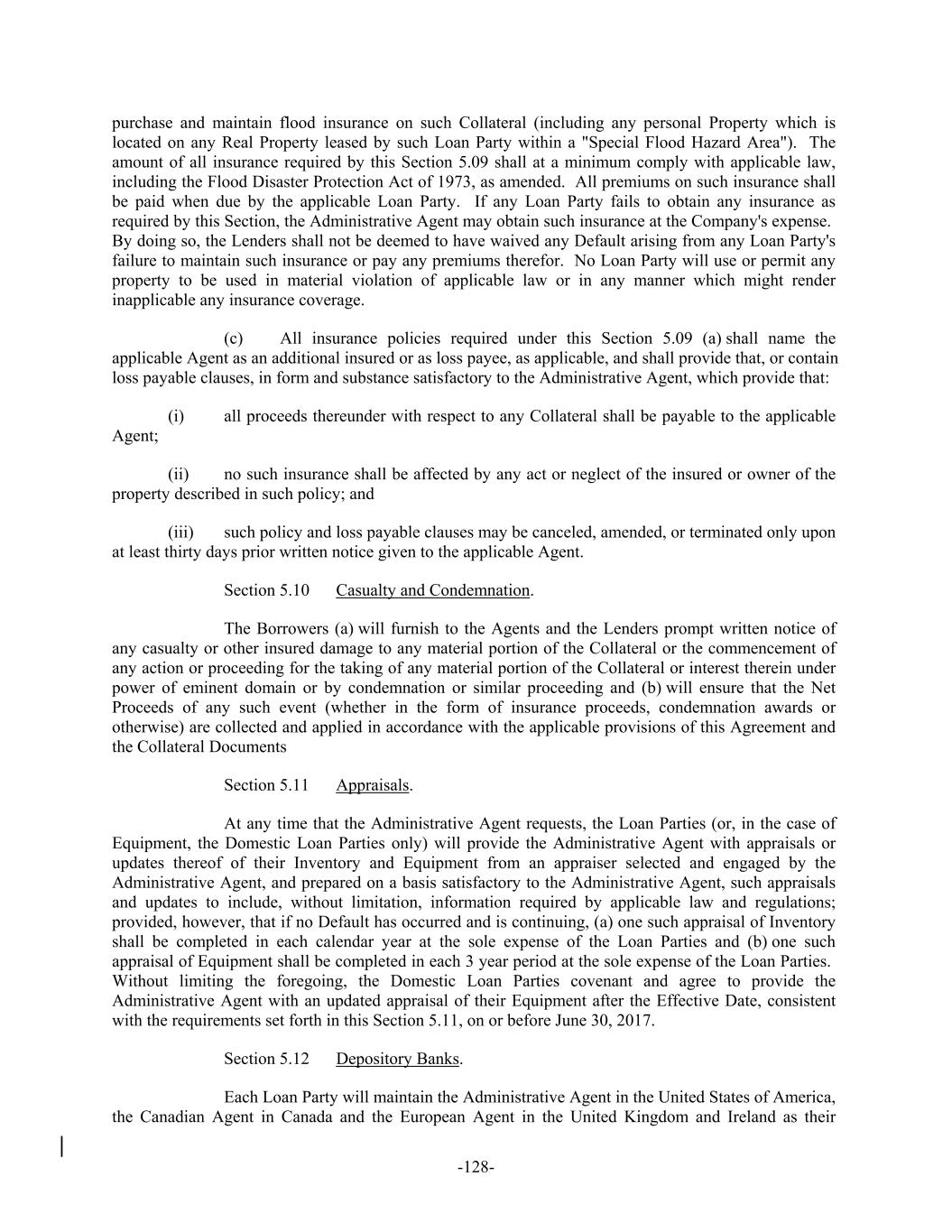 purchase and maintain flood insurance on such Collateral (including any personal Property which is located on any Real Property leased by such Loan Party within a "Special Flood Hazard Area"). The amount of all insurance required by this Section 5.09 shall at a minimum comply with applicable law, including the Flood Disaster Protection Act of 1973, as amended. All premiums on such insurance shall be paid when due by the applicable Loan Party. If any Loan Party fails to obtain any insurance as required by this Section, the Administrative Agent may obtain such insurance at the Company's expense. By doing so, the Lenders shall not be deemed to have waived any Default arising from any Loan Party's failure to maintain such insurance or pay any premiums therefor. No Loan Party will use or permit any property to be used in material violation of applicable law or in any manner which might render inapplicable any insurance coverage. (c) All insurance policies required under this Section 5.09 (a) shall name the applicable Agent as an additional insured or as loss payee, as applicable, and shall provide that, or contain loss payable clauses, in form and substance satisfactory to the Administrative Agent, which provide that: (i) all proceeds thereunder with respect to any Collateral shall be payable to the applicable Agent; (ii) no such insurance shall be affected by any act or neglect of the insured or owner of the property described in such policy; and (iii) such policy and loss payable clauses may be canceled, amended, or terminated only upon at least thirty days prior written notice given to the applicable Agent. Section 5.10 Casualty and Condemnation. The Borrowers (a) will furnish to the Agents and the Lenders prompt written notice of any casualty or other insured damage to any material portion of the Collateral or the commencement of any action or proceeding for the taking of any material portion of the Collateral or interest therein under power of eminent domain or by condemnation or similar proceeding and (b) will ensure that the Net Proceeds of any such event (whether in the form of insurance proceeds, condemnation awards or otherwise) are collected and applied in accordance with the applicable provisions of this Agreement and the Collateral Documents Section 5.11 Appraisals. At any time that the Administrative Agent requests, the Loan Parties (or, in the case of Equipment, the Domestic Loan Parties only) will provide the Administrative Agent with appraisals or updates thereof of their Inventory and Equipment from an appraiser selected and engaged by the Administrative Agent, and prepared on a basis satisfactory to the Administrative Agent, such appraisals and updates to include, without limitation, information required by applicable law and regulations; provided, however, that if no Default has occurred and is continuing, (a) one such appraisal of Inventory shall be completed in each calendar year at the sole expense of the Loan Parties and (b) one such appraisal of Equipment shall be completed in each 3 year period at the sole expense of the Loan Parties. Without limiting the foregoing, the Domestic Loan Parties covenant and agree to provide the Administrative Agent with an updated appraisal of their Equipment after the Effective Date, consistent with the requirements set forth in this Section 5.11, on or before June 30, 2017. Section 5.12 Depository Banks. Each Loan Party will maintain the Administrative Agent in the United States of America, the Canadian Agent in Canada and the European Agent in the United Kingdom and Ireland as their -128-