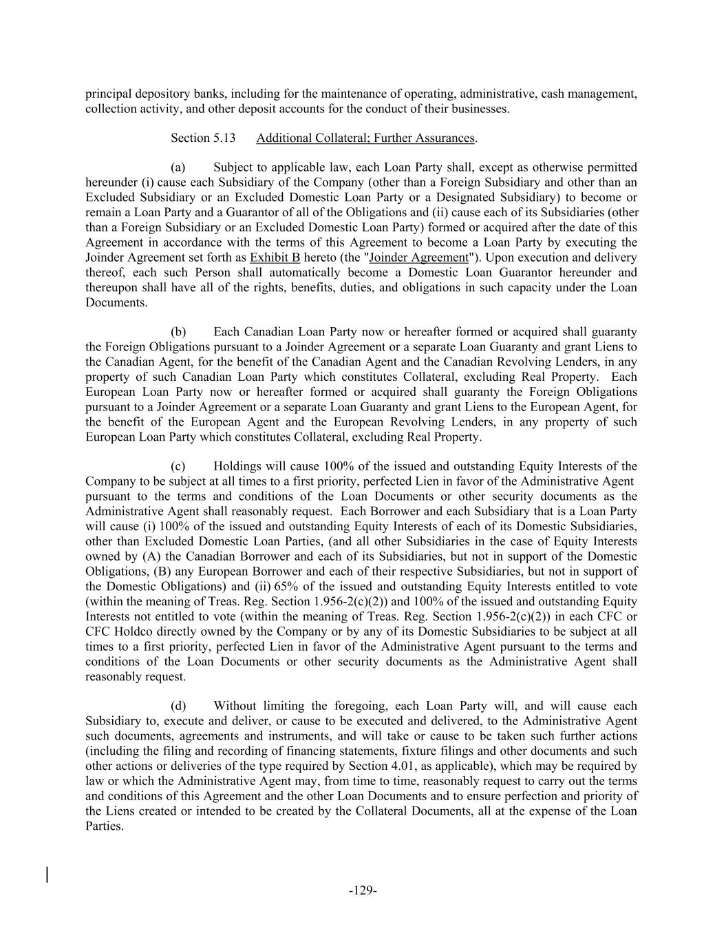 principal depository banks, including for the maintenance of operating, administrative, cash management, collection activity, and other deposit accounts for the conduct of their businesses. Section 5.13 Additional Collateral; Further Assurances. (a) Subject to applicable law, each Loan Party shall, except as otherwise permitted hereunder (i) cause each Subsidiary of the Company (other than a Foreign Subsidiary and other than an Excluded Subsidiary or an Excluded Domestic Loan Party or a Designated Subsidiary) to become or remain a Loan Party and a Guarantor of all of the Obligations and (ii) cause each of its Subsidiaries (other than a Foreign Subsidiary or an Excluded Domestic Loan Party) formed or acquired after the date of this Agreement in accordance with the terms of this Agreement to become a Loan Party by executing the Joinder Agreement set forth as Exhibit B hereto (the "Joinder Agreement"). Upon execution and delivery thereof, each such Person shall automatically become a Domestic Loan Guarantor hereunder and thereupon shall have all of the rights, benefits, duties, and obligations in such capacity under the Loan Documents. (b) Each Canadian Loan Party now or hereafter formed or acquired shall guaranty the Foreign Obligations pursuant to a Joinder Agreement or a separate Loan Guaranty and grant Liens to the Canadian Agent, for the benefit of the Canadian Agent and the Canadian Revolving Lenders, in any property of such Canadian Loan Party which constitutes Collateral, excluding Real Property. Each European Loan Party now or hereafter formed or acquired shall guaranty the Foreign Obligations pursuant to a Joinder Agreement or a separate Loan Guaranty and grant Liens to the European Agent, for the benefit of the European Agent and the European Revolving Lenders, in any property of such European Loan Party which constitutes Collateral, excluding Real Property. (c) Holdings will cause 100% of the issued and outstanding Equity Interests of the Company to be subject at all times to a first priority, perfected Lien in favor of the Administrative Agent pursuant to the terms and conditions of the Loan Documents or other security documents as the Administrative Agent shall reasonably request. Each Borrower and each Subsidiary that is a Loan Party will cause (i) 100% of the issued and outstanding Equity Interests of each of its Domestic Subsidiaries, other than Excluded Domestic Loan Parties, (and all other Subsidiaries in the case of Equity Interests owned by (A) the Canadian Borrower and each of its Subsidiaries, but not in support of the Domestic Obligations, (B) any European Borrower and each of their respective Subsidiaries, but not in support of the Domestic Obligations) and (ii) 65% of the issued and outstanding Equity Interests entitled to vote (within the meaning of Treas. Reg. Section 1.956-2(c)(2)) and 100% of the issued and outstanding Equity Interests not entitled to vote (within the meaning of Treas. Reg. Section 1.956-2(c)(2)) in each CFC or CFC Holdco directly owned by the Company or by any of its Domestic Subsidiaries to be subject at all times to a first priority, perfected Lien in favor of the Administrative Agent pursuant to the terms and conditions of the Loan Documents or other security documents as the Administrative Agent shall reasonably request. (d) Without limiting the foregoing, each Loan Party will, and will cause each Subsidiary to, execute and deliver, or cause to be executed and delivered, to the Administrative Agent such documents, agreements and instruments, and will take or cause to be taken such further actions (including the filing and recording of financing statements, fixture filings and other documents and such other actions or deliveries of the type required by Section 4.01, as applicable), which may be required by law or which the Administrative Agent may, from time to time, reasonably request to carry out the terms and conditions of this Agreement and the other Loan Documents and to ensure perfection and priority of the Liens created or intended to be created by the Collateral Documents, all at the expense of the Loan Parties. -129-