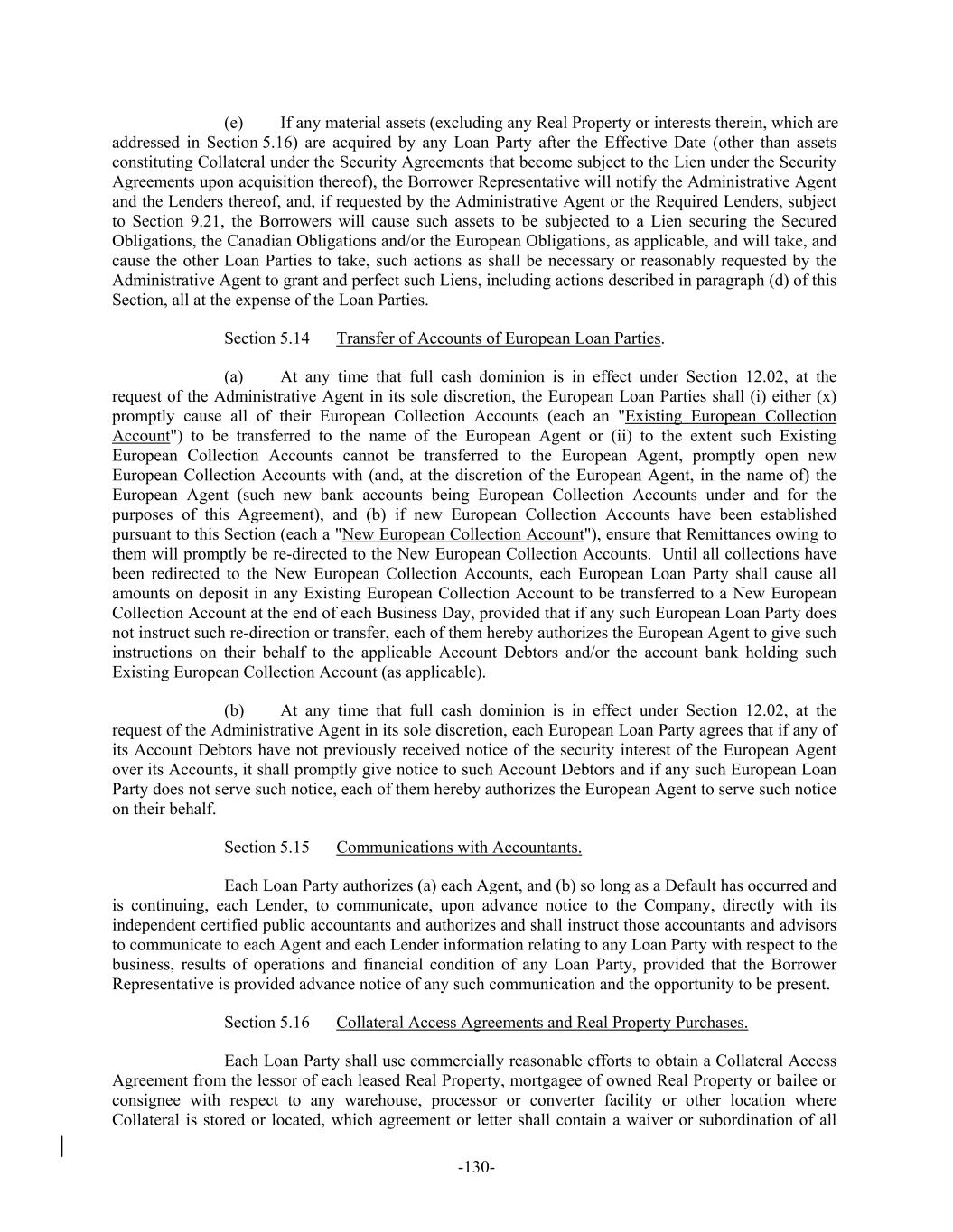 (e) If any material assets (excluding any Real Property or interests therein, which are addressed in Section 5.16) are acquired by any Loan Party after the Effective Date (other than assets constituting Collateral under the Security Agreements that become subject to the Lien under the Security Agreements upon acquisition thereof), the Borrower Representative will notify the Administrative Agent and the Lenders thereof, and, if requested by the Administrative Agent or the Required Lenders, subject to Section 9.21, the Borrowers will cause such assets to be subjected to a Lien securing the Secured Obligations, the Canadian Obligations and/or the European Obligations, as applicable, and will take, and cause the other Loan Parties to take, such actions as shall be necessary or reasonably requested by the Administrative Agent to grant and perfect such Liens, including actions described in paragraph (d) of this Section, all at the expense of the Loan Parties. Section 5.14 Transfer of Accounts of European Loan Parties. (a) At any time that full cash dominion is in effect under Section 12.02, at the request of the Administrative Agent in its sole discretion, the European Loan Parties shall (i) either (x) promptly cause all of their European Collection Accounts (each an "Existing European Collection Account") to be transferred to the name of the European Agent or (ii) to the extent such Existing European Collection Accounts cannot be transferred to the European Agent, promptly open new European Collection Accounts with (and, at the discretion of the European Agent, in the name of) the European Agent (such new bank accounts being European Collection Accounts under and for the purposes of this Agreement), and (b) if new European Collection Accounts have been established pursuant to this Section (each a "New European Collection Account"), ensure that Remittances owing to them will promptly be re-directed to the New European Collection Accounts. Until all collections have been redirected to the New European Collection Accounts, each European Loan Party shall cause all amounts on deposit in any Existing European Collection Account to be transferred to a New European Collection Account at the end of each Business Day, provided that if any such European Loan Party does not instruct such re-direction or transfer, each of them hereby authorizes the European Agent to give such instructions on their behalf to the applicable Account Debtors and/or the account bank holding such Existing European Collection Account (as applicable). (b) At any time that full cash dominion is in effect under Section 12.02, at the request of the Administrative Agent in its sole discretion, each European Loan Party agrees that if any of its Account Debtors have not previously received notice of the security interest of the European Agent over its Accounts, it shall promptly give notice to such Account Debtors and if any such European Loan Party does not serve such notice, each of them hereby authorizes the European Agent to serve such notice on their behalf. Section 5.15 Communications with Accountants. Each Loan Party authorizes (a) each Agent, and (b) so long as a Default has occurred and is continuing, each Lender, to communicate, upon advance notice to the Company, directly with its independent certified public accountants and authorizes and shall instruct those accountants and advisors to communicate to each Agent and each Lender information relating to any Loan Party with respect to the business, results of operations and financial condition of any Loan Party, provided that the Borrower Representative is provided advance notice of any such communication and the opportunity to be present. Section 5.16 Collateral Access Agreements and Real Property Purchases. Each Loan Party shall use commercially reasonable efforts to obtain a Collateral Access Agreement from the lessor of each leased Real Property, mortgagee of owned Real Property or bailee or consignee with respect to any warehouse, processor or converter facility or other location where Collateral is stored or located, which agreement or letter shall contain a waiver or subordination of all -130-