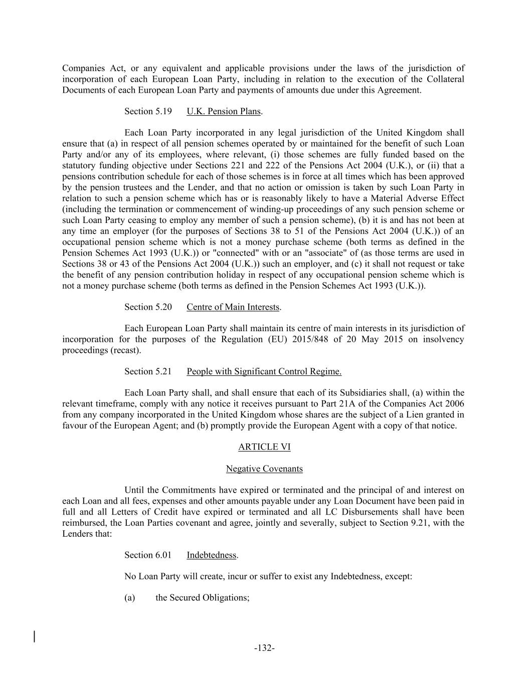 Companies Act, or any equivalent and applicable provisions under the laws of the jurisdiction of incorporation of each European Loan Party, including in relation to the execution of the Collateral Documents of each European Loan Party and payments of amounts due under this Agreement. Section 5.19 U.K. Pension Plans. Each Loan Party incorporated in any legal jurisdiction of the United Kingdom shall ensure that (a) in respect of all pension schemes operated by or maintained for the benefit of such Loan Party and/or any of its employees, where relevant, (i) those schemes are fully funded based on the statutory funding objective under Sections 221 and 222 of the Pensions Act 2004 (U.K.), or (ii) that a pensions contribution schedule for each of those schemes is in force at all times which has been approved by the pension trustees and the Lender, and that no action or omission is taken by such Loan Party in relation to such a pension scheme which has or is reasonably likely to have a Material Adverse Effect (including the termination or commencement of winding-up proceedings of any such pension scheme or such Loan Party ceasing to employ any member of such a pension scheme), (b) it is and has not been at any time an employer (for the purposes of Sections 38 to 51 of the Pensions Act 2004 (U.K.)) of an occupational pension scheme which is not a money purchase scheme (both terms as defined in the Pension Schemes Act 1993 (U.K.)) or "connected" with or an "associate" of (as those terms are used in Sections 38 or 43 of the Pensions Act 2004 (U.K.)) such an employer, and (c) it shall not request or take the benefit of any pension contribution holiday in respect of any occupational pension scheme which is not a money purchase scheme (both terms as defined in the Pension Schemes Act 1993 (U.K.)). Section 5.20 Centre of Main Interests. Each European Loan Party shall maintain its centre of main interests in its jurisdiction of incorporation for the purposes of the Regulation (EU) 2015/848 of 20 May 2015 on insolvency proceedings (recast). Section 5.21 People with Significant Control Regime. Each Loan Party shall, and shall ensure that each of its Subsidiaries shall, (a) within the relevant timeframe, comply with any notice it receives pursuant to Part 21A of the Companies Act 2006 from any company incorporated in the United Kingdom whose shares are the subject of a Lien granted in favour of the European Agent; and (b) promptly provide the European Agent with a copy of that notice. ARTICLE VI Negative Covenants Until the Commitments have expired or terminated and the principal of and interest on each Loan and all fees, expenses and other amounts payable under any Loan Document have been paid in full and all Letters of Credit have expired or terminated and all LC Disbursements shall have been reimbursed, the Loan Parties covenant and agree, jointly and severally, subject to Section 9.21, with the Lenders that: Section 6.01 Indebtedness. No Loan Party will create, incur or suffer to exist any Indebtedness, except: (a) the Secured Obligations; -132-