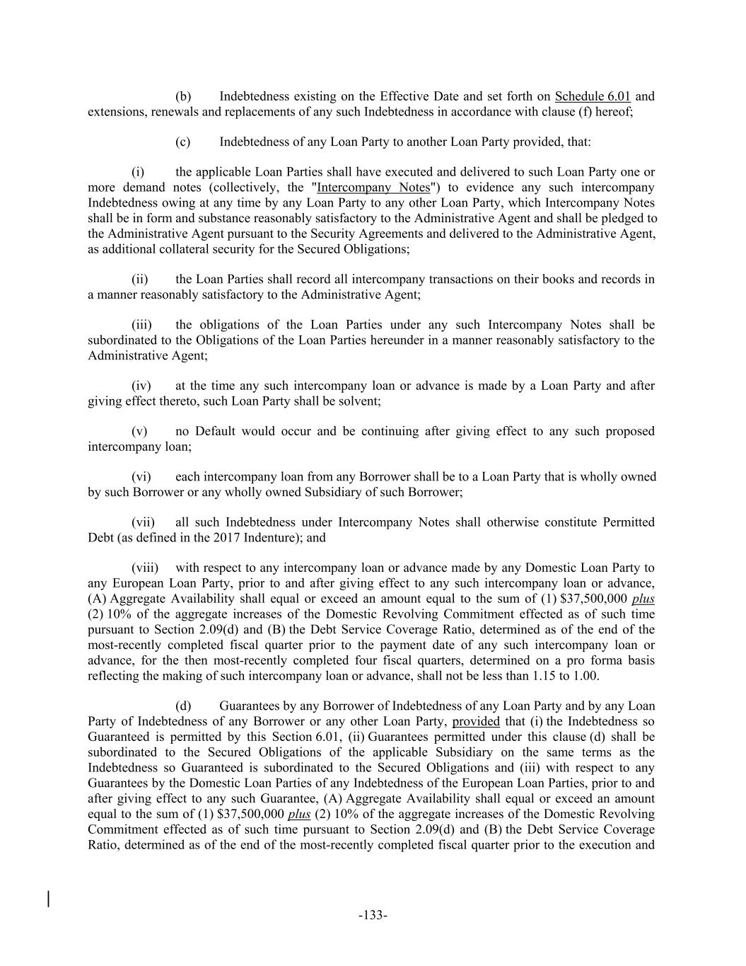 (b) Indebtedness existing on the Effective Date and set forth on Schedule 6.01 and extensions, renewals and replacements of any such Indebtedness in accordance with clause (f) hereof; (c) Indebtedness of any Loan Party to another Loan Party provided, that: (i) the applicable Loan Parties shall have executed and delivered to such Loan Party one or more demand notes (collectively, the "Intercompany Notes") to evidence any such intercompany Indebtedness owing at any time by any Loan Party to any other Loan Party, which Intercompany Notes shall be in form and substance reasonably satisfactory to the Administrative Agent and shall be pledged to the Administrative Agent pursuant to the Security Agreements and delivered to the Administrative Agent, as additional collateral security for the Secured Obligations; (ii) the Loan Parties shall record all intercompany transactions on their books and records in a manner reasonably satisfactory to the Administrative Agent; (iii) the obligations of the Loan Parties under any such Intercompany Notes shall be subordinated to the Obligations of the Loan Parties hereunder in a manner reasonably satisfactory to the Administrative Agent; (iv) at the time any such intercompany loan or advance is made by a Loan Party and after giving effect thereto, such Loan Party shall be solvent; (v) no Default would occur and be continuing after giving effect to any such proposed intercompany loan; (vi) each intercompany loan from any Borrower shall be to a Loan Party that is wholly owned by such Borrower or any wholly owned Subsidiary of such Borrower; (vii) all such Indebtedness under Intercompany Notes shall otherwise constitute Permitted Debt (as defined in the 2017 Indenture); and (viii) with respect to any intercompany loan or advance made by any Domestic Loan Party to any European Loan Party, prior to and after giving effect to any such intercompany loan or advance, (A) Aggregate Availability shall equal or exceed an amount equal to the sum of (1) $37,500,000 plus (2) 10% of the aggregate increases of the Domestic Revolving Commitment effected as of such time pursuant to Section 2.09(d) and (B) the Debt Service Coverage Ratio, determined as of the end of the most-recently completed fiscal quarter prior to the payment date of any such intercompany loan or advance, for the then most-recently completed four fiscal quarters, determined on a pro forma basis reflecting the making of such intercompany loan or advance, shall not be less than 1.15 to 1.00. (d) Guarantees by any Borrower of Indebtedness of any Loan Party and by any Loan Party of Indebtedness of any Borrower or any other Loan Party, provided that (i) the Indebtedness so Guaranteed is permitted by this Section 6.01, (ii) Guarantees permitted under this clause (d) shall be subordinated to the Secured Obligations of the applicable Subsidiary on the same terms as the Indebtedness so Guaranteed is subordinated to the Secured Obligations and (iii) with respect to any Guarantees by the Domestic Loan Parties of any Indebtedness of the European Loan Parties, prior to and after giving effect to any such Guarantee, (A) Aggregate Availability shall equal or exceed an amount equal to the sum of (1) $37,500,000 plus (2) 10% of the aggregate increases of the Domestic Revolving Commitment effected as of such time pursuant to Section 2.09(d) and (B) the Debt Service Coverage Ratio, determined as of the end of the most-recently completed fiscal quarter prior to the execution and -133-