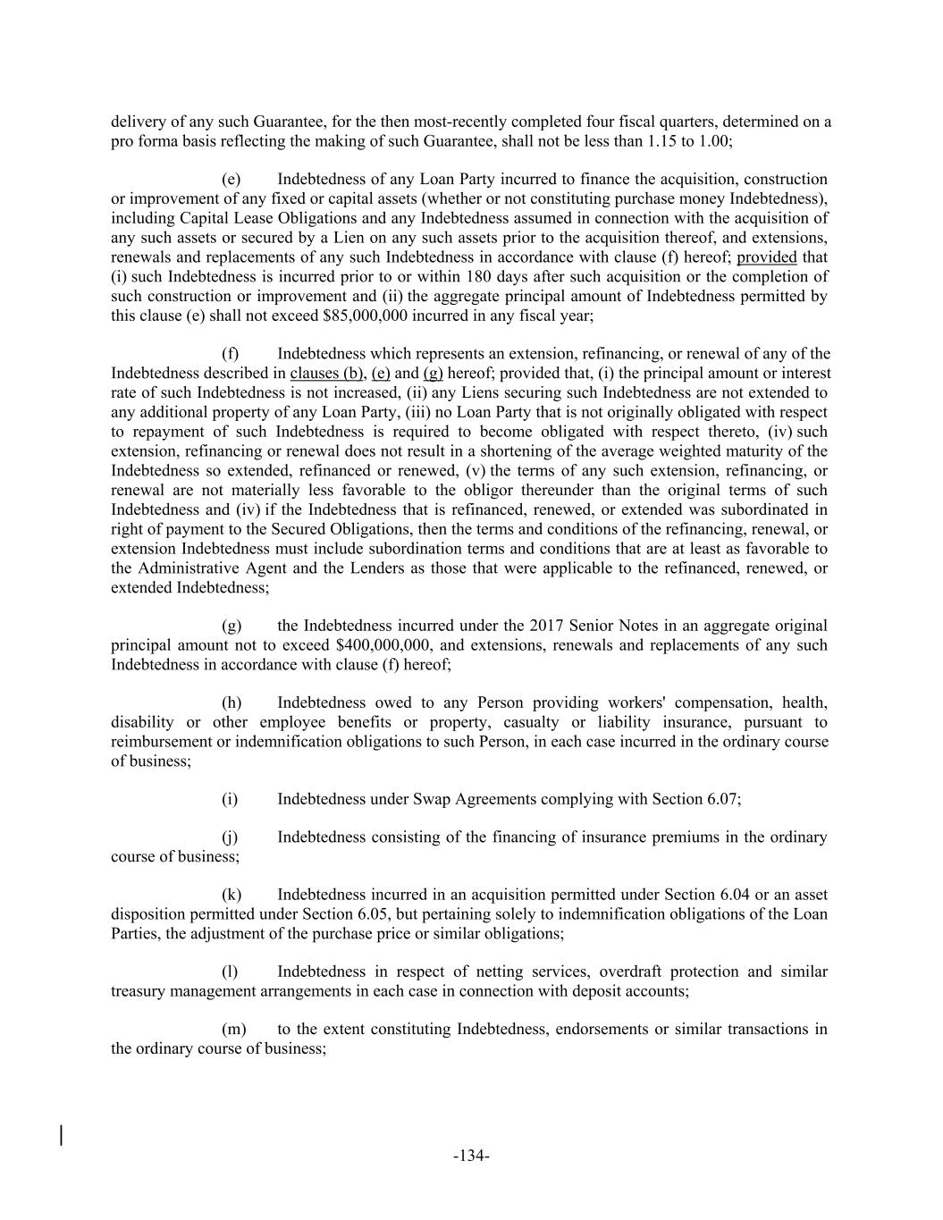 delivery of any such Guarantee, for the then most-recently completed four fiscal quarters, determined on a pro forma basis reflecting the making of such Guarantee, shall not be less than 1.15 to 1.00; (e) Indebtedness of any Loan Party incurred to finance the acquisition, construction or improvement of any fixed or capital assets (whether or not constituting purchase money Indebtedness), including Capital Lease Obligations and any Indebtedness assumed in connection with the acquisition of any such assets or secured by a Lien on any such assets prior to the acquisition thereof, and extensions, renewals and replacements of any such Indebtedness in accordance with clause (f) hereof; provided that (i) such Indebtedness is incurred prior to or within 180 days after such acquisition or the completion of such construction or improvement and (ii) the aggregate principal amount of Indebtedness permitted by this clause (e) shall not exceed $85,000,000 incurred in any fiscal year; (f) Indebtedness which represents an extension, refinancing, or renewal of any of the Indebtedness described in clauses (b), (e) and (g) hereof; provided that, (i) the principal amount or interest rate of such Indebtedness is not increased, (ii) any Liens securing such Indebtedness are not extended to any additional property of any Loan Party, (iii) no Loan Party that is not originally obligated with respect to repayment of such Indebtedness is required to become obligated with respect thereto, (iv) such extension, refinancing or renewal does not result in a shortening of the average weighted maturity of the Indebtedness so extended, refinanced or renewed, (v) the terms of any such extension, refinancing, or renewal are not materially less favorable to the obligor thereunder than the original terms of such Indebtedness and (iv) if the Indebtedness that is refinanced, renewed, or extended was subordinated in right of payment to the Secured Obligations, then the terms and conditions of the refinancing, renewal, or extension Indebtedness must include subordination terms and conditions that are at least as favorable to the Administrative Agent and the Lenders as those that were applicable to the refinanced, renewed, or extended Indebtedness; (g) the Indebtedness incurred under the 2017 Senior Notes in an aggregate original principal amount not to exceed $400,000,000, and extensions, renewals and replacements of any such Indebtedness in accordance with clause (f) hereof; (h) Indebtedness owed to any Person providing workers' compensation, health, disability or other employee benefits or property, casualty or liability insurance, pursuant to reimbursement or indemnification obligations to such Person, in each case incurred in the ordinary course of business; (i) Indebtedness under Swap Agreements complying with Section 6.07; (j) Indebtedness consisting of the financing of insurance premiums in the ordinary course of business; (k) Indebtedness incurred in an acquisition permitted under Section 6.04 or an asset disposition permitted under Section 6.05, but pertaining solely to indemnification obligations of the Loan Parties, the adjustment of the purchase price or similar obligations; (l) Indebtedness in respect of netting services, overdraft protection and similar treasury management arrangements in each case in connection with deposit accounts; (m) to the extent constituting Indebtedness, endorsements or similar transactions in the ordinary course of business; -134-