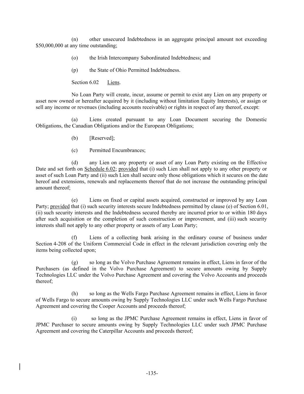 (n) other unsecured Indebtedness in an aggregate principal amount not exceeding $50,000,000 at any time outstanding; (o) the Irish Intercompany Subordinated Indebtedness; and (p) the State of Ohio Permitted Indebtedness. Section 6.02 Liens. No Loan Party will create, incur, assume or permit to exist any Lien on any property or asset now owned or hereafter acquired by it (including without limitation Equity Interests), or assign or sell any income or revenues (including accounts receivable) or rights in respect of any thereof, except: (a) Liens created pursuant to any Loan Document securing the Domestic Obligations, the Canadian Obligations and/or the European Obligations; (b) [Reserved]; (c) Permitted Encumbrances; (d) any Lien on any property or asset of any Loan Party existing on the Effective Date and set forth on Schedule 6.02; provided that (i) such Lien shall not apply to any other property or asset of such Loan Party and (ii) such Lien shall secure only those obligations which it secures on the date hereof and extensions, renewals and replacements thereof that do not increase the outstanding principal amount thereof; (e) Liens on fixed or capital assets acquired, constructed or improved by any Loan Party; provided that (i) such security interests secure Indebtedness permitted by clause (e) of Section 6.01, (ii) such security interests and the Indebtedness secured thereby are incurred prior to or within 180 days after such acquisition or the completion of such construction or improvement, and (iii) such security interests shall not apply to any other property or assets of any Loan Party; (f) Liens of a collecting bank arising in the ordinary course of business under Section 4-208 of the Uniform Commercial Code in effect in the relevant jurisdiction covering only the items being collected upon; (g) so long as the Volvo Purchase Agreement remains in effect, Liens in favor of the Purchasers (as defined in the Volvo Purchase Agreement) to secure amounts owing by Supply Technologies LLC under the Volvo Purchase Agreement and covering the Volvo Accounts and proceeds thereof; (h) so long as the Wells Fargo Purchase Agreement remains in effect, Liens in favor of Wells Fargo to secure amounts owing by Supply Technologies LLC under such Wells Fargo Purchase Agreement and covering the Cooper Accounts and proceeds thereof; (i) so long as the JPMC Purchase Agreement remains in effect, Liens in favor of JPMC Purchaser to secure amounts owing by Supply Technologies LLC under such JPMC Purchase Agreement and covering the Caterpillar Accounts and proceeds thereof; -135-