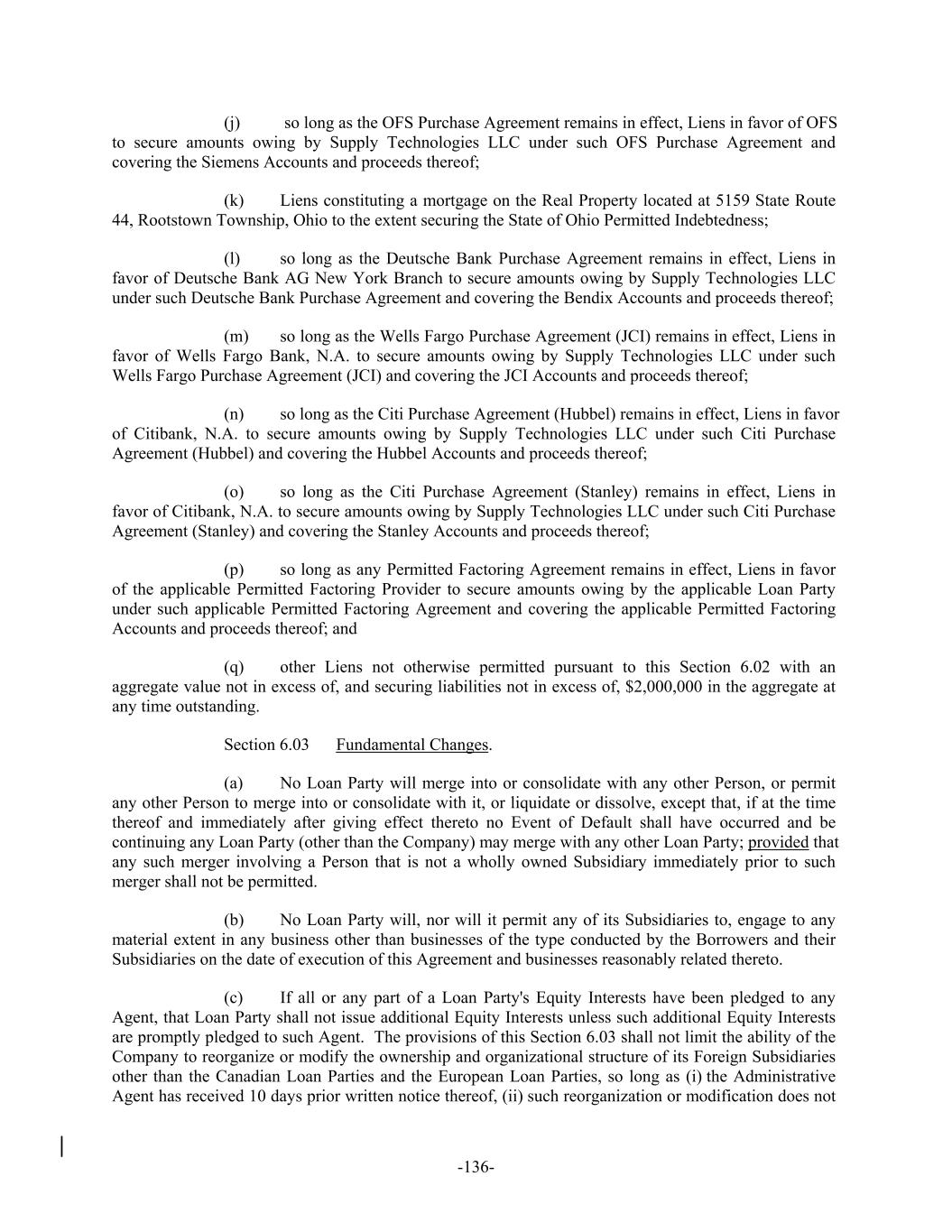 (j) so long as the OFS Purchase Agreement remains in effect, Liens in favor of OFS to secure amounts owing by Supply Technologies LLC under such OFS Purchase Agreement and covering the Siemens Accounts and proceeds thereof; (k) Liens constituting a mortgage on the Real Property located at 5159 State Route 44, Rootstown Township, Ohio to the extent securing the State of Ohio Permitted Indebtedness; (l) so long as the Deutsche Bank Purchase Agreement remains in effect, Liens in favor of Deutsche Bank AG New York Branch to secure amounts owing by Supply Technologies LLC under such Deutsche Bank Purchase Agreement and covering the Bendix Accounts and proceeds thereof; (m) so long as the Wells Fargo Purchase Agreement (JCI) remains in effect, Liens in favor of Wells Fargo Bank, N.A. to secure amounts owing by Supply Technologies LLC under such Wells Fargo Purchase Agreement (JCI) and covering the JCI Accounts and proceeds thereof; (n) so long as the Citi Purchase Agreement (Hubbel) remains in effect, Liens in favor of Citibank, N.A. to secure amounts owing by Supply Technologies LLC under such Citi Purchase Agreement (Hubbel) and covering the Hubbel Accounts and proceeds thereof; (o) so long as the Citi Purchase Agreement (Stanley) remains in effect, Liens in favor of Citibank, N.A. to secure amounts owing by Supply Technologies LLC under such Citi Purchase Agreement (Stanley) and covering the Stanley Accounts and proceeds thereof; (p) so long as any Permitted Factoring Agreement remains in effect, Liens in favor of the applicable Permitted Factoring Provider to secure amounts owing by the applicable Loan Party under such applicable Permitted Factoring Agreement and covering the applicable Permitted Factoring Accounts and proceeds thereof; and (q) other Liens not otherwise permitted pursuant to this Section 6.02 with an aggregate value not in excess of, and securing liabilities not in excess of, $2,000,000 in the aggregate at any time outstanding. Section 6.03 Fundamental Changes. (a) No Loan Party will merge into or consolidate with any other Person, or permit any other Person to merge into or consolidate with it, or liquidate or dissolve, except that, if at the time thereof and immediately after giving effect thereto no Event of Default shall have occurred and be continuing any Loan Party (other than the Company) may merge with any other Loan Party; provided that any such merger involving a Person that is not a wholly owned Subsidiary immediately prior to such merger shall not be permitted. (b) No Loan Party will, nor will it permit any of its Subsidiaries to, engage to any material extent in any business other than businesses of the type conducted by the Borrowers and their Subsidiaries on the date of execution of this Agreement and businesses reasonably related thereto. (c) If all or any part of a Loan Party's Equity Interests have been pledged to any Agent, that Loan Party shall not issue additional Equity Interests unless such additional Equity Interests are promptly pledged to such Agent. The provisions of this Section 6.03 shall not limit the ability of the Company to reorganize or modify the ownership and organizational structure of its Foreign Subsidiaries other than the Canadian Loan Parties and the European Loan Parties, so long as (i) the Administrative Agent has received 10 days prior written notice thereof, (ii) such reorganization or modification does not -136-