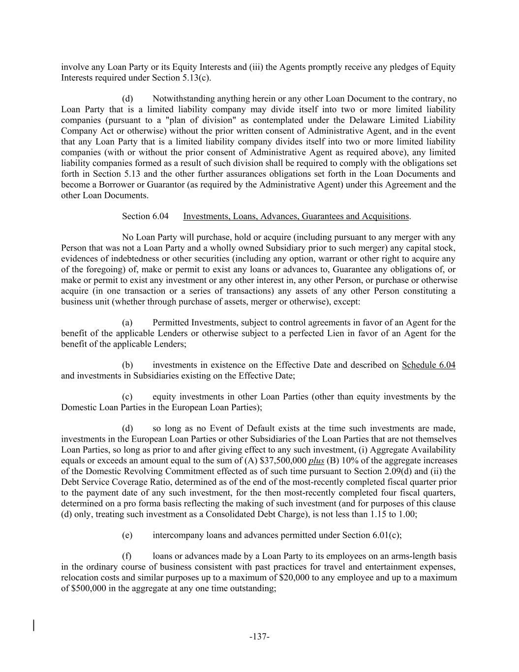 involve any Loan Party or its Equity Interests and (iii) the Agents promptly receive any pledges of Equity Interests required under Section 5.13(c). (d) Notwithstanding anything herein or any other Loan Document to the contrary, no Loan Party that is a limited liability company may divide itself into two or more limited liability companies (pursuant to a "plan of division" as contemplated under the Delaware Limited Liability Company Act or otherwise) without the prior written consent of Administrative Agent, and in the event that any Loan Party that is a limited liability company divides itself into two or more limited liability companies (with or without the prior consent of Administrative Agent as required above), any limited liability companies formed as a result of such division shall be required to comply with the obligations set forth in Section 5.13 and the other further assurances obligations set forth in the Loan Documents and become a Borrower or Guarantor (as required by the Administrative Agent) under this Agreement and the other Loan Documents. Section 6.04 Investments, Loans, Advances, Guarantees and Acquisitions. No Loan Party will purchase, hold or acquire (including pursuant to any merger with any Person that was not a Loan Party and a wholly owned Subsidiary prior to such merger) any capital stock, evidences of indebtedness or other securities (including any option, warrant or other right to acquire any of the foregoing) of, make or permit to exist any loans or advances to, Guarantee any obligations of, or make or permit to exist any investment or any other interest in, any other Person, or purchase or otherwise acquire (in one transaction or a series of transactions) any assets of any other Person constituting a business unit (whether through purchase of assets, merger or otherwise), except: (a) Permitted Investments, subject to control agreements in favor of an Agent for the benefit of the applicable Lenders or otherwise subject to a perfected Lien in favor of an Agent for the benefit of the applicable Lenders; (b) investments in existence on the Effective Date and described on Schedule 6.04 and investments in Subsidiaries existing on the Effective Date; (c) equity investments in other Loan Parties (other than equity investments by the Domestic Loan Parties in the European Loan Parties); (d) so long as no Event of Default exists at the time such investments are made, investments in the European Loan Parties or other Subsidiaries of the Loan Parties that are not themselves Loan Parties, so long as prior to and after giving effect to any such investment, (i) Aggregate Availability equals or exceeds an amount equal to the sum of (A) $37,500,000 plus (B) 10% of the aggregate increases of the Domestic Revolving Commitment effected as of such time pursuant to Section 2.09(d) and (ii) the Debt Service Coverage Ratio, determined as of the end of the most-recently completed fiscal quarter prior to the payment date of any such investment, for the then most-recently completed four fiscal quarters, determined on a pro forma basis reflecting the making of such investment (and for purposes of this clause (d) only, treating such investment as a Consolidated Debt Charge), is not less than 1.15 to 1.00; (e) intercompany loans and advances permitted under Section 6.01(c); (f) loans or advances made by a Loan Party to its employees on an arms-length basis in the ordinary course of business consistent with past practices for travel and entertainment expenses, relocation costs and similar purposes up to a maximum of $20,000 to any employee and up to a maximum of $500,000 in the aggregate at any one time outstanding; -137-