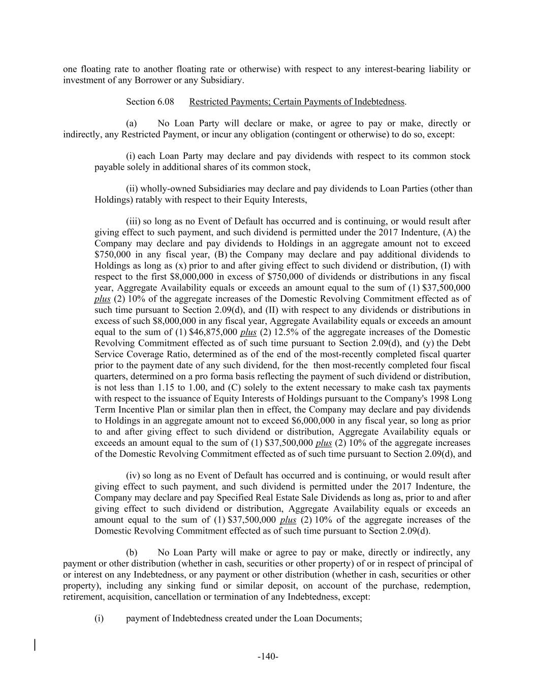 one floating rate to another floating rate or otherwise) with respect to any interest-bearing liability or investment of any Borrower or any Subsidiary. Section 6.08 Restricted Payments; Certain Payments of Indebtedness. (a) No Loan Party will declare or make, or agree to pay or make, directly or indirectly, any Restricted Payment, or incur any obligation (contingent or otherwise) to do so, except: (i) each Loan Party may declare and pay dividends with respect to its common stock payable solely in additional shares of its common stock, (ii) wholly-owned Subsidiaries may declare and pay dividends to Loan Parties (other than Holdings) ratably with respect to their Equity Interests, (iii) so long as no Event of Default has occurred and is continuing, or would result after giving effect to such payment, and such dividend is permitted under the 2017 Indenture, (A) the Company may declare and pay dividends to Holdings in an aggregate amount not to exceed $750,000 in any fiscal year, (B) the Company may declare and pay additional dividends to Holdings as long as (x) prior to and after giving effect to such dividend or distribution, (I) with respect to the first $8,000,000 in excess of $750,000 of dividends or distributions in any fiscal year, Aggregate Availability equals or exceeds an amount equal to the sum of (1) $37,500,000 plus (2) 10% of the aggregate increases of the Domestic Revolving Commitment effected as of such time pursuant to Section 2.09(d), and (II) with respect to any dividends or distributions in excess of such $8,000,000 in any fiscal year, Aggregate Availability equals or exceeds an amount equal to the sum of (1) $46,875,000 plus (2) 12.5% of the aggregate increases of the Domestic Revolving Commitment effected as of such time pursuant to Section 2.09(d), and (y) the Debt Service Coverage Ratio, determined as of the end of the most-recently completed fiscal quarter prior to the payment date of any such dividend, for the then most-recently completed four fiscal quarters, determined on a pro forma basis reflecting the payment of such dividend or distribution, is not less than 1.15 to 1.00, and (C) solely to the extent necessary to make cash tax payments with respect to the issuance of Equity Interests of Holdings pursuant to the Company's 1998 Long Term Incentive Plan or similar plan then in effect, the Company may declare and pay dividends to Holdings in an aggregate amount not to exceed $6,000,000 in any fiscal year, so long as prior to and after giving effect to such dividend or distribution, Aggregate Availability equals or exceeds an amount equal to the sum of (1) $37,500,000 plus (2) 10% of the aggregate increases of the Domestic Revolving Commitment effected as of such time pursuant to Section 2.09(d), and (iv) so long as no Event of Default has occurred and is continuing, or would result after giving effect to such payment, and such dividend is permitted under the 2017 Indenture, the Company may declare and pay Specified Real Estate Sale Dividends as long as, prior to and after giving effect to such dividend or distribution, Aggregate Availability equals or exceeds an amount equal to the sum of (1) $37,500,000 plus (2) 10% of the aggregate increases of the Domestic Revolving Commitment effected as of such time pursuant to Section 2.09(d). (b) No Loan Party will make or agree to pay or make, directly or indirectly, any payment or other distribution (whether in cash, securities or other property) of or in respect of principal of or interest on any Indebtedness, or any payment or other distribution (whether in cash, securities or other property), including any sinking fund or similar deposit, on account of the purchase, redemption, retirement, acquisition, cancellation or termination of any Indebtedness, except: (i) payment of Indebtedness created under the Loan Documents; -140-