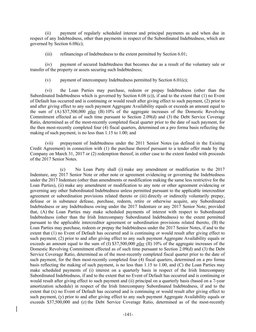 (ii) payment of regularly scheduled interest and principal payments as and when due in respect of any Indebtedness, other than payments in respect of the Subordinated Indebtedness, which are governed by Section 6.08(c); (iii) refinancings of Indebtedness to the extent permitted by Section 6.01; (iv) payment of secured Indebtedness that becomes due as a result of the voluntary sale or transfer of the property or assets securing such Indebtedness; (v) payment of intercompany Indebtedness permitted by Section 6.01(c); (vi) the Loan Parties may purchase, redeem or prepay Indebtedness (other than the Subordinated Indebtedness which is governed by Section 6.08 (c)), if and to the extent that (1) no Event of Default has occurred and is continuing or would result after giving effect to such payment, (2) prior to and after giving effect to any such payment Aggregate Availability equals or exceeds an amount equal to the sum of (A) $37,500,000 plus (B) 10% of the aggregate increases of the Domestic Revolving Commitment effected as of such time pursuant to Section 2.09(d) and (3) the Debt Service Coverage Ratio, determined as of the most-recently completed fiscal quarter prior to the date of such payment, for the then most-recently completed four (4) fiscal quarters, determined on a pro forma basis reflecting the making of such payment, is no less than 1.15 to 1.00; and (vii) prepayment of Indebtedness under the 2011 Senior Notes (as defined in the Existing Credit Agreement) in connection with (1) the purchase thereof pursuant to a tender offer made by the Company on March 31, 2017 or (2) redemption thereof, in either case to the extent funded with proceeds of the 2017 Senior Notes. (c) No Loan Party shall (i) make any amendment or modification to the 2017 Indenture, any 2017 Senior Note or other note or agreement evidencing or governing the Indebtedness under the 2017 Indenture (other than amendments or modification making the same less restrictive for the Loan Parties), (ii) make any amendment or modification to any note or other agreement evidencing or governing any other Subordinated Indebtedness unless permitted pursuant to the applicable intercreditor agreement or subordination provisions related thereto or (iii) directly or indirectly voluntarily prepay, defease or in substance defease, purchase, redeem, retire or otherwise acquire, any Subordinated Indebtedness or any Indebtedness owing under the 2017 Indenture or any 2017 Senior Note; provided that, (A) the Loan Parties may make scheduled payments of interest with respect to Subordinated Indebtedness (other than the Irish Intercompany Subordinated Indebtedness) to the extent permitted pursuant to the applicable intercreditor agreement or subordination provisions related thereto, (B) the Loan Parties may purchase, redeem or prepay the Indebtedness under the 2017 Senior Notes, if and to the extent that (1) no Event of Default has occurred and is continuing or would result after giving effect to such payment, (2) prior to and after giving effect to any such payment Aggregate Availability equals or exceeds an amount equal to the sum of (I) $37,500,000 plus (II) 10% of the aggregate increases of the Domestic Revolving Commitment effected as of such time pursuant to Section 2.09(d) and (3) the Debt Service Coverage Ratio, determined as of the most-recently completed fiscal quarter prior to the date of such payment, for the then most-recently completed four (4) fiscal quarters, determined on a pro forma basis reflecting the making of such payment, is no less than 1.15 to 1.00, and (C) the Loan Parties may make scheduled payments of (i) interest on a quarterly basis in respect of the Irish Intercompany Subordinated Indebtedness, if and to the extent that no Event of Default has occurred and is continuing or would result after giving effect to such payment and (ii) principal on a quarterly basis (based on a 7-year amortization schedule) in respect of the Irish Intercompany Subordinated Indebtedness, if and to the extent that (x) no Event of Default has occurred and is continuing or would result after giving effect to such payment, (y) prior to and after giving effect to any such payment Aggregate Availability equals or exceeds $37,500,000 and (z) the Debt Service Coverage Ratio, determined as of the most-recently -141-