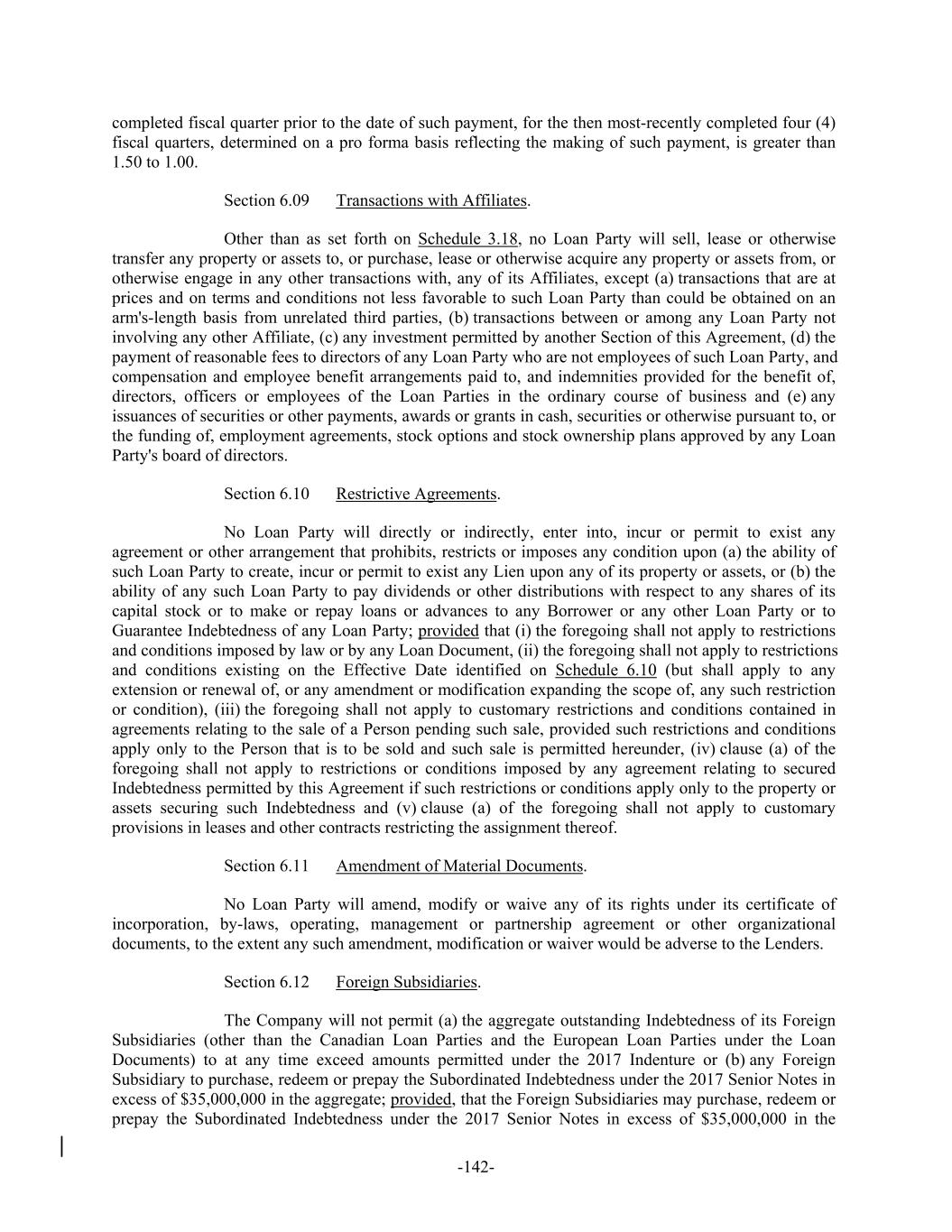 completed fiscal quarter prior to the date of such payment, for the then most-recently completed four (4) fiscal quarters, determined on a pro forma basis reflecting the making of such payment, is greater than 1.50 to 1.00. Section 6.09 Transactions with Affiliates. Other than as set forth on Schedule 3.18, no Loan Party will sell, lease or otherwise transfer any property or assets to, or purchase, lease or otherwise acquire any property or assets from, or otherwise engage in any other transactions with, any of its Affiliates, except (a) transactions that are at prices and on terms and conditions not less favorable to such Loan Party than could be obtained on an arm's-length basis from unrelated third parties, (b) transactions between or among any Loan Party not involving any other Affiliate, (c) any investment permitted by another Section of this Agreement, (d) the payment of reasonable fees to directors of any Loan Party who are not employees of such Loan Party, and compensation and employee benefit arrangements paid to, and indemnities provided for the benefit of, directors, officers or employees of the Loan Parties in the ordinary course of business and (e) any issuances of securities or other payments, awards or grants in cash, securities or otherwise pursuant to, or the funding of, employment agreements, stock options and stock ownership plans approved by any Loan Party's board of directors. Section 6.10 Restrictive Agreements. No Loan Party will directly or indirectly, enter into, incur or permit to exist any agreement or other arrangement that prohibits, restricts or imposes any condition upon (a) the ability of such Loan Party to create, incur or permit to exist any Lien upon any of its property or assets, or (b) the ability of any such Loan Party to pay dividends or other distributions with respect to any shares of its capital stock or to make or repay loans or advances to any Borrower or any other Loan Party or to Guarantee Indebtedness of any Loan Party; provided that (i) the foregoing shall not apply to restrictions and conditions imposed by law or by any Loan Document, (ii) the foregoing shall not apply to restrictions and conditions existing on the Effective Date identified on Schedule 6.10 (but shall apply to any extension or renewal of, or any amendment or modification expanding the scope of, any such restriction or condition), (iii) the foregoing shall not apply to customary restrictions and conditions contained in agreements relating to the sale of a Person pending such sale, provided such restrictions and conditions apply only to the Person that is to be sold and such sale is permitted hereunder, (iv) clause (a) of the foregoing shall not apply to restrictions or conditions imposed by any agreement relating to secured Indebtedness permitted by this Agreement if such restrictions or conditions apply only to the property or assets securing such Indebtedness and (v) clause (a) of the foregoing shall not apply to customary provisions in leases and other contracts restricting the assignment thereof. Section 6.11 Amendment of Material Documents. No Loan Party will amend, modify or waive any of its rights under its certificate of incorporation, by-laws, operating, management or partnership agreement or other organizational documents, to the extent any such amendment, modification or waiver would be adverse to the Lenders. Section 6.12 Foreign Subsidiaries. The Company will not permit (a) the aggregate outstanding Indebtedness of its Foreign Subsidiaries (other than the Canadian Loan Parties and the European Loan Parties under the Loan Documents) to at any time exceed amounts permitted under the 2017 Indenture or (b) any Foreign Subsidiary to purchase, redeem or prepay the Subordinated Indebtedness under the 2017 Senior Notes in excess of $35,000,000 in the aggregate; provided, that the Foreign Subsidiaries may purchase, redeem or prepay the Subordinated Indebtedness under the 2017 Senior Notes in excess of $35,000,000 in the -142-