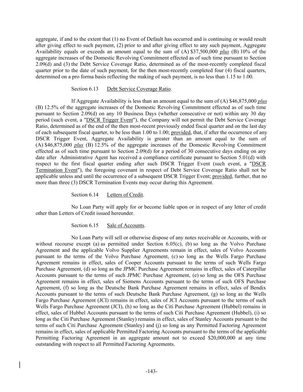 aggregate, if and to the extent that (1) no Event of Default has occurred and is continuing or would result after giving effect to such payment, (2) prior to and after giving effect to any such payment, Aggregate Availability equals or exceeds an amount equal to the sum of (A) $37,500,000 plus (B) 10% of the aggregate increases of the Domestic Revolving Commitment effected as of such time pursuant to Section 2.09(d) and (3) the Debt Service Coverage Ratio, determined as of the most-recently completed fiscal quarter prior to the date of such payment, for the then most-recently completed four (4) fiscal quarters, determined on a pro forma basis reflecting the making of such payment, is no less than 1.15 to 1.00. Section 6.13 Debt Service Coverage Ratio. If Aggregate Availability is less than an amount equal to the sum of (A) $46,875,000 plus (B) 12.5% of the aggregate increases of the Domestic Revolving Commitment effected as of such time pursuant to Section 2.09(d) on any 10 Business Days (whether consecutive or not) within any 30 day period (such event, a "DSCR Trigger Event"), the Company will not permit the Debt Service Coverage Ratio, determined as of the end of the then most-recent previously ended fiscal quarter and on the last day of each subsequent fiscal quarter, to be less than 1.00 to 1.00; provided, that, if after the occurrence of any DSCR Trigger Event, Aggregate Availability is greater than an amount equal to the sum of (A) $46,875,000 plus (B) 12.5% of the aggregate increases of the Domestic Revolving Commitment effected as of such time pursuant to Section 2.09(d) for a period of 30 consecutive days ending on any date after Administrative Agent has received a compliance certificate pursuant to Section 5.01(d) with respect to the first fiscal quarter ending after such DSCR Trigger Event (such event, a "DSCR Termination Event"), the foregoing covenant in respect of Debt Service Coverage Ratio shall not be applicable unless and until the occurrence of a subsequent DSCR Trigger Event; provided, further, that no more than three (3) DSCR Termination Events may occur during this Agreement. Section 6.14 Letters of Credit. No Loan Party will apply for or become liable upon or in respect of any letter of credit other than Letters of Credit issued hereunder. Section 6.15 Sale of Accounts. No Loan Party will sell or otherwise dispose of any notes receivable or Accounts, with or without recourse except (a) as permitted under Section 6.05(c), (b) so long as the Volvo Purchase Agreement and the applicable Volvo Supplier Agreements remain in effect, sales of Volvo Accounts pursuant to the terms of the Volvo Purchase Agreement, (c) so long as the Wells Fargo Purchase Agreement remains in effect, sales of Cooper Accounts pursuant to the terms of such Wells Fargo Purchase Agreement, (d) so long as the JPMC Purchase Agreement remains in effect, sales of Caterpillar Accounts pursuant to the terms of such JPMC Purchase Agreement, (e) so long as the OFS Purchase Agreement remains in effect, sales of Siemens Accounts pursuant to the terms of such OFS Purchase Agreement, (f) so long as the Deutsche Bank Purchase Agreement remains in effect, sales of Bendix Accounts pursuant to the terms of such Deutsche Bank Purchase Agreement, (g) so long as the Wells Fargo Purchase Agreement (JCI) remains in effect, sales of JCI Accounts pursuant to the terms of such Wells Fargo Purchase Agreement (JCI), (h) so long as the Citi Purchase Agreement (Hubbel) remains in effect, sales of Hubbel Accounts pursuant to the terms of such Citi Purchase Agreement (Hubbel), (i) so long as the Citi Purchase Agreement (Stanley) remains in effect, sales of Stanley Accounts pursuant to the terms of such Citi Purchase Agreement (Stanley) and (j) so long as any Permitted Factoring Agreement remains in effect, sales of applicable Permitted Factoring Accounts pursuant to the terms of the applicable Permitting Factoring Agreement in an aggregate amount not to exceed $20,000,000 at any time outstanding with respect to all Permitted Factoring Agreements. -143-