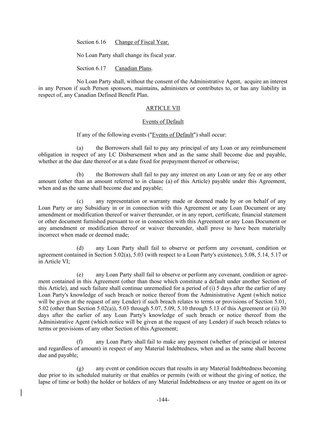 Section 6.16 Change of Fiscal Year. No Loan Party shall change its fiscal year. Section 6.17 Canadian Plans. No Loan Party shall, without the consent of the Administrative Agent, acquire an interest in any Person if such Person sponsors, maintains, administers or contributes to, or has any liability in respect of, any Canadian Defined Benefit Plan. ARTICLE VII Events of Default If any of the following events ("Events of Default") shall occur: (a) the Borrowers shall fail to pay any principal of any Loan or any reimbursement obligation in respect of any LC Disbursement when and as the same shall become due and payable, whether at the due date thereof or at a date fixed for prepayment thereof or otherwise; (b) the Borrowers shall fail to pay any interest on any Loan or any fee or any other amount (other than an amount referred to in clause (a) of this Article) payable under this Agreement, when and as the same shall become due and payable; (c) any representation or warranty made or deemed made by or on behalf of any Loan Party or any Subsidiary in or in connection with this Agreement or any Loan Document or any amendment or modification thereof or waiver thereunder, or in any report, certificate, financial statement or other document furnished pursuant to or in connection with this Agreement or any Loan Document or any amendment or modification thereof or waiver thereunder, shall prove to have been materially incorrect when made or deemed made; (d) any Loan Party shall fail to observe or perform any covenant, condition or agreement contained in Section 5.02(a), 5.03 (with respect to a Loan Party's existence), 5.08, 5.14, 5.17 or in Article VI; (e) any Loan Party shall fail to observe or perform any covenant, condition or agree- ment contained in this Agreement (other than those which constitute a default under another Section of this Article), and such failure shall continue unremedied for a period of (i) 5 days after the earlier of any Loan Party's knowledge of such breach or notice thereof from the Administrative Agent (which notice will be given at the request of any Lender) if such breach relates to terms or provisions of Section 5.01, 5.02 (other than Section 5.02(a)), 5.03 through 5.07, 5.09, 5.10 through 5.13 of this Agreement or (ii) 30 days after the earlier of any Loan Party's knowledge of such breach or notice thereof from the Administrative Agent (which notice will be given at the request of any Lender) if such breach relates to terms or provisions of any other Section of this Agreement; (f) any Loan Party shall fail to make any payment (whether of principal or interest and regardless of amount) in respect of any Material Indebtedness, when and as the same shall become due and payable; (g) any event or condition occurs that results in any Material Indebtedness becoming due prior to its scheduled maturity or that enables or permits (with or without the giving of notice, the lapse of time or both) the holder or holders of any Material Indebtedness or any trustee or agent on its or -144-