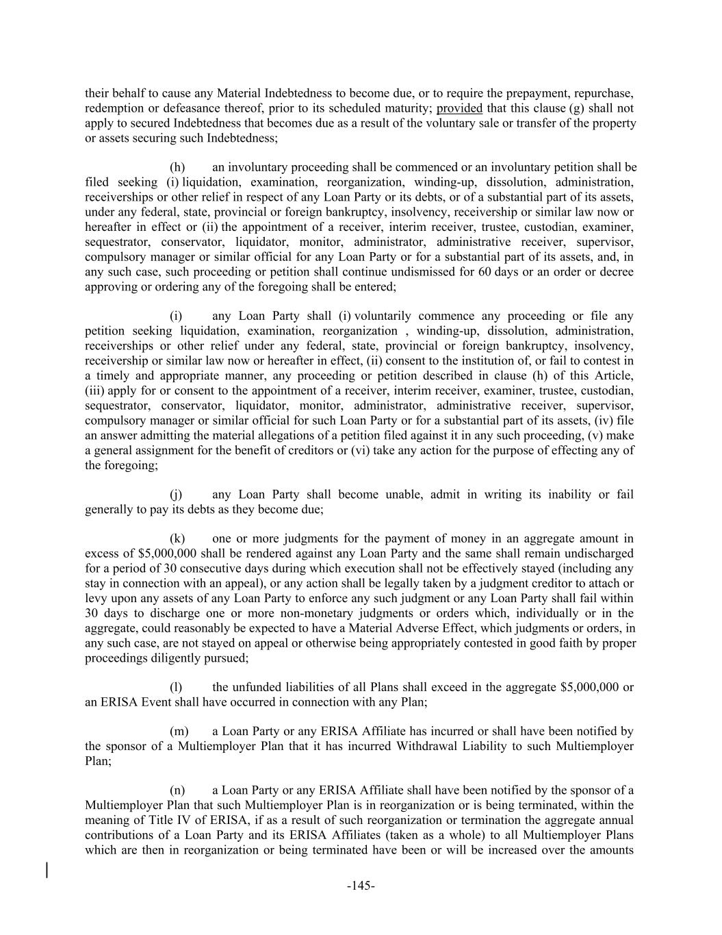 their behalf to cause any Material Indebtedness to become due, or to require the prepayment, repurchase, redemption or defeasance thereof, prior to its scheduled maturity; provided that this clause (g) shall not apply to secured Indebtedness that becomes due as a result of the voluntary sale or transfer of the property or assets securing such Indebtedness; (h) an involuntary proceeding shall be commenced or an involuntary petition shall be filed seeking (i) liquidation, examination, reorganization, winding-up, dissolution, administration, receiverships or other relief in respect of any Loan Party or its debts, or of a substantial part of its assets, under any federal, state, provincial or foreign bankruptcy, insolvency, receivership or similar law now or hereafter in effect or (ii) the appointment of a receiver, interim receiver, trustee, custodian, examiner, sequestrator, conservator, liquidator, monitor, administrator, administrative receiver, supervisor, compulsory manager or similar official for any Loan Party or for a substantial part of its assets, and, in any such case, such proceeding or petition shall continue undismissed for 60 days or an order or decree approving or ordering any of the foregoing shall be entered; (i) any Loan Party shall (i) voluntarily commence any proceeding or file any petition seeking liquidation, examination, reorganization , winding-up, dissolution, administration, receiverships or other relief under any federal, state, provincial or foreign bankruptcy, insolvency, receivership or similar law now or hereafter in effect, (ii) consent to the institution of, or fail to contest in a timely and appropriate manner, any proceeding or petition described in clause (h) of this Article, (iii) apply for or consent to the appointment of a receiver, interim receiver, examiner, trustee, custodian, sequestrator, conservator, liquidator, monitor, administrator, administrative receiver, supervisor, compulsory manager or similar official for such Loan Party or for a substantial part of its assets, (iv) file an answer admitting the material allegations of a petition filed against it in any such proceeding, (v) make a general assignment for the benefit of creditors or (vi) take any action for the purpose of effecting any of the foregoing; (j) any Loan Party shall become unable, admit in writing its inability or fail generally to pay its debts as they become due; (k) one or more judgments for the payment of money in an aggregate amount in excess of $5,000,000 shall be rendered against any Loan Party and the same shall remain undischarged for a period of 30 consecutive days during which execution shall not be effectively stayed (including any stay in connection with an appeal), or any action shall be legally taken by a judgment creditor to attach or levy upon any assets of any Loan Party to enforce any such judgment or any Loan Party shall fail within 30 days to discharge one or more non-monetary judgments or orders which, individually or in the aggregate, could reasonably be expected to have a Material Adverse Effect, which judgments or orders, in any such case, are not stayed on appeal or otherwise being appropriately contested in good faith by proper proceedings diligently pursued; (l) the unfunded liabilities of all Plans shall exceed in the aggregate $5,000,000 or an ERISA Event shall have occurred in connection with any Plan; (m) a Loan Party or any ERISA Affiliate has incurred or shall have been notified by the sponsor of a Multiemployer Plan that it has incurred Withdrawal Liability to such Multiemployer Plan; (n) a Loan Party or any ERISA Affiliate shall have been notified by the sponsor of a Multiemployer Plan that such Multiemployer Plan is in reorganization or is being terminated, within the meaning of Title IV of ERISA, if as a result of such reorganization or termination the aggregate annual contributions of a Loan Party and its ERISA Affiliates (taken as a whole) to all Multiemployer Plans which are then in reorganization or being terminated have been or will be increased over the amounts -145-