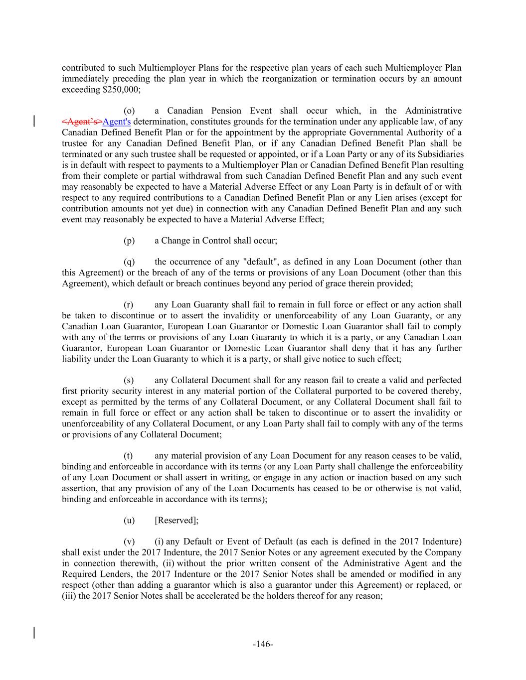 contributed to such Multiemployer Plans for the respective plan years of each such Multiemployer Plan immediately preceding the plan year in which the reorganization or termination occurs by an amount exceeding $250,000; (o) a Canadian Pension Event shall occur which, in the Administrative <Agent’s>Agent's determination, constitutes grounds for the termination under any applicable law, of any Canadian Defined Benefit Plan or for the appointment by the appropriate Governmental Authority of a trustee for any Canadian Defined Benefit Plan, or if any Canadian Defined Benefit Plan shall be terminated or any such trustee shall be requested or appointed, or if a Loan Party or any of its Subsidiaries is in default with respect to payments to a Multiemployer Plan or Canadian Defined Benefit Plan resulting from their complete or partial withdrawal from such Canadian Defined Benefit Plan and any such event may reasonably be expected to have a Material Adverse Effect or any Loan Party is in default of or with respect to any required contributions to a Canadian Defined Benefit Plan or any Lien arises (except for contribution amounts not yet due) in connection with any Canadian Defined Benefit Plan and any such event may reasonably be expected to have a Material Adverse Effect; (p) a Change in Control shall occur; (q) the occurrence of any "default", as defined in any Loan Document (other than this Agreement) or the breach of any of the terms or provisions of any Loan Document (other than this Agreement), which default or breach continues beyond any period of grace therein provided; (r) any Loan Guaranty shall fail to remain in full force or effect or any action shall be taken to discontinue or to assert the invalidity or unenforceability of any Loan Guaranty, or any Canadian Loan Guarantor, European Loan Guarantor or Domestic Loan Guarantor shall fail to comply with any of the terms or provisions of any Loan Guaranty to which it is a party, or any Canadian Loan Guarantor, European Loan Guarantor or Domestic Loan Guarantor shall deny that it has any further liability under the Loan Guaranty to which it is a party, or shall give notice to such effect; (s) any Collateral Document shall for any reason fail to create a valid and perfected first priority security interest in any material portion of the Collateral purported to be covered thereby, except as permitted by the terms of any Collateral Document, or any Collateral Document shall fail to remain in full force or effect or any action shall be taken to discontinue or to assert the invalidity or unenforceability of any Collateral Document, or any Loan Party shall fail to comply with any of the terms or provisions of any Collateral Document; (t) any material provision of any Loan Document for any reason ceases to be valid, binding and enforceable in accordance with its terms (or any Loan Party shall challenge the enforceability of any Loan Document or shall assert in writing, or engage in any action or inaction based on any such assertion, that any provision of any of the Loan Documents has ceased to be or otherwise is not valid, binding and enforceable in accordance with its terms); (u) [Reserved]; (v) (i) any Default or Event of Default (as each is defined in the 2017 Indenture) shall exist under the 2017 Indenture, the 2017 Senior Notes or any agreement executed by the Company in connection therewith, (ii) without the prior written consent of the Administrative Agent and the Required Lenders, the 2017 Indenture or the 2017 Senior Notes shall be amended or modified in any respect (other than adding a guarantor which is also a guarantor under this Agreement) or replaced, or (iii) the 2017 Senior Notes shall be accelerated be the holders thereof for any reason; -146-