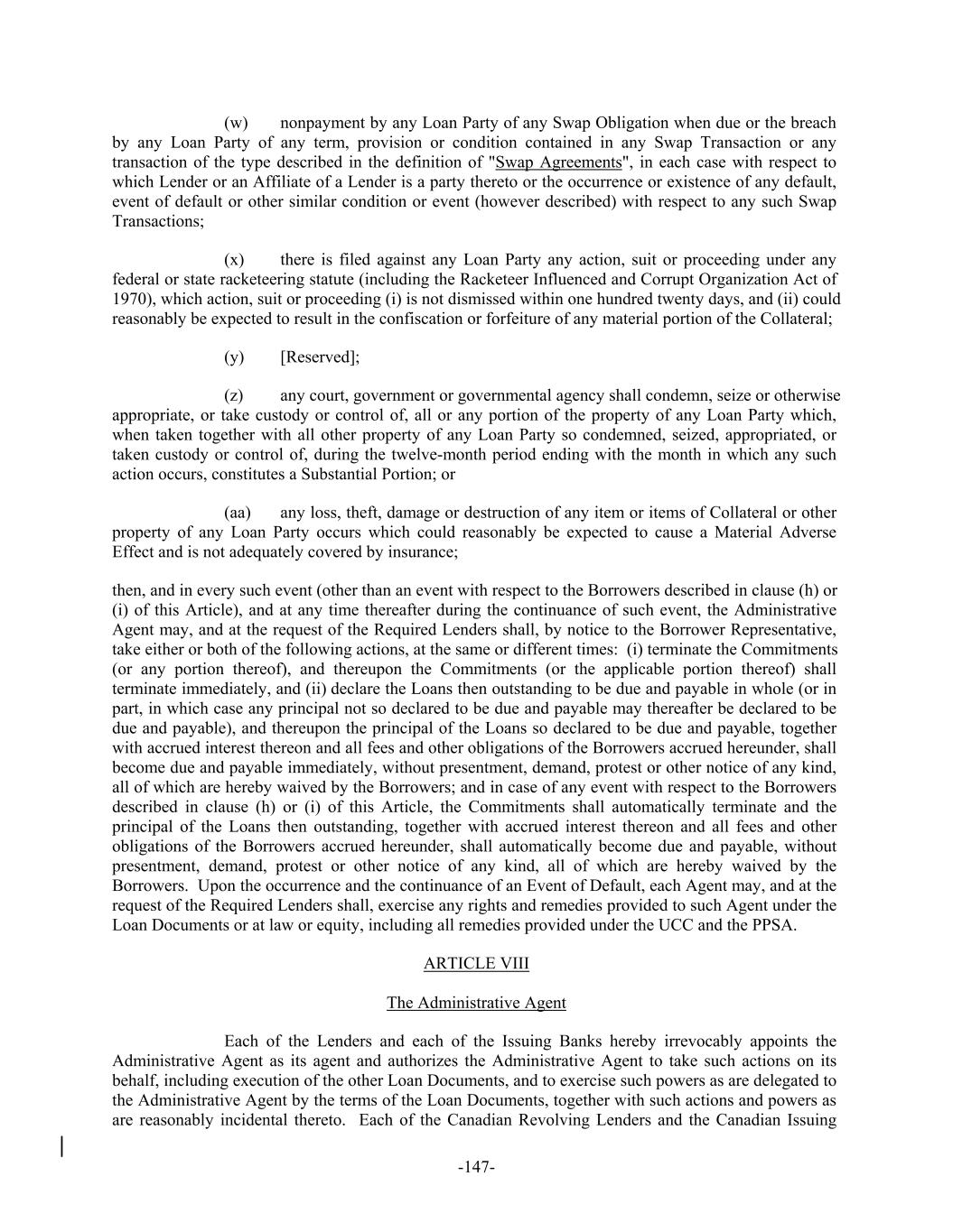 (w) nonpayment by any Loan Party of any Swap Obligation when due or the breach by any Loan Party of any term, provision or condition contained in any Swap Transaction or any transaction of the type described in the definition of "Swap Agreements", in each case with respect to which Lender or an Affiliate of a Lender is a party thereto or the occurrence or existence of any default, event of default or other similar condition or event (however described) with respect to any such Swap Transactions; (x) there is filed against any Loan Party any action, suit or proceeding under any federal or state racketeering statute (including the Racketeer Influenced and Corrupt Organization Act of 1970), which action, suit or proceeding (i) is not dismissed within one hundred twenty days, and (ii) could reasonably be expected to result in the confiscation or forfeiture of any material portion of the Collateral; (y) [Reserved]; (z) any court, government or governmental agency shall condemn, seize or otherwise appropriate, or take custody or control of, all or any portion of the property of any Loan Party which, when taken together with all other property of any Loan Party so condemned, seized, appropriated, or taken custody or control of, during the twelve-month period ending with the month in which any such action occurs, constitutes a Substantial Portion; or (aa) any loss, theft, damage or destruction of any item or items of Collateral or other property of any Loan Party occurs which could reasonably be expected to cause a Material Adverse Effect and is not adequately covered by insurance; then, and in every such event (other than an event with respect to the Borrowers described in clause (h) or (i) of this Article), and at any time thereafter during the continuance of such event, the Administrative Agent may, and at the request of the Required Lenders shall, by notice to the Borrower Representative, take either or both of the following actions, at the same or different times: (i) terminate the Commitments (or any portion thereof), and thereupon the Commitments (or the applicable portion thereof) shall terminate immediately, and (ii) declare the Loans then outstanding to be due and payable in whole (or in part, in which case any principal not so declared to be due and payable may thereafter be declared to be due and payable), and thereupon the principal of the Loans so declared to be due and payable, together with accrued interest thereon and all fees and other obligations of the Borrowers accrued hereunder, shall become due and payable immediately, without presentment, demand, protest or other notice of any kind, all of which are hereby waived by the Borrowers; and in case of any event with respect to the Borrowers described in clause (h) or (i) of this Article, the Commitments shall automatically terminate and the principal of the Loans then outstanding, together with accrued interest thereon and all fees and other obligations of the Borrowers accrued hereunder, shall automatically become due and payable, without presentment, demand, protest or other notice of any kind, all of which are hereby waived by the Borrowers. Upon the occurrence and the continuance of an Event of Default, each Agent may, and at the request of the Required Lenders shall, exercise any rights and remedies provided to such Agent under the Loan Documents or at law or equity, including all remedies provided under the UCC and the PPSA. ARTICLE VIII The Administrative Agent Each of the Lenders and each of the Issuing Banks hereby irrevocably appoints the Administrative Agent as its agent and authorizes the Administrative Agent to take such actions on its behalf, including execution of the other Loan Documents, and to exercise such powers as are delegated to the Administrative Agent by the terms of the Loan Documents, together with such actions and powers as are reasonably incidental thereto. Each of the Canadian Revolving Lenders and the Canadian Issuing -147-